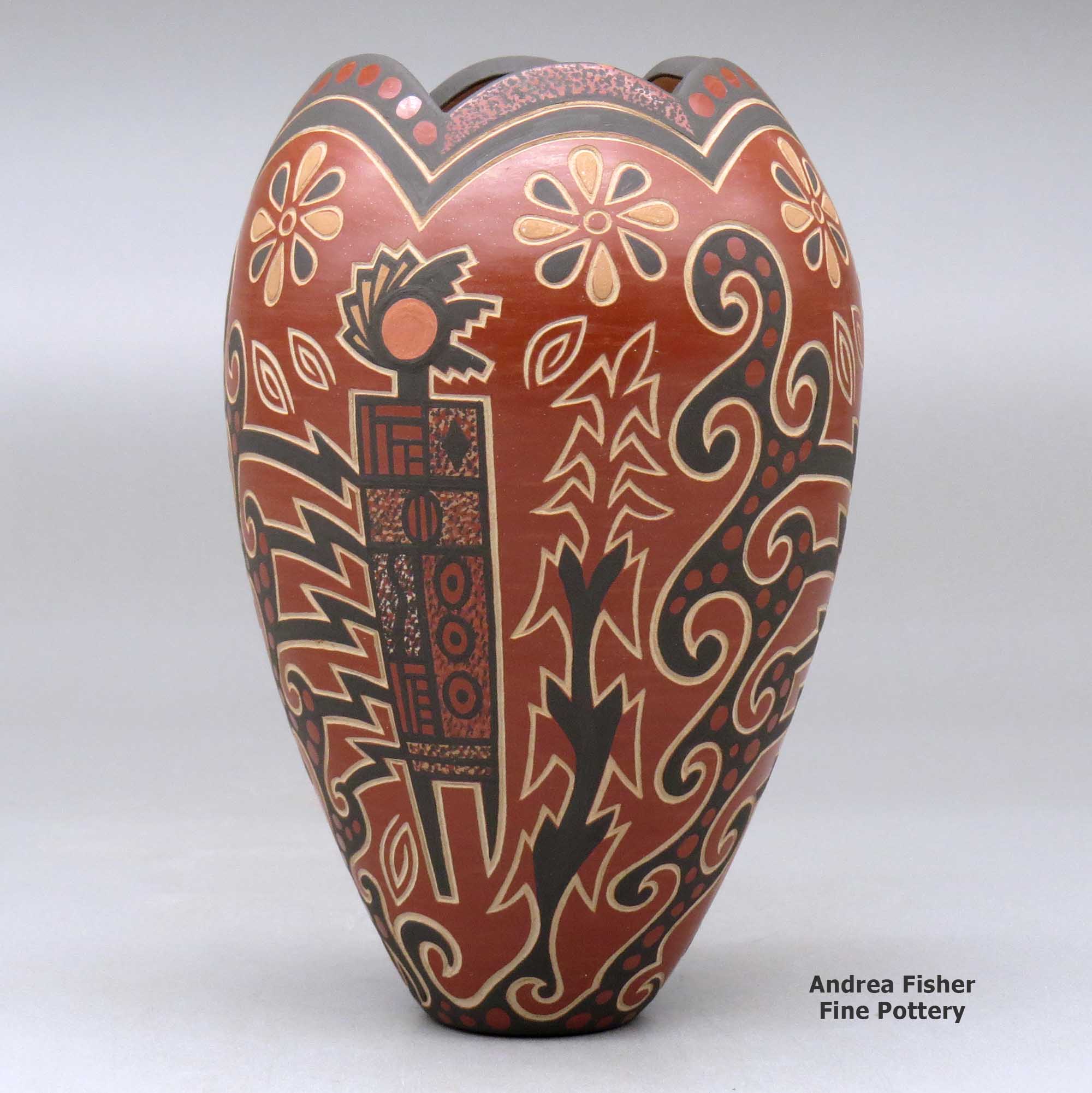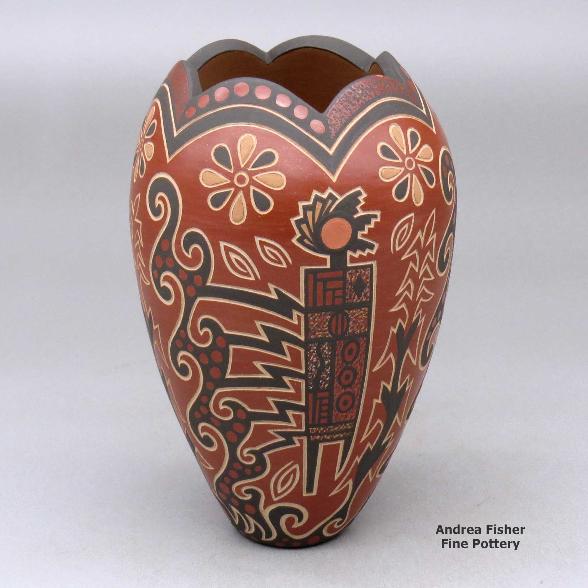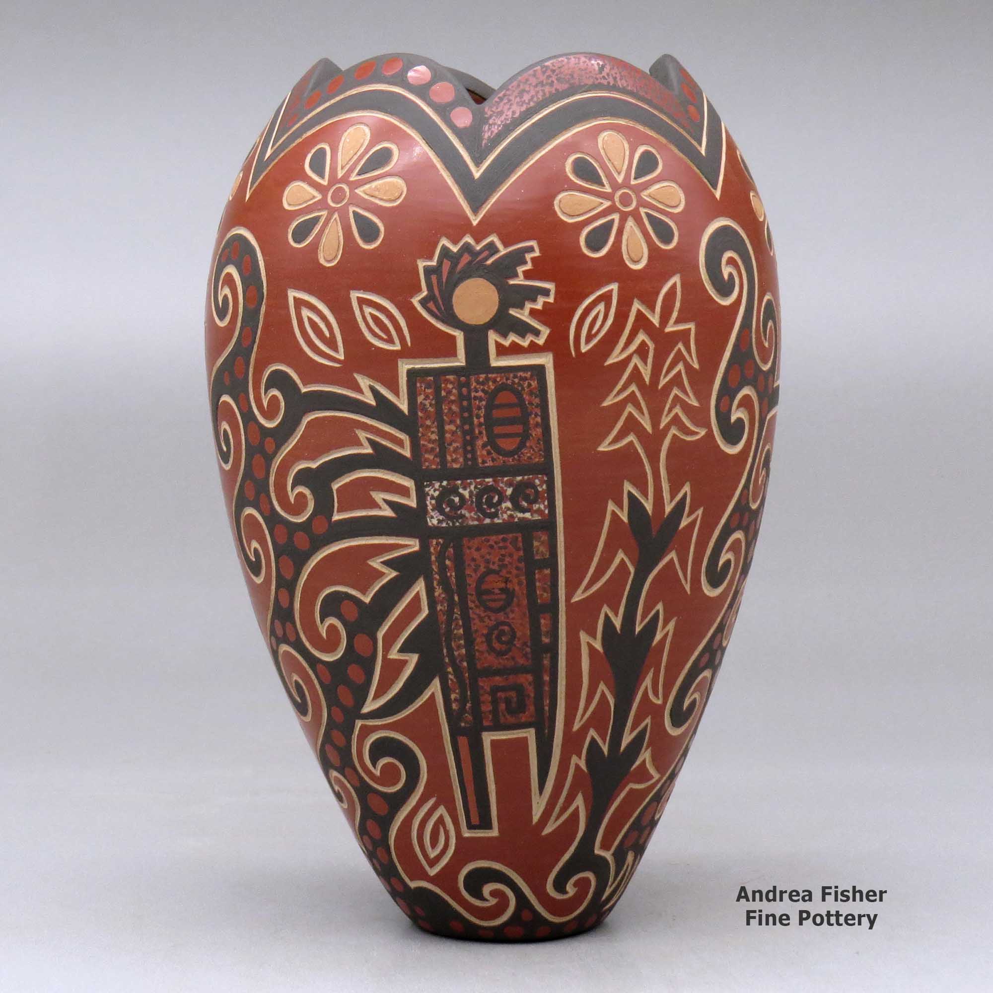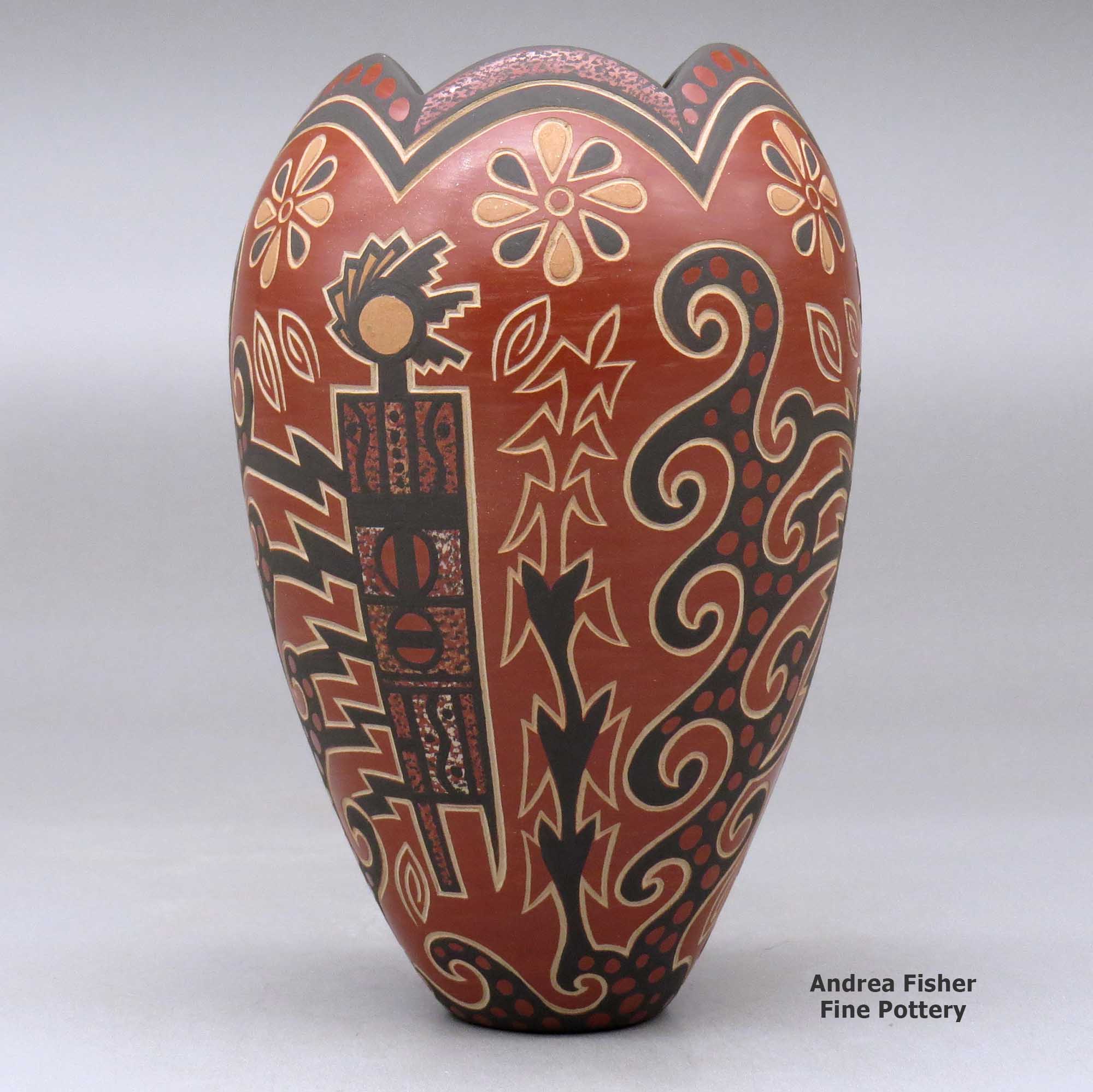 Born in St. Louis, Missouri in 1958, Glendora Fragua also spent some of her early years in California before her family returned to Jemez Pueblo in the 1970s. Her grandmother, Beninga Medina Madelena, married into Jemez Pueblo from Zia Pueblo years before and has been credited with helping to revive the Jemez pottery making tradition. Glendora learned the fundamentals of the traditional Jemez way of making pottery from her mother, Juanita Fragua, and by the age of 16 she was working with sgraffito techniques, working to develop her own style.