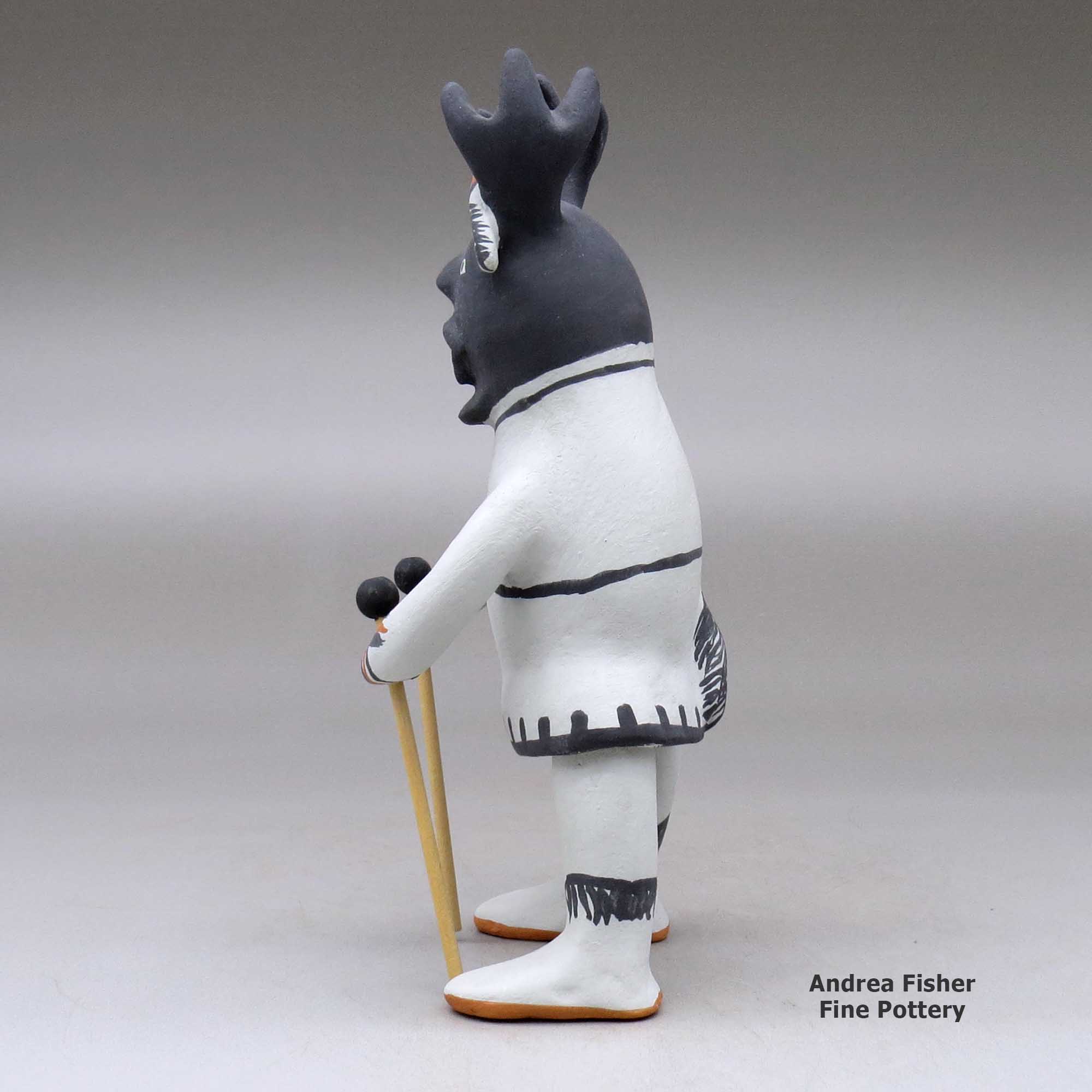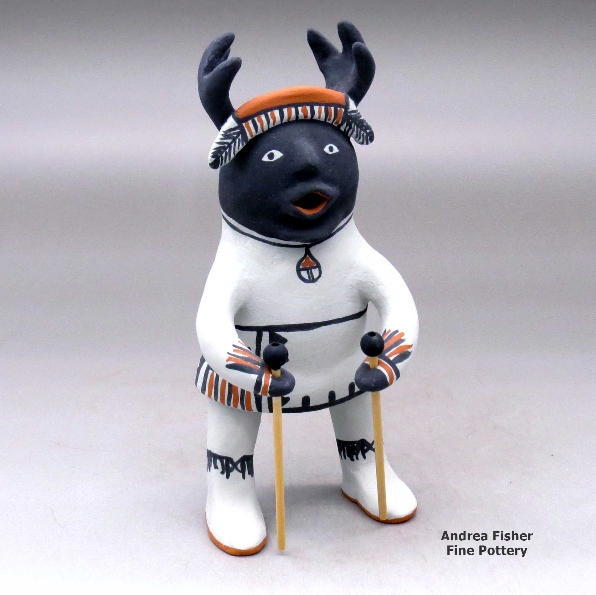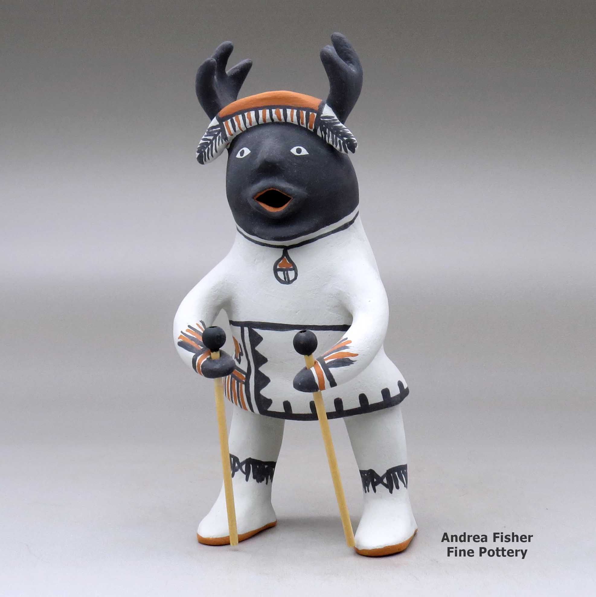 A few modern potters make traditional styled pots with black and red flowers, animals, clouds, lightning and geometric designs but most Cochiti pottery artists now create figurines. Most notable is the storyteller, a grandfather or grandmother figure with "babies" perched on it. Helen Cordero is credited with creating the first storyteller in 1964 to honor her grandfather. The storyteller style was quickly picked up by other pueblos and each modified the form to match their local situation (ie: clay colors and tribal and religious traditions). In some pueblos, storytellers are also now made as drummers and as a large variety of animals.