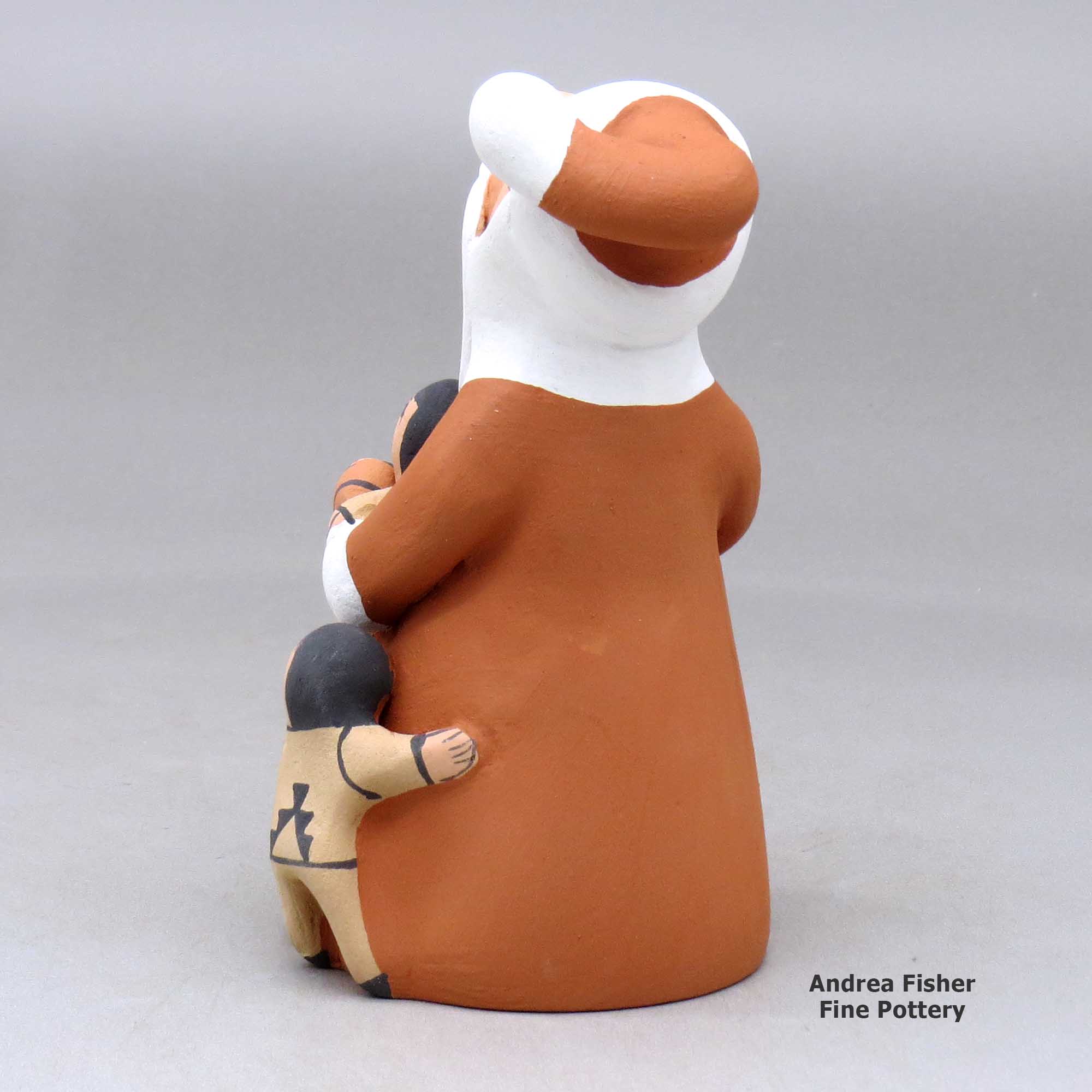 The first real storyteller figure was created in 1964 by Cochiti Pueblo potter Helen Cordero. She made it in memory of her grandfather, Santiago Quintana, and the stories he sang to her and other children in their native Keres when she was young. Helen's creation struck a chord throughout all the pueblos as the storyteller is a figure central to all their societies. Most tribes also have the figure of the Singing Maiden in their pantheon and in many cases, the mix of Singing Maiden and Storyteller has blurred some lines in the pottery world. Today, as many as three hundred potters in thirteen pueblos have created storytellers, and their storytellers are not only men and women but also Santa's, mudheads, koshares, bears, owls and other animals, sometimes encumbered with children numbering more than one hundred! Each potter has also customized their storyteller figures to more closely reflect the forms, dress and decorations of their own tribes, often even of their own clans.