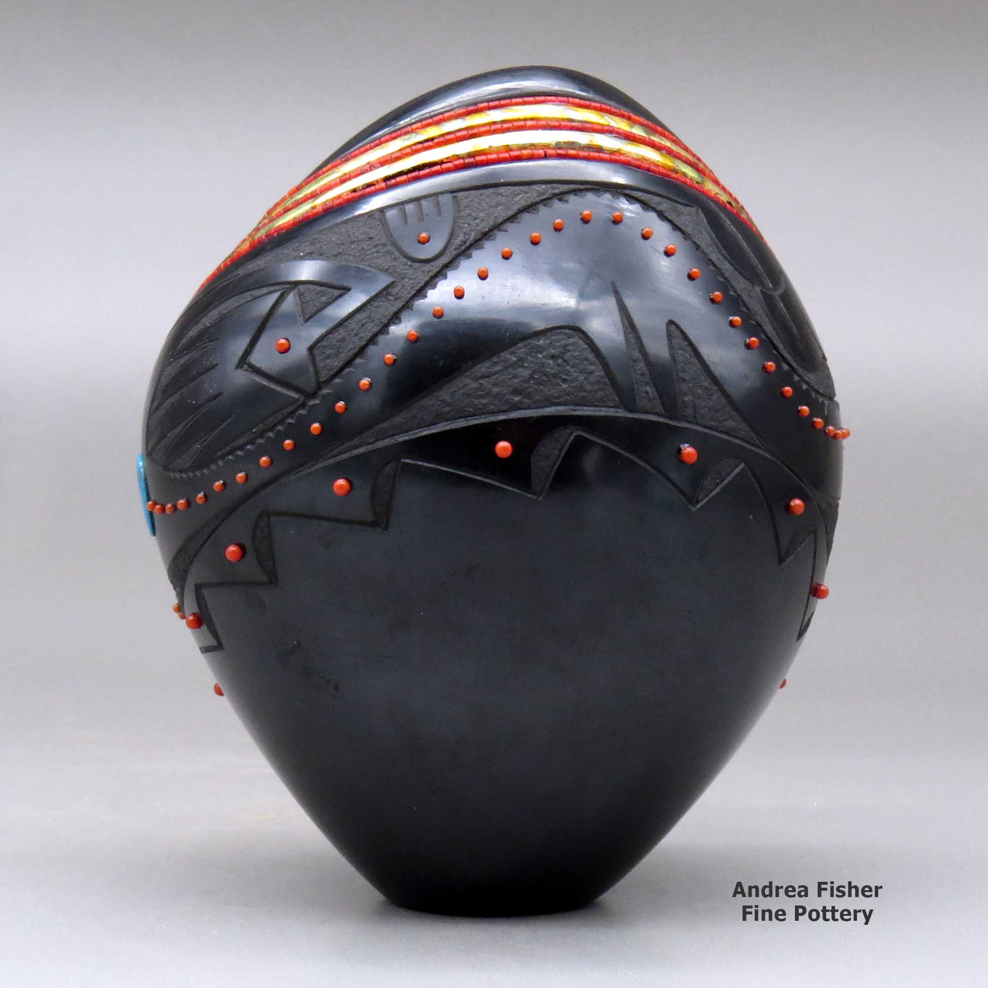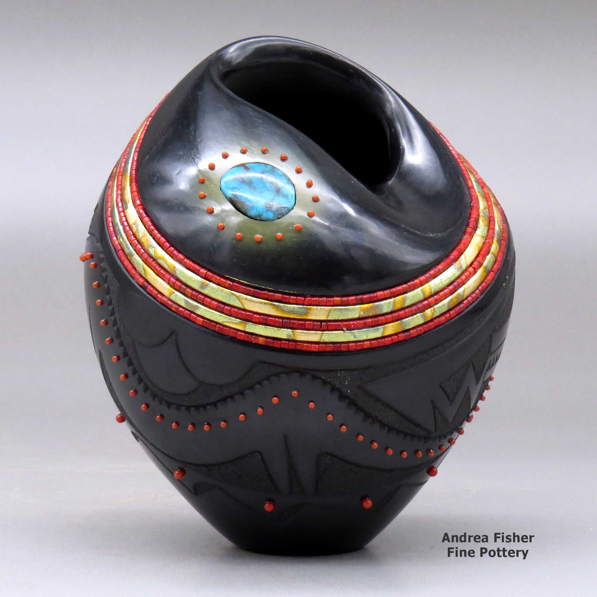 Russell is an avid outdoorsman and an expert with a kayak and a river raft. He's paddled rivers in Peru and Chile and challenged the Zambesi River in southern Africa. However, tamer rivers closer to home allow him to gather clay wherever he finds it. That has led to experiments with many different types of clay, even to the point of incorporating two or more different colors of clay into the same pot. He also often uses slips made of different colors of clay, including micaceous. His designs are painted, carved, incised and sometimes inlaid with turquoise and/or coral and heishi beads. For Russell, "traditional" doesn't mean being stuck in any one time period, it's more like growing and moving forward with everyone adding something else to the "traditional" as they travel their own paths.