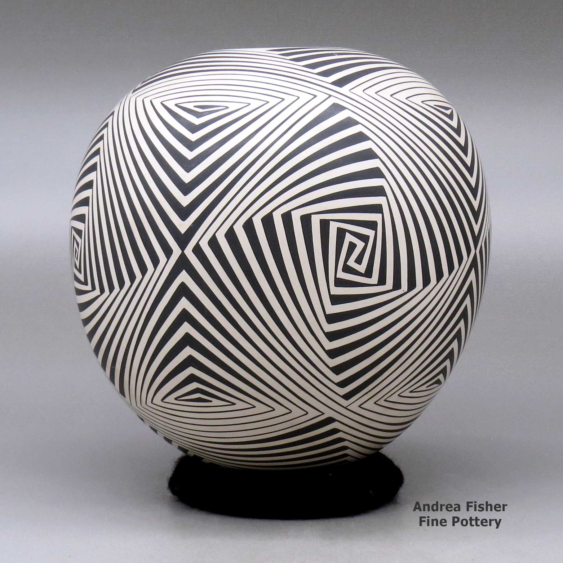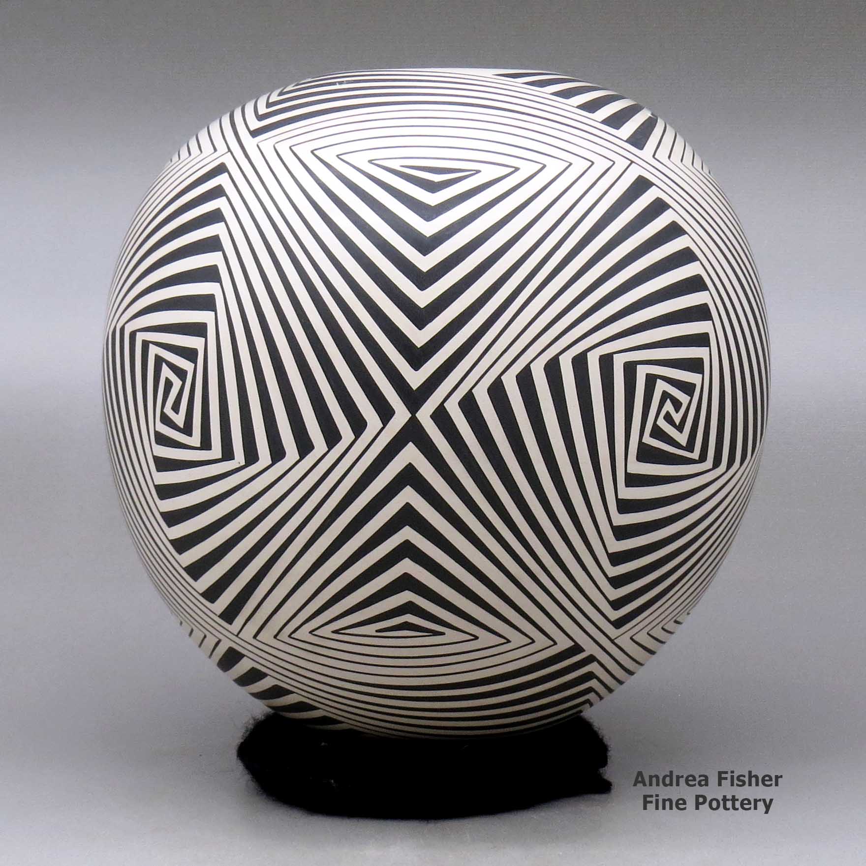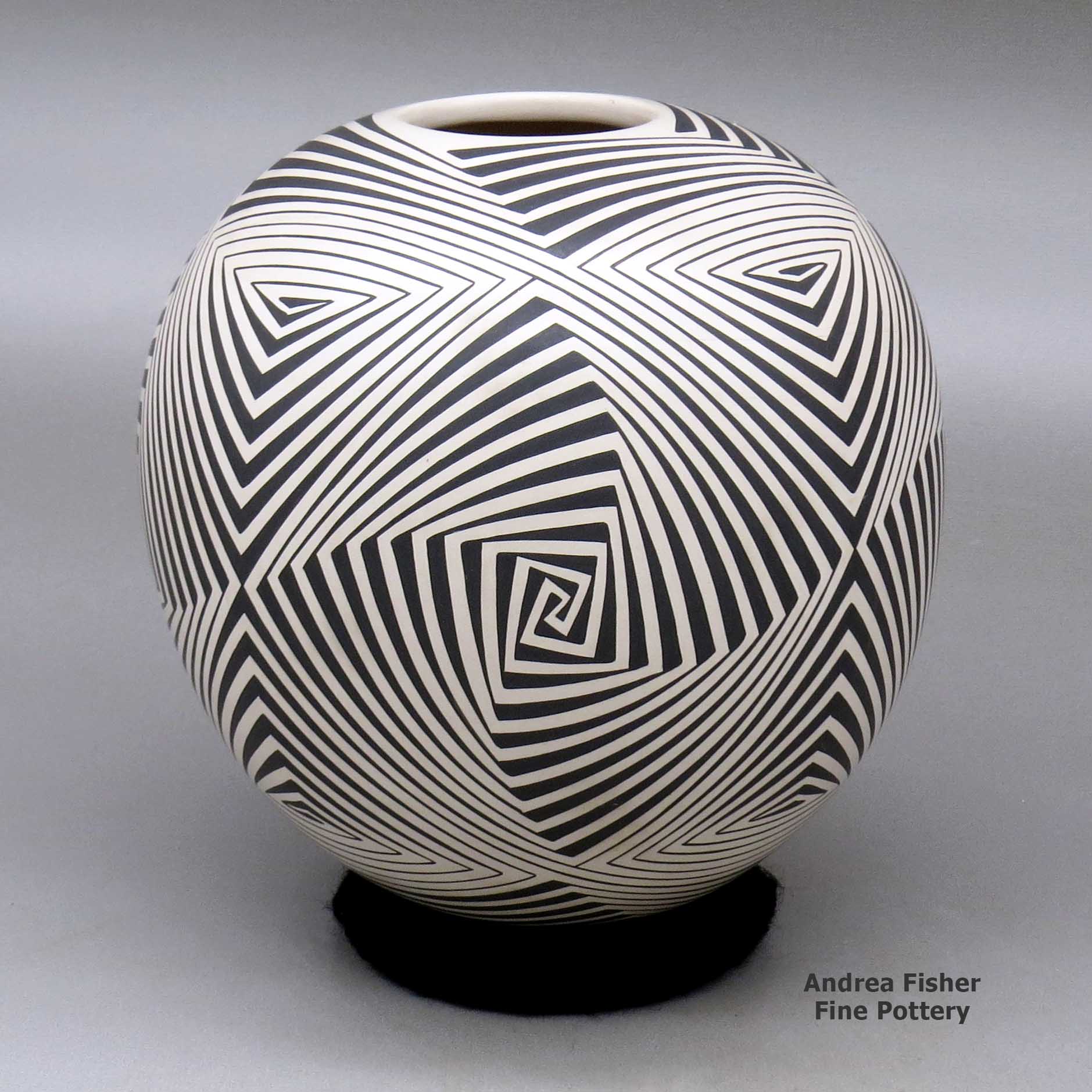 A black on beige jar decorated with a four panel spiraling geometric design made by Rodrigo Perez of Mata Ortiz and Casas Grandes