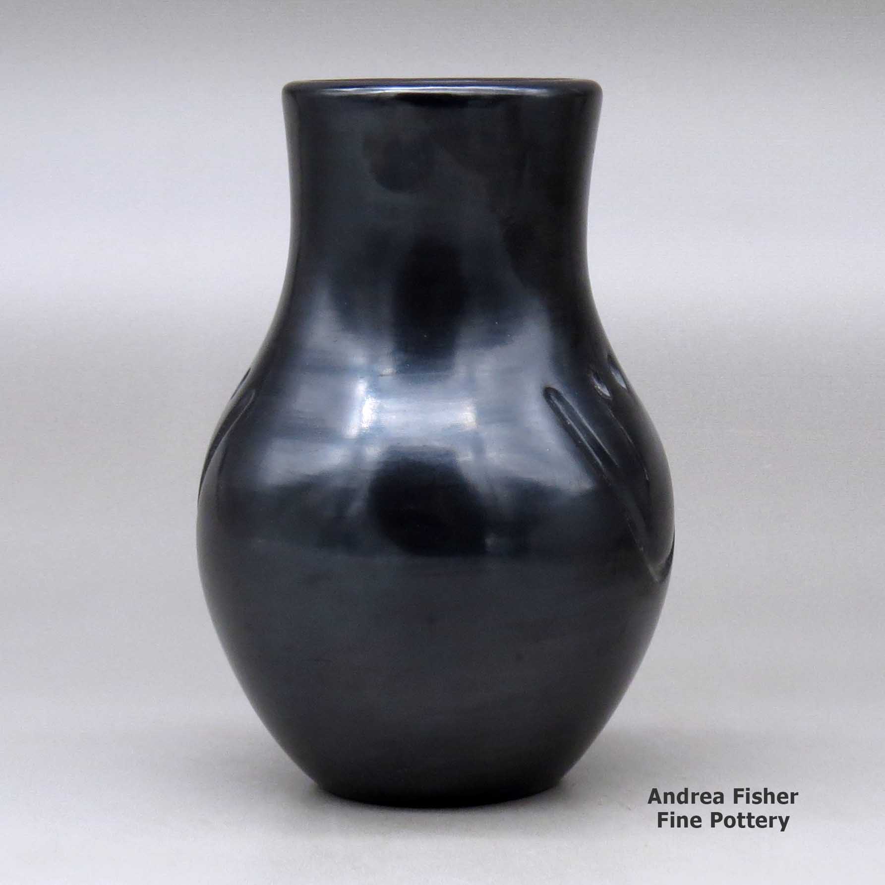 Today's pottery from Santa Clara is typically either black or red. It is usually highly polished and designs might be deeply carved or etched ("sgraffito") into the pot's surface. The water serpent, (avanyu), is a very common traditional design motif on Santa Clara pottery. Another motif comes from the legend that a bear helped the people find water during a drought. The bear paw has appeared on much of their pottery ever since.