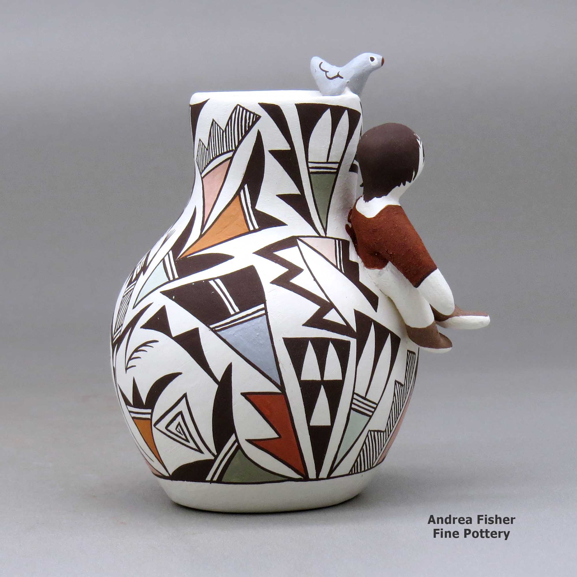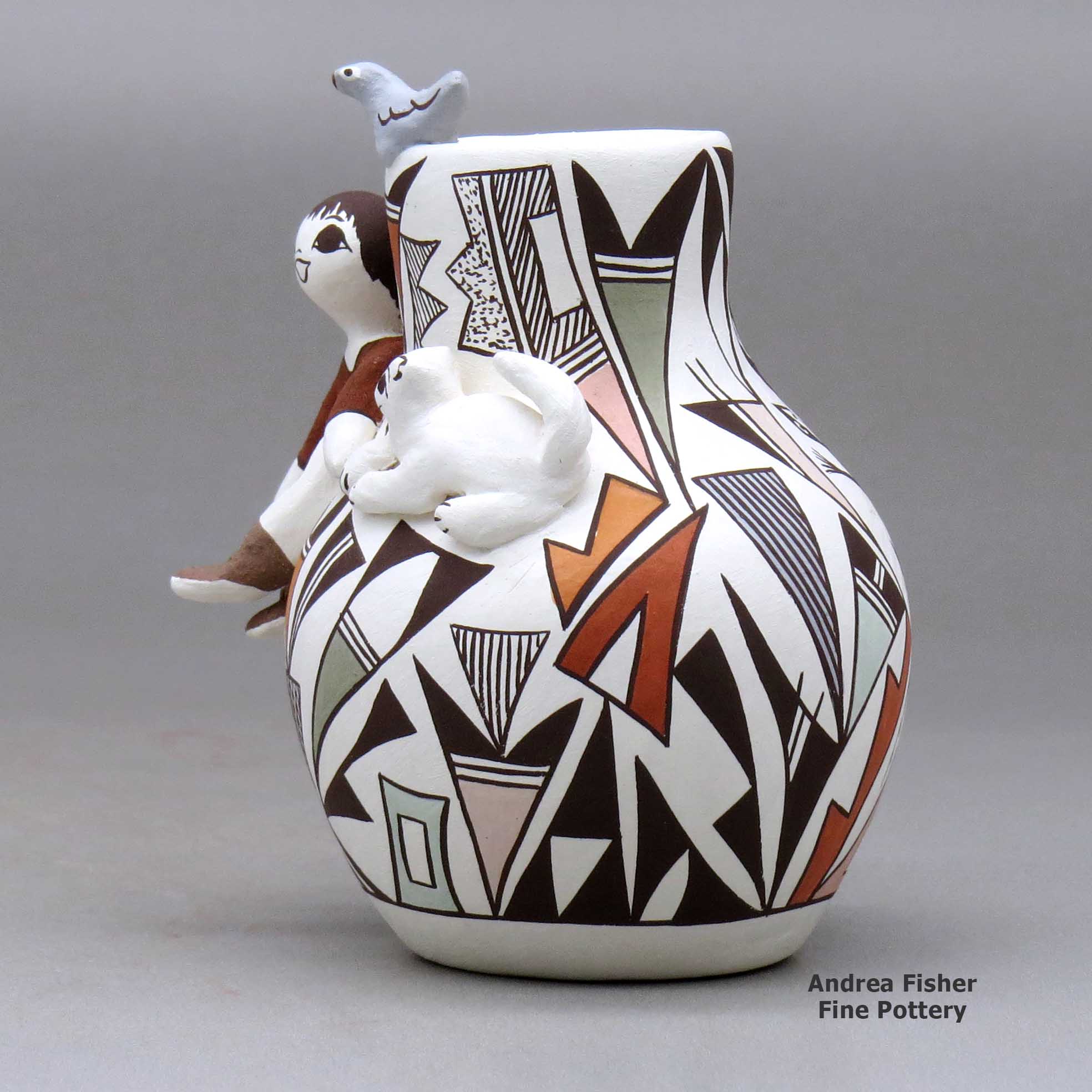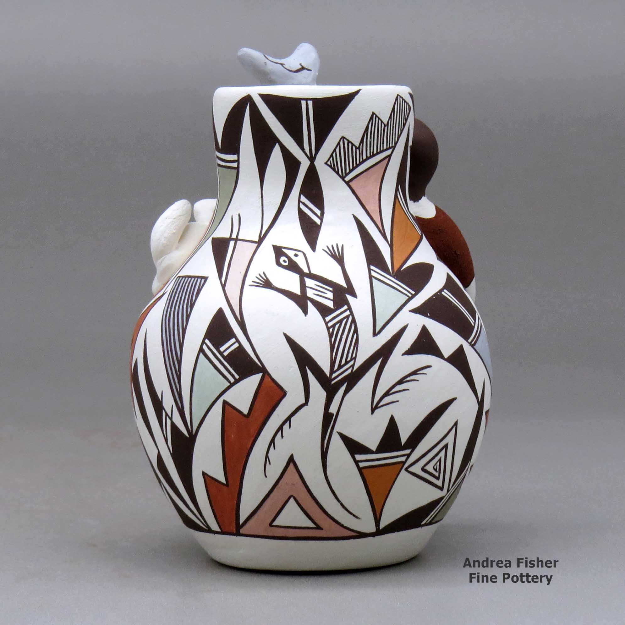 She is a member of one of the two non-related Lewis families at Acoma Pueblo: the Lucy Lewis family is the more well known but the family of Katherine Lewis (Marilyn Ray, Rebecca Lucario, Carolyn Concho, Diane Lewis and Judy Lewis) are known for some of the most innovative pottery being produced at Acoma. Each member of the family has carved out their own particular niche: Judy fashions storyteller, corn maiden, and friendship bowl figures with detailed facial expressions and joyous dispositions accented with butterflies, bluebirds, cats, dogs and ladybugs. Her work is the expression of an artist who obviously truly loves what she does.