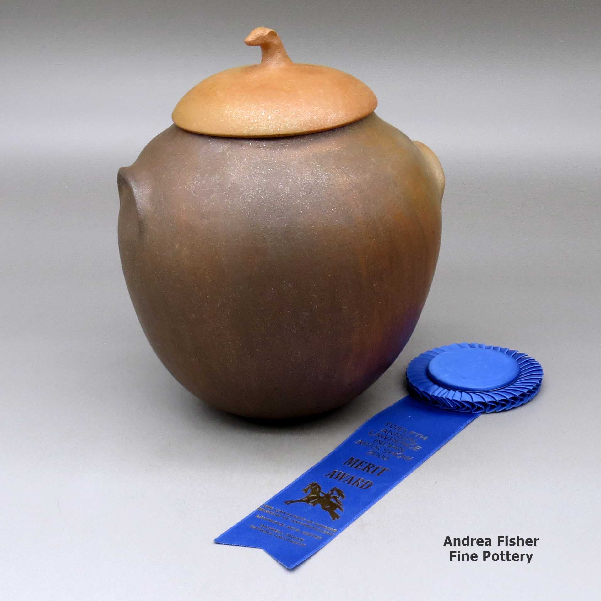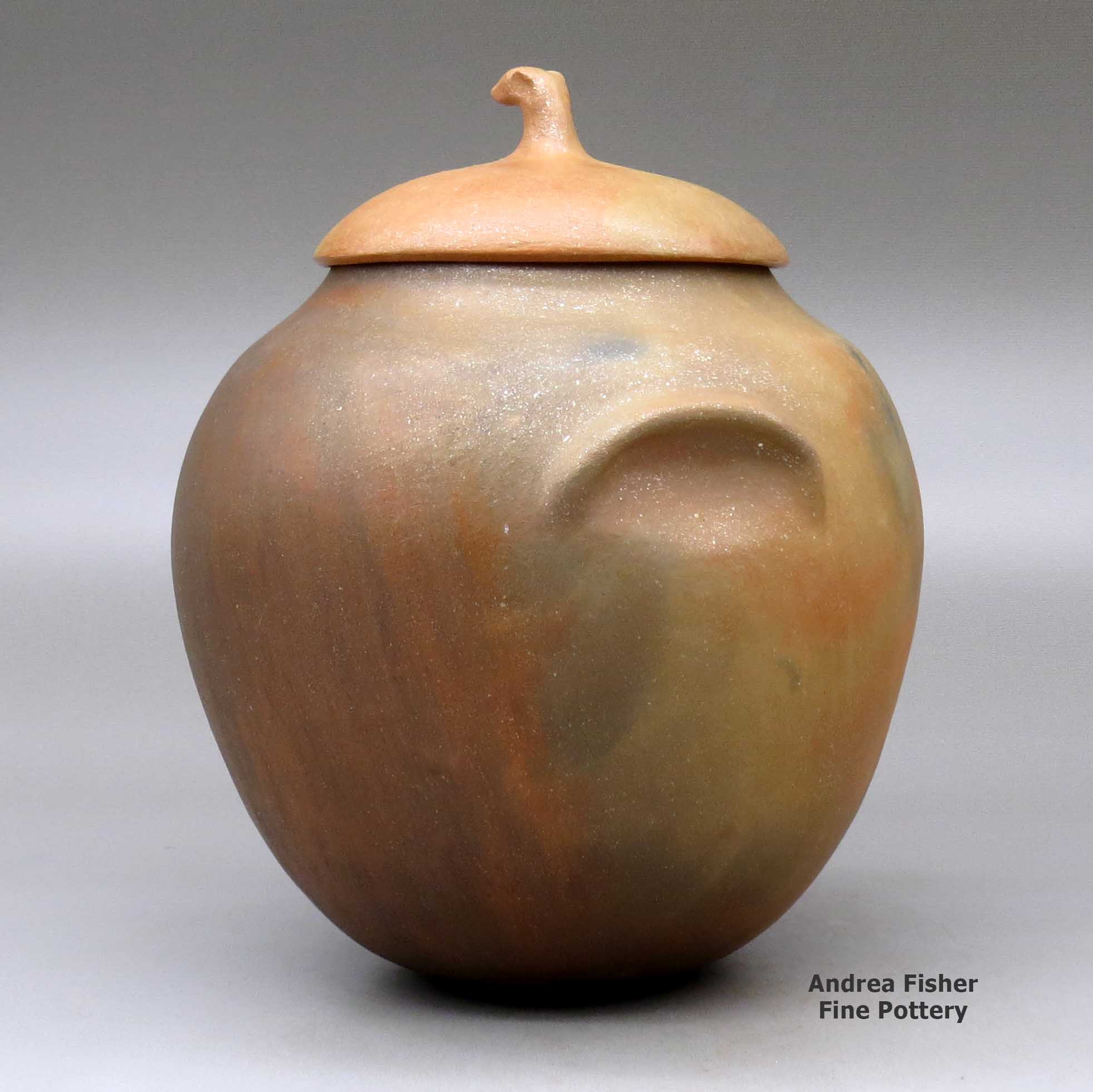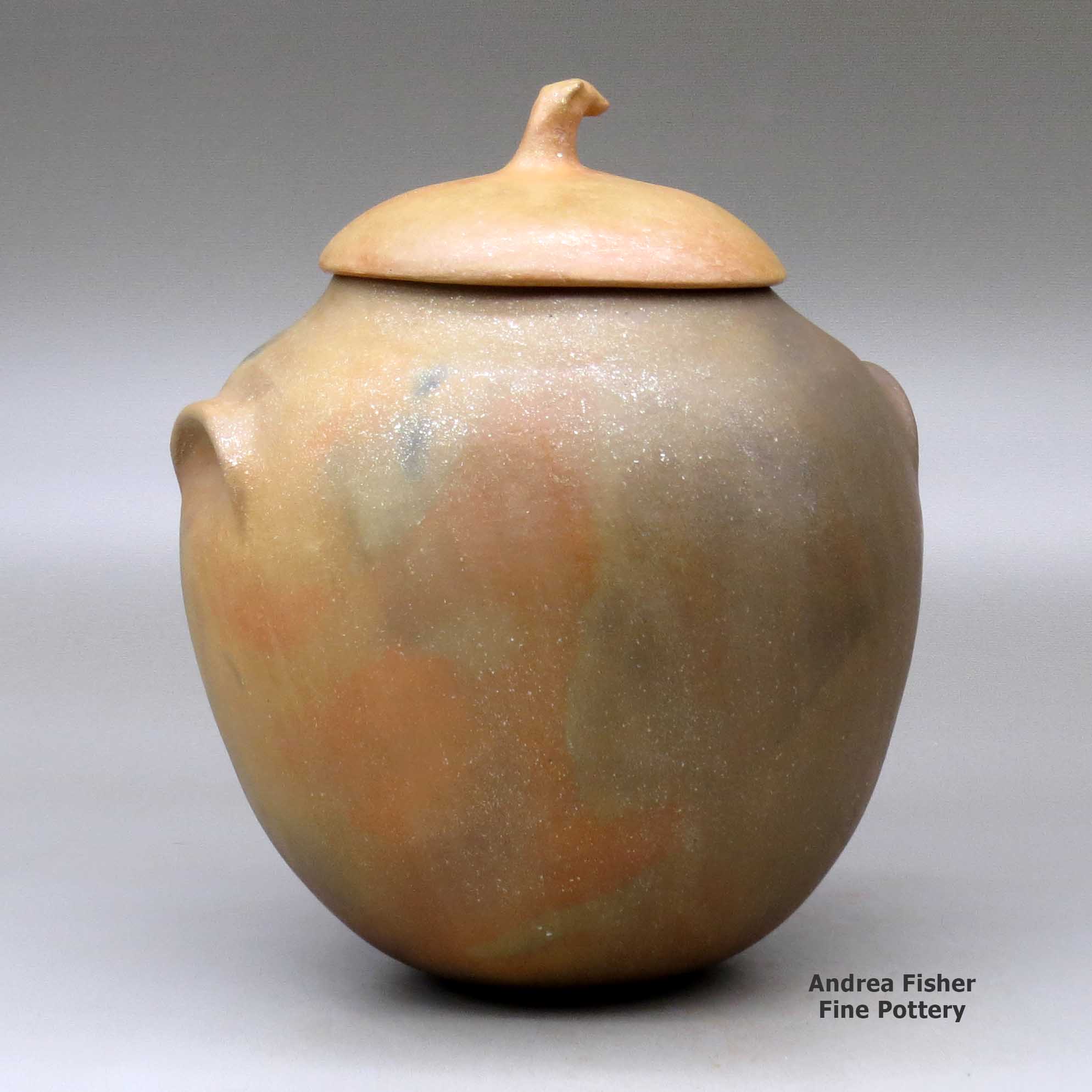 Potters from the Jicarilla Apache Nation collect their micaceous clay closer to home in the Jemez Mountains. The makeup of that clay is different and it fires to a less golden/orange color than does Taos clay. Some clay from the Picuris area fires less golden/orange, too. Christine McHorse, a Navajo potter who married into Taos Pueblo, uses various micaceous clays on her pieces depending on what the clay asks of her in the flow of her creating.