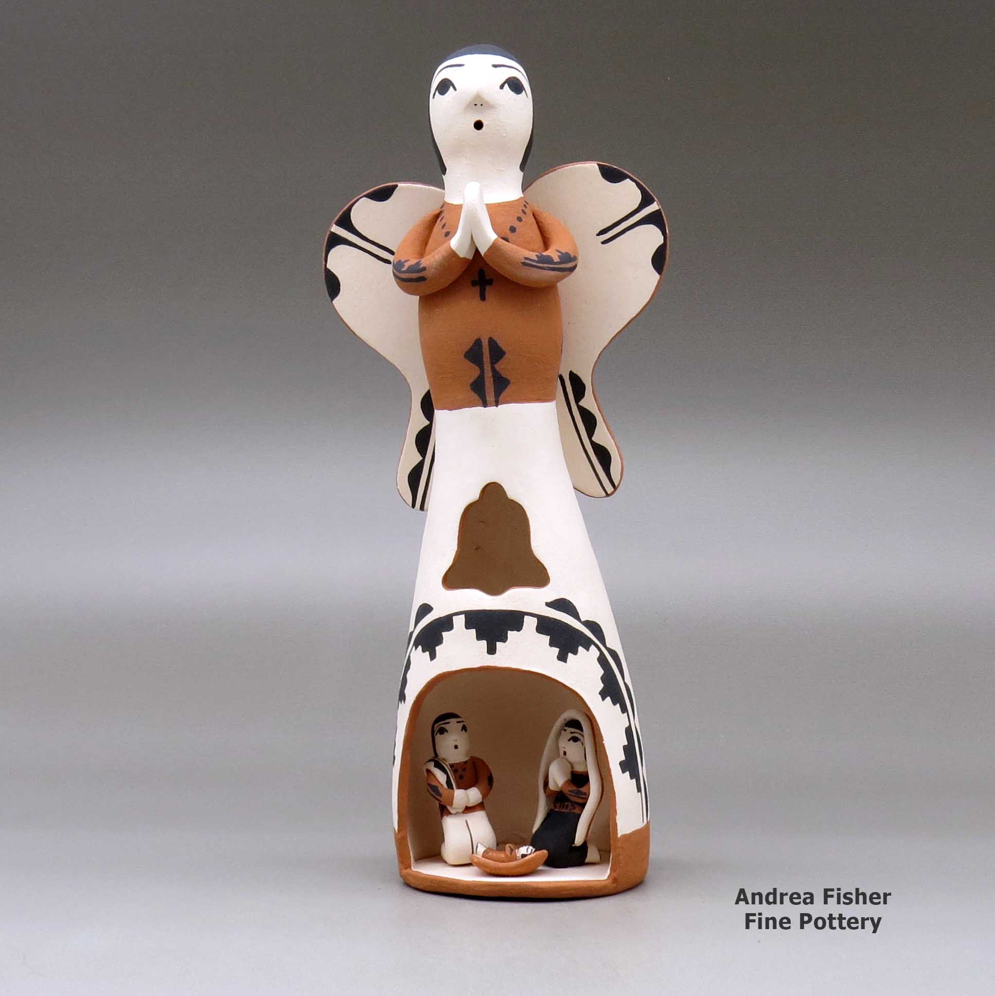 A polychrome Singing Angel figure with a nativity in her skirt made by Angel Bailon of Jemez
