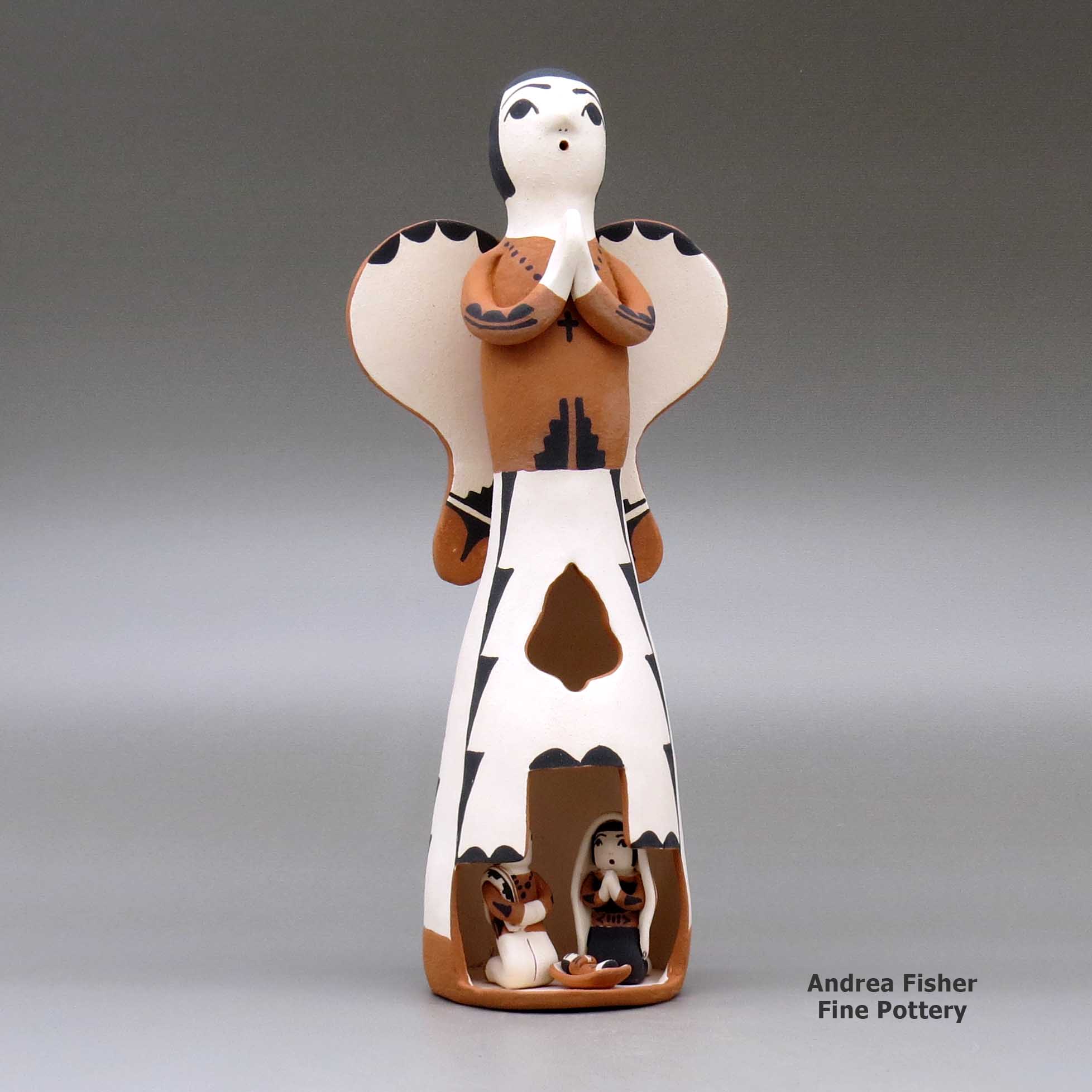 After Angel married Ralph Bailon she has been mostly constructing the pots, storytellers and nativity sets while he paints the designs. Among the other potters in Angel's family are Judy Toya (a well-known storyteller maker) and Kathleen and Adrian Wall, all of Jemez Pueblo. Most of her pottery forms show that Jemez influence but she makes her pottery at Santo Domingo with Ralph.