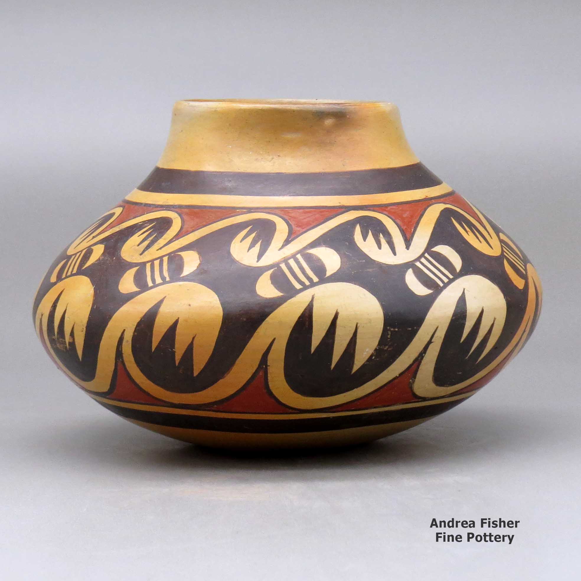 Leah Garcia Nampeyo was a daughter of Fannie Nampeyo. Among her siblings were Tonita Hamilton, Elva Tewaguna, Thomas Polacca and Iris Youvella. All of them were born at a time when their grandmother, Nampeyo of Hano, was losing her eyesight and her daughters (and others) were doing more and more painting for her. So on one side of the room was a woman continually coiling, forming, scraping and sanding pottery while on the other side was one woman or another continually mixing paints and applying designs to the dry pieces. Then every few days a space of ground would be prepared, a few pieces of pottery would be carefully placed, wood would be carefully stacked around them and then a fire lit to finish them. There was no way to be in that house and not be exposed to every aspect of making pottery the ages-old way.