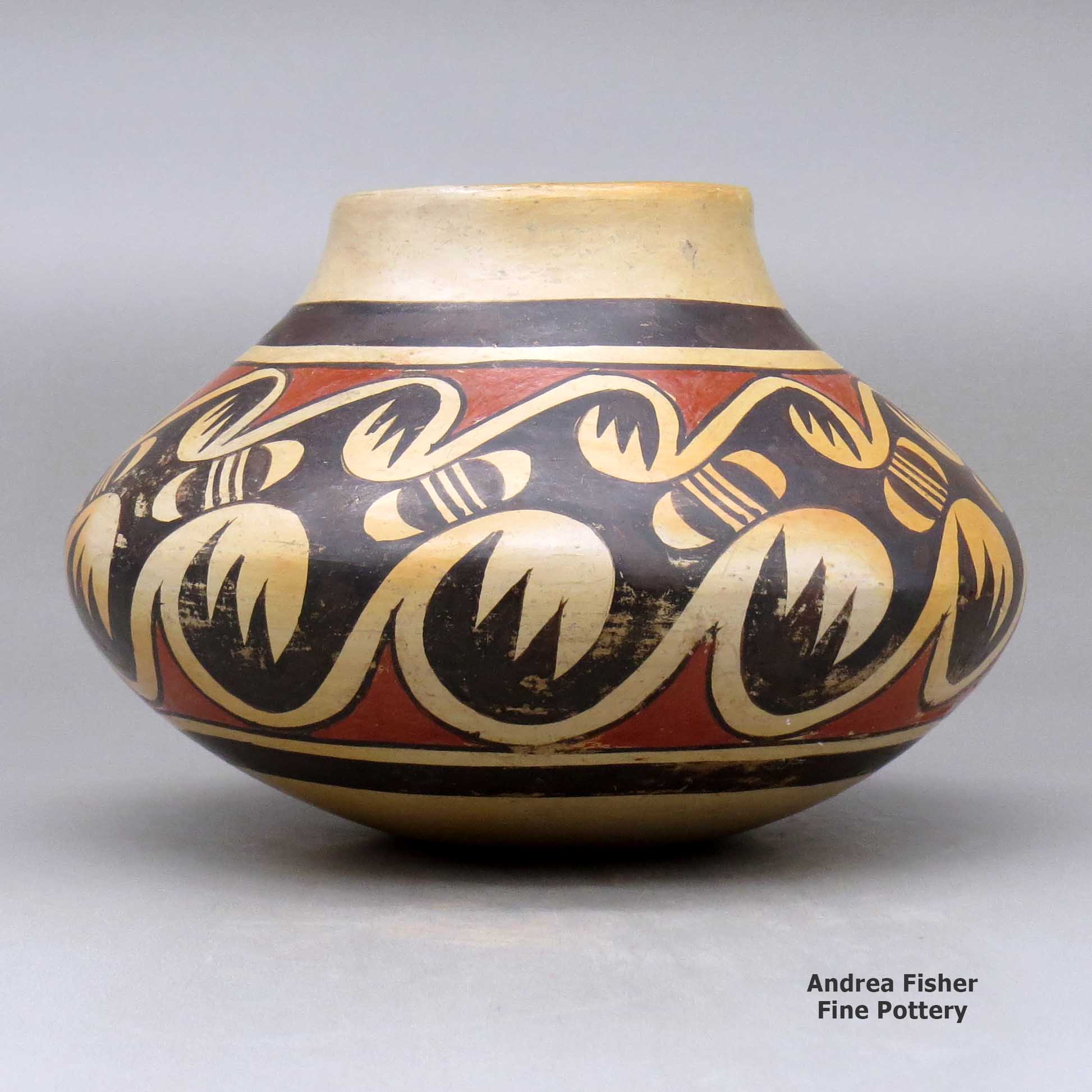 Throughout Leah's pottery-making years she adhered closely to the forms and designs she'd learned from Fannie as she was growing up. She was noted for her fineline work, her migration patterns and for producing adaptations similar to her mother's. Her favorite designs seem to have been versions of the eagle and eagletail.