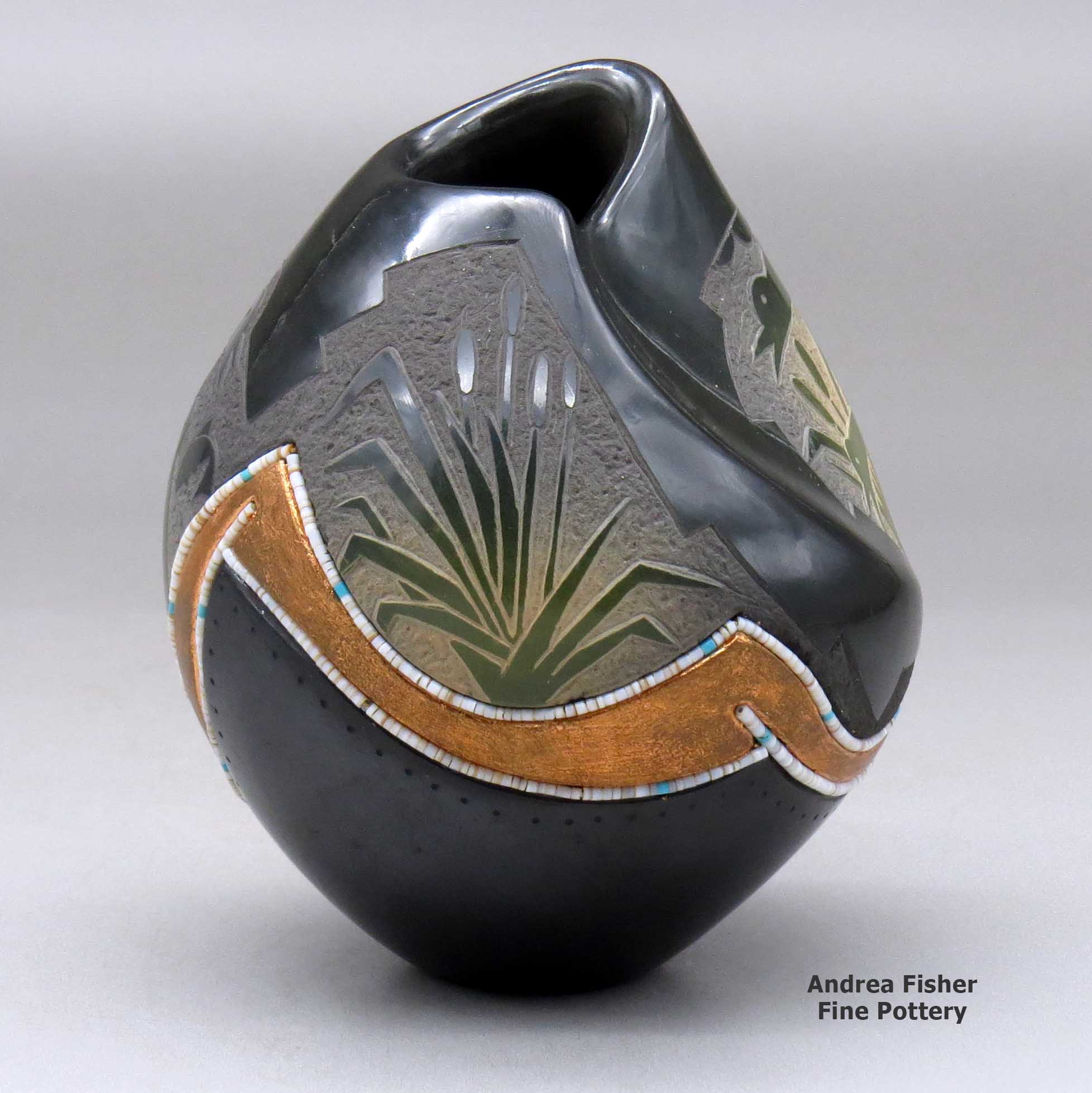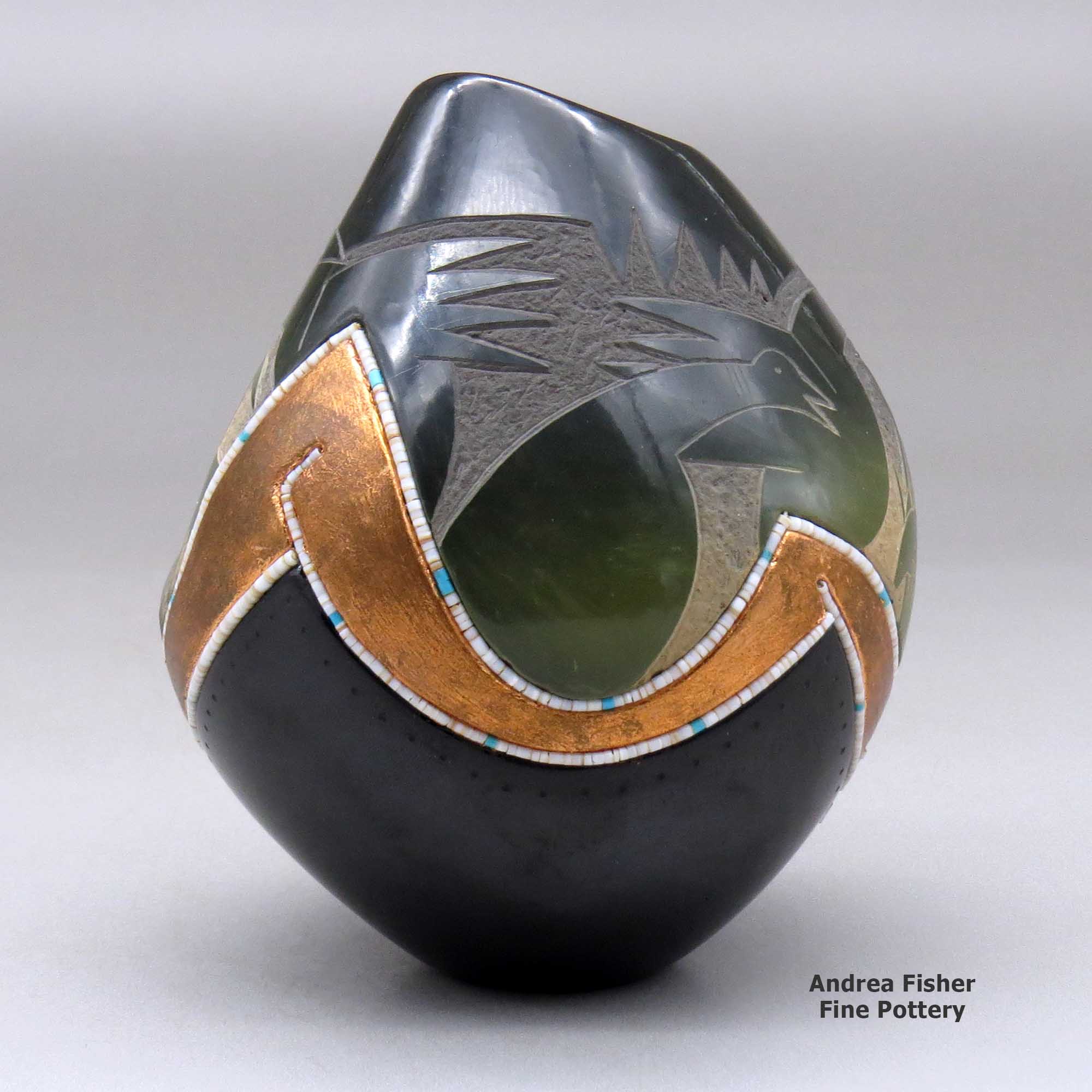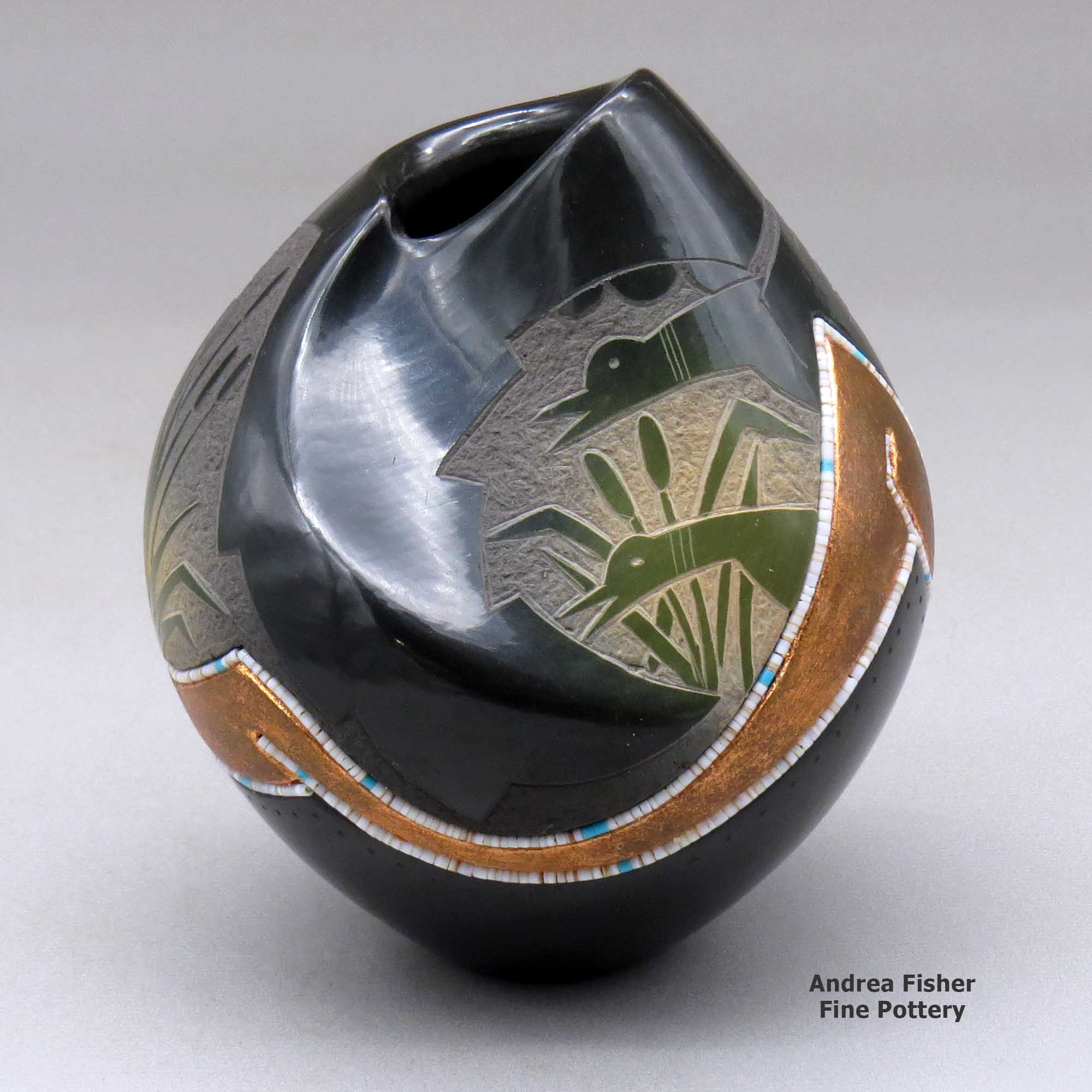 Russell is an avid outdoorsman and an expert with a kayak and a river raft. He's paddled rivers in Peru and Chile and challenged the Zambesi River in southern Africa. However, tamer rivers closer to home allow him to gather clay wherever he finds it. That has led to experiments with many different types of clay, even to the point of incorporating two or more different colors of clay into the same pot. He also often uses slips made of different colors of clay, including micaceous. His designs are painted, carved, incised and sometimes inlaid with turquoise and/or coral and heishi beads. For Russell, "traditional" doesn't mean being stuck in any one time period, it's more like growing and moving forward with everyone adding something else to the "traditional" as they travel their own paths.