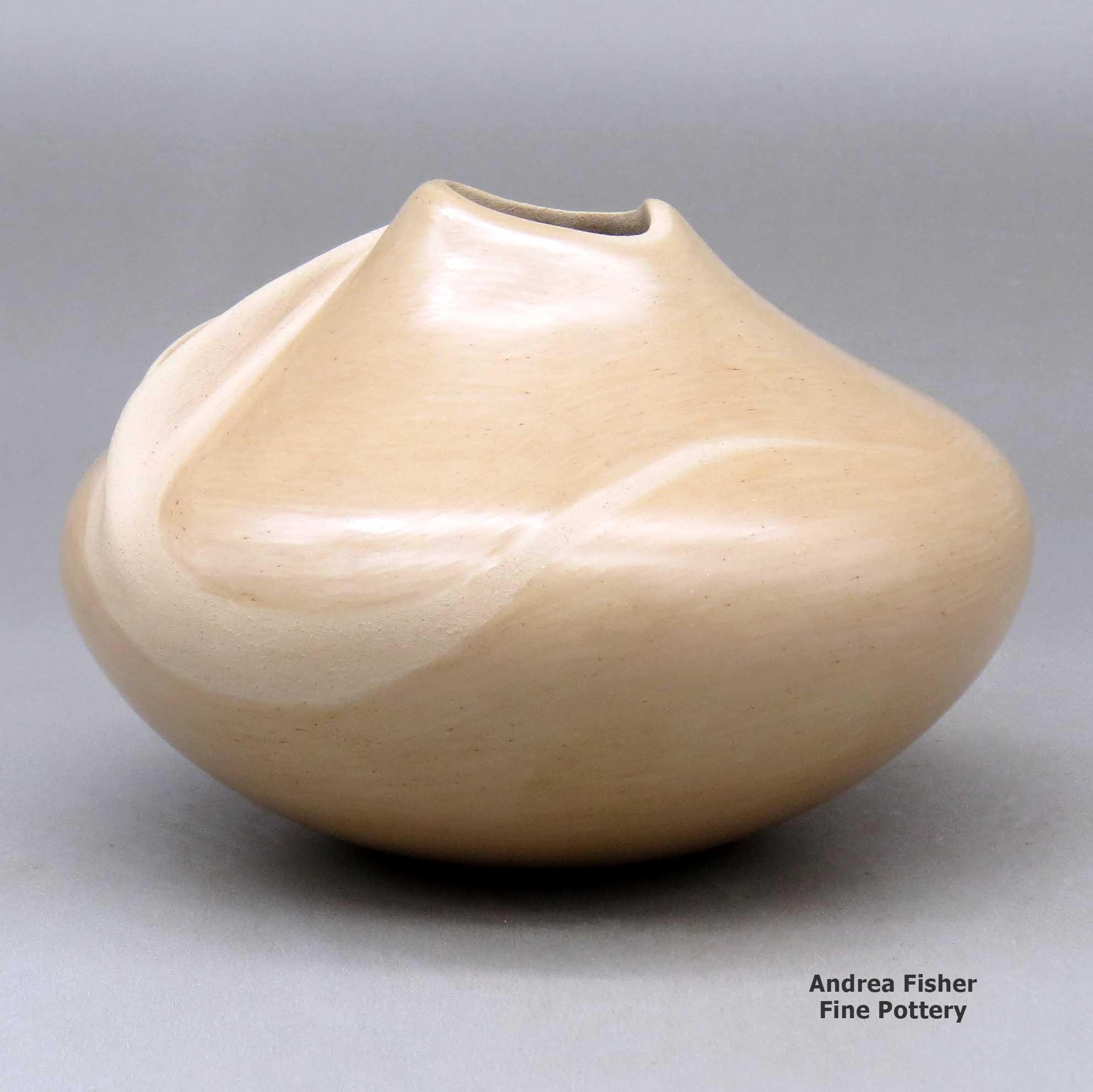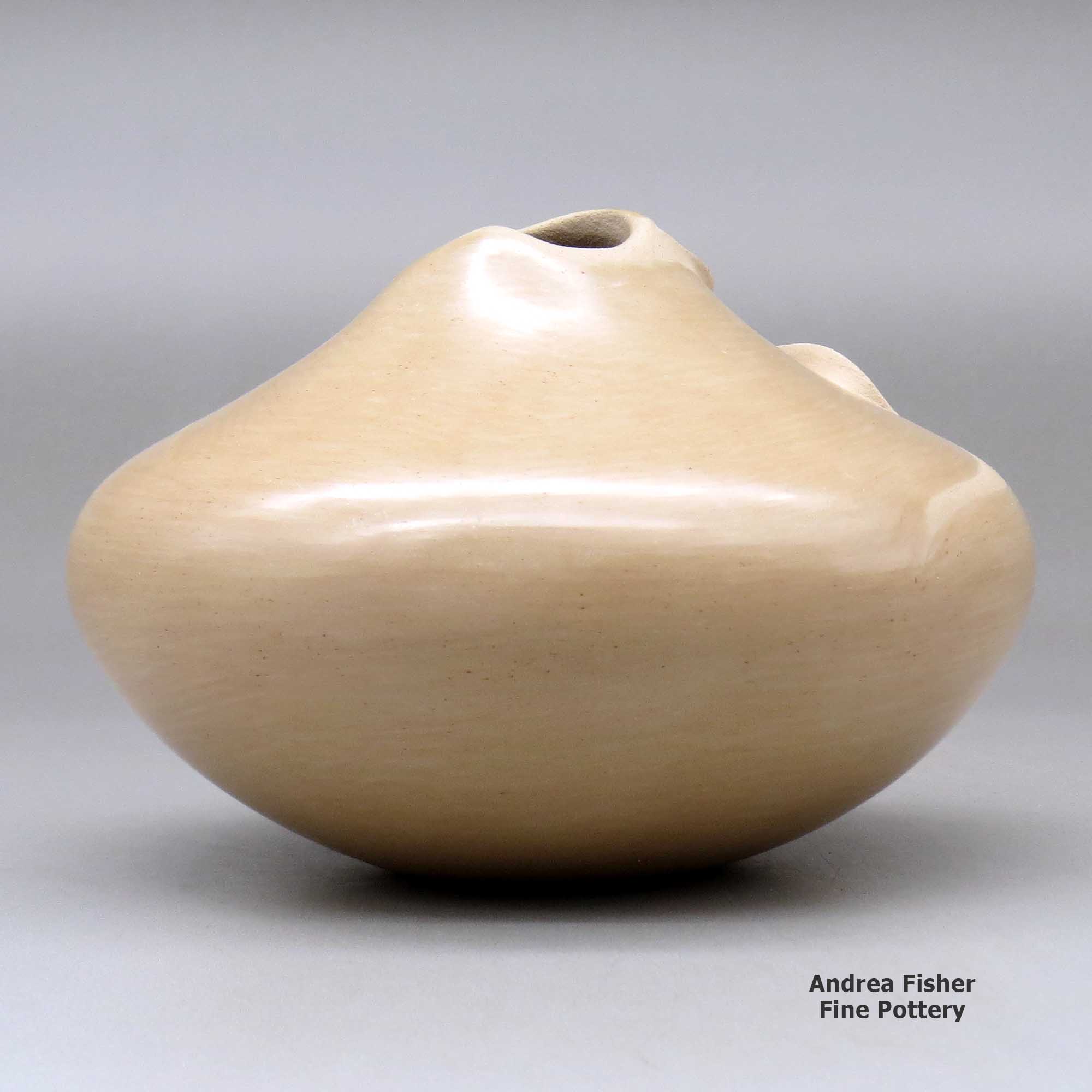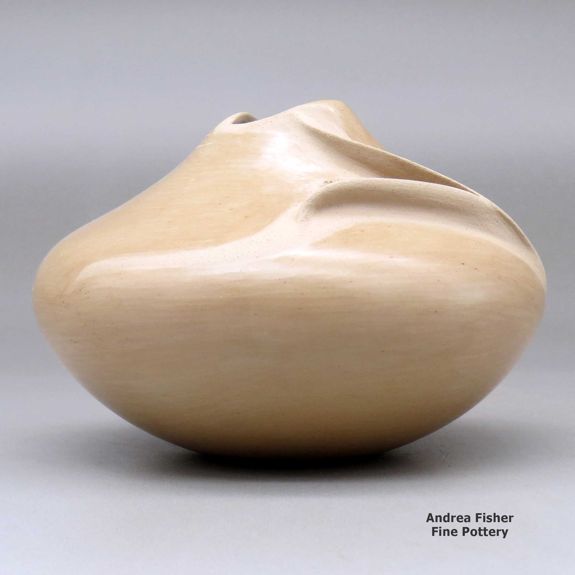 Born in 1944, Iris Youvella Nampeyo was a daughter of Fannie Nampeyo. She learned the traditional art of making pottery by watching and working with her mother as she grew up. Early in her career as a potter she used many of the pottery styles and designs made famous by her mother and grandmother but then she changed to making unslipped tan pottery with no painted decorations.