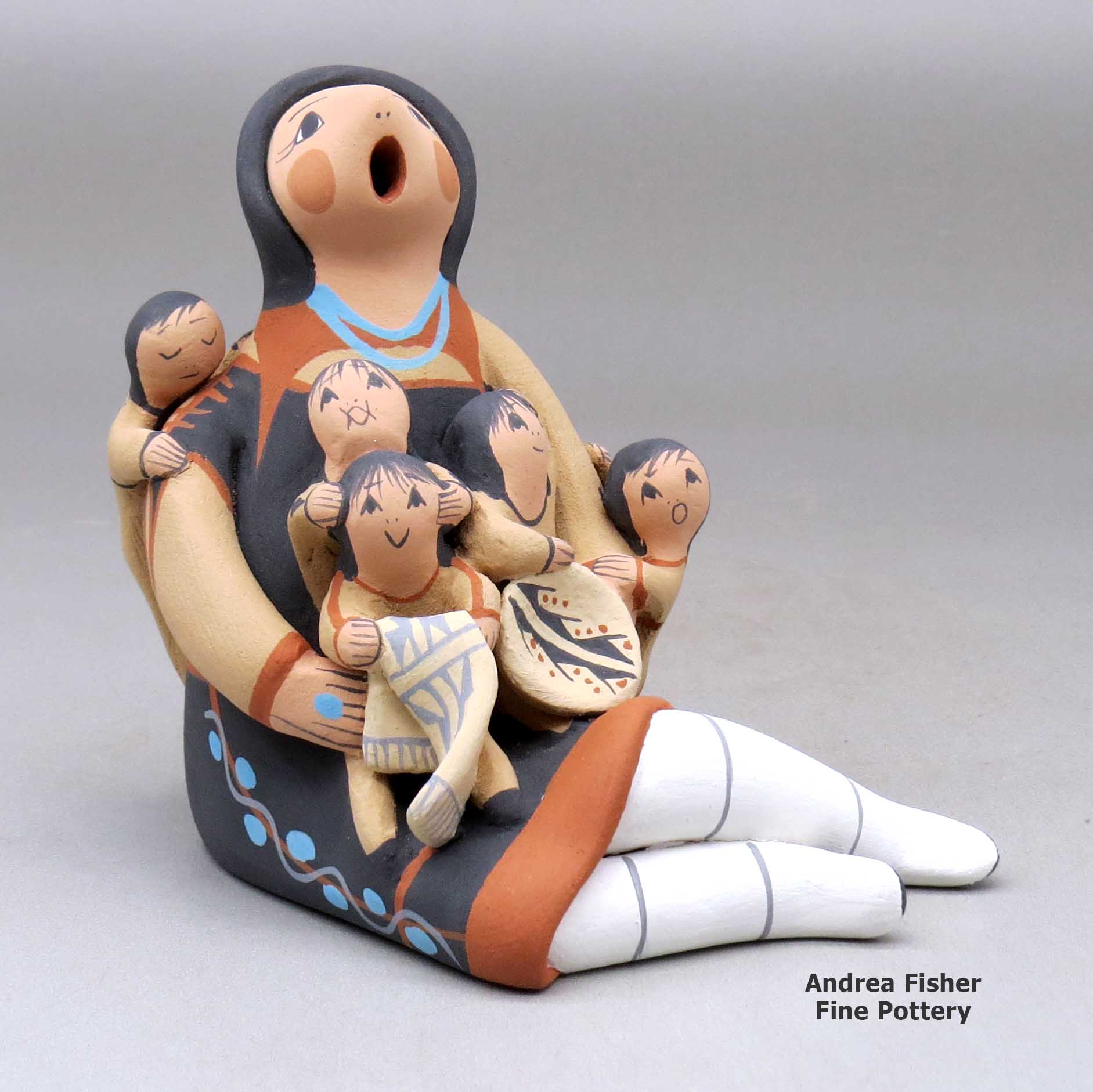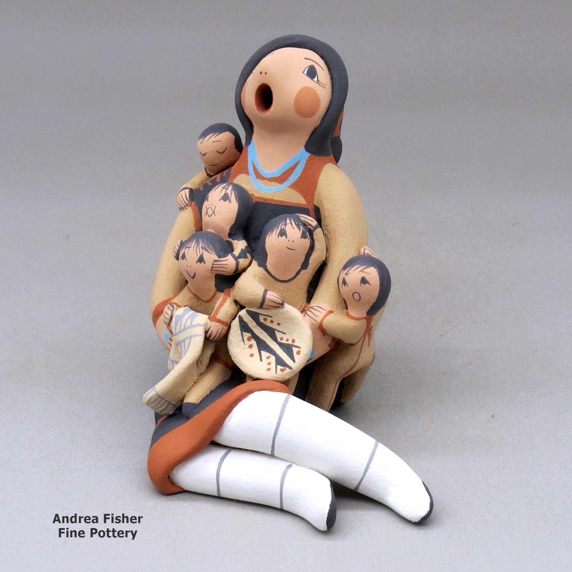 Storytellers are usually grandparent figures with the figures of children attached to their bodies. The grandparents are pictured singing tribal songs and oral histories to their descendants. While this visual representation was first created at Cochiti Pueblo (a site in close geographical proximity to Jemez Pueblo) in the early 1960s by Helen Cordero, it speaks to the relationship between grandparents and grandchildren of every culture. Nativities, corn maidens, singing angels and many different animal forms are also popular among the potters of Jemez.
