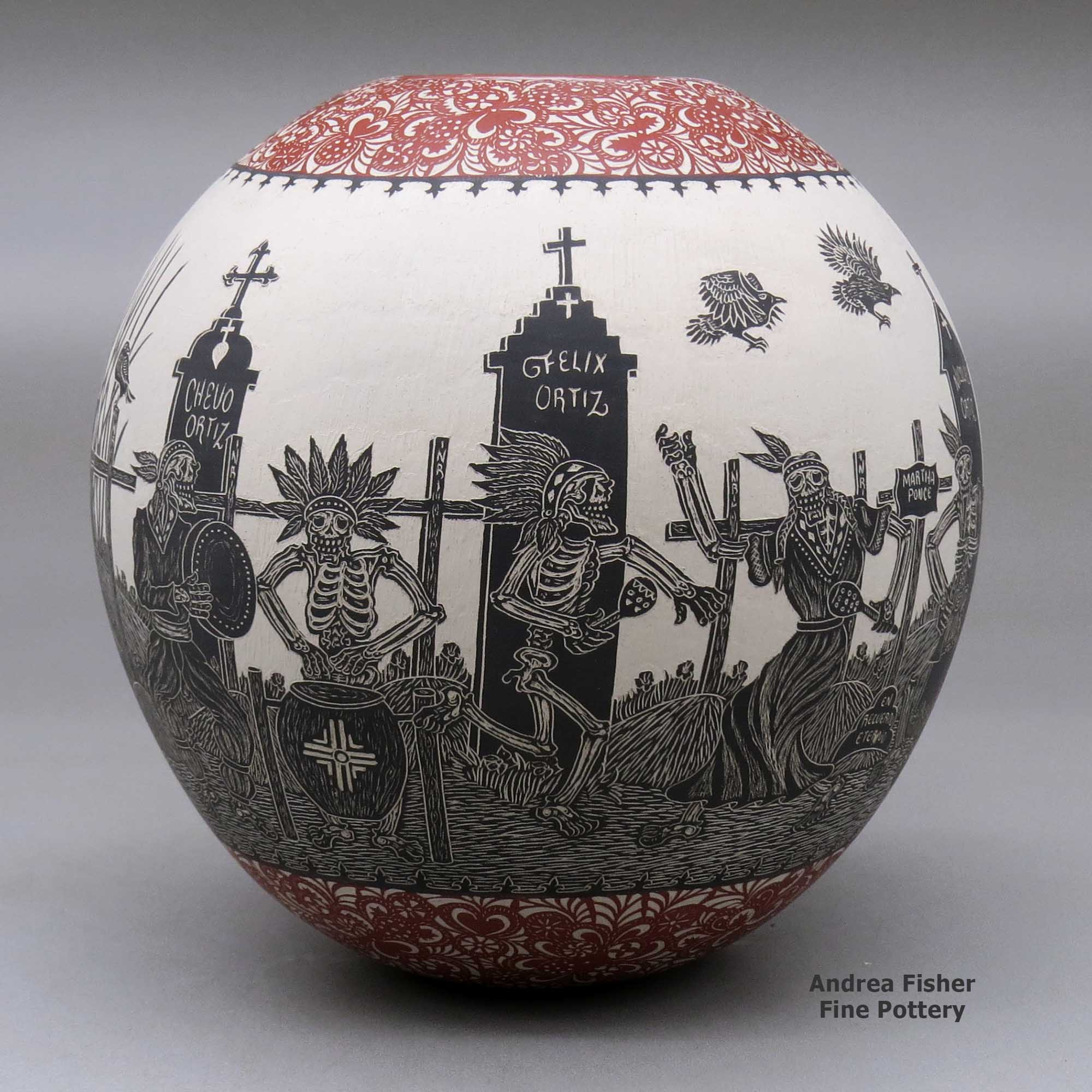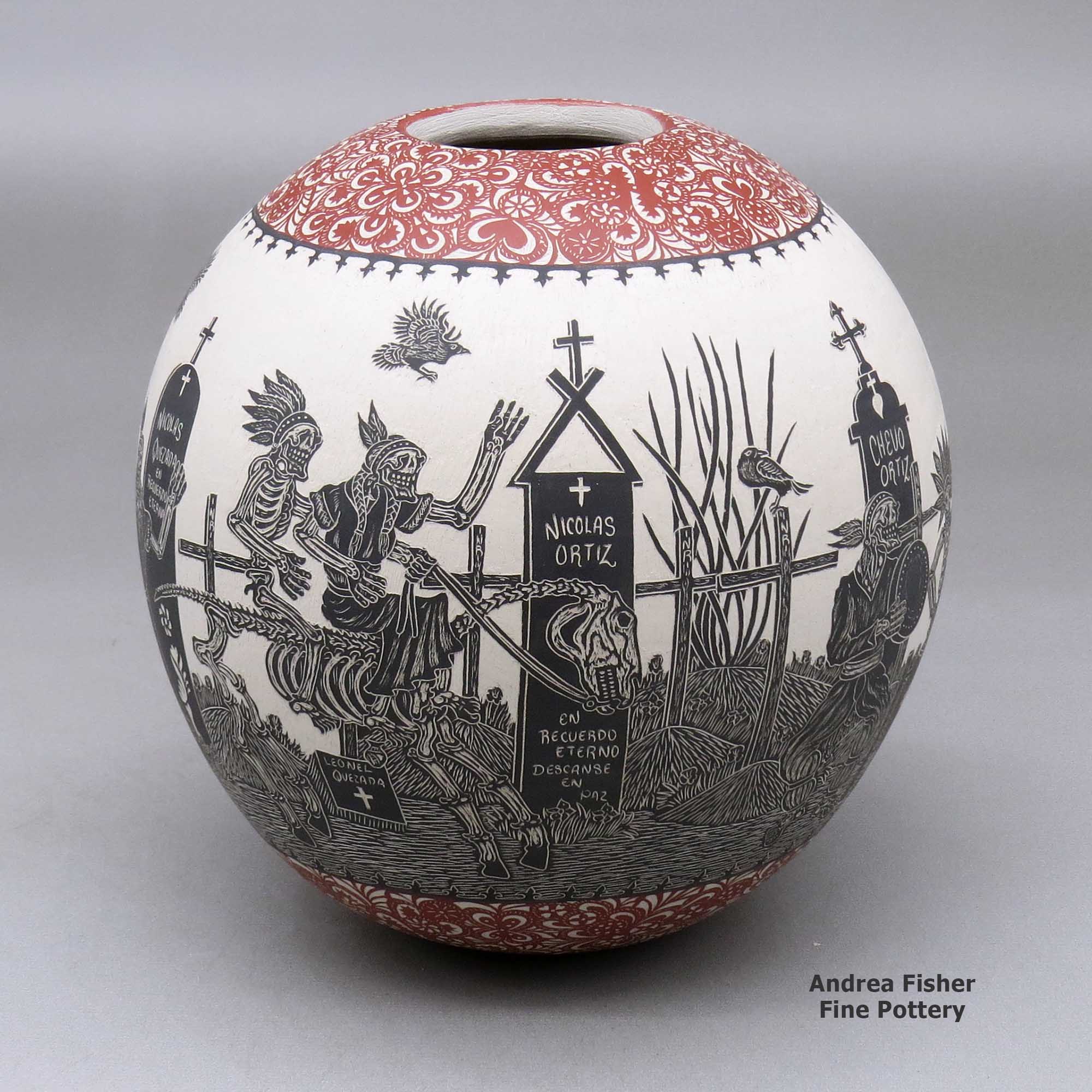 Born in 1984, Hector Javier Martinez sprang onto the Mata Ortiz pottery scene around 2008 with his distinctive style of black and white pots incised with Day of the Dead and Night of the Dead motifs. Those designs resulted from a comment made to him by Steve Rose (a well-known American pottery dealer).
