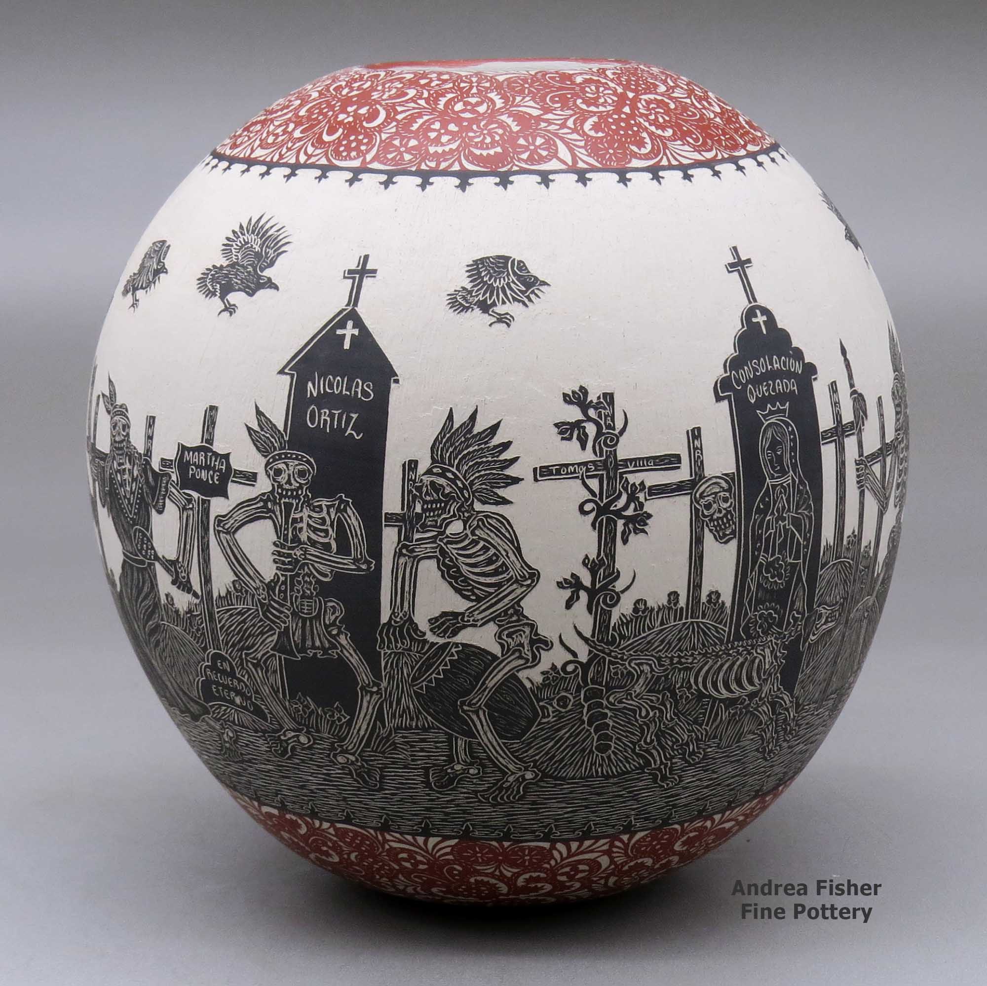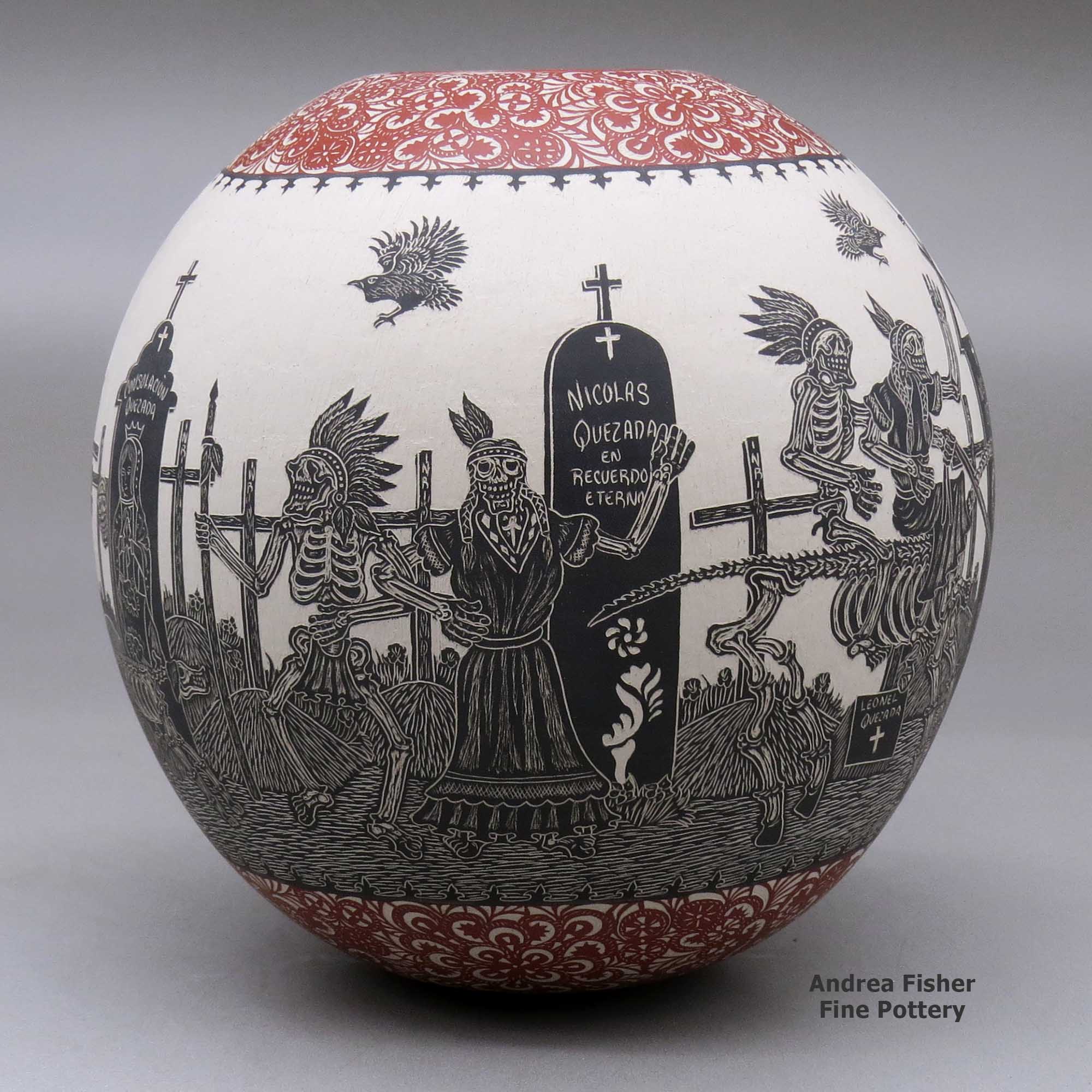 Today, Javier is producing all kinds and sizes of pots with his signature Day of the Dead and Night of the Dead motifs. However, with his success has come competition and knockoffs. That said, the detail of his work sets him well apart and working with Gabriela has introduced some new elements into their Dia de los Muertos collection of designs, adding curlicues and other graphic elements, sometimes in Javier's designs and sometimes around the base and in a wide band below the rim.