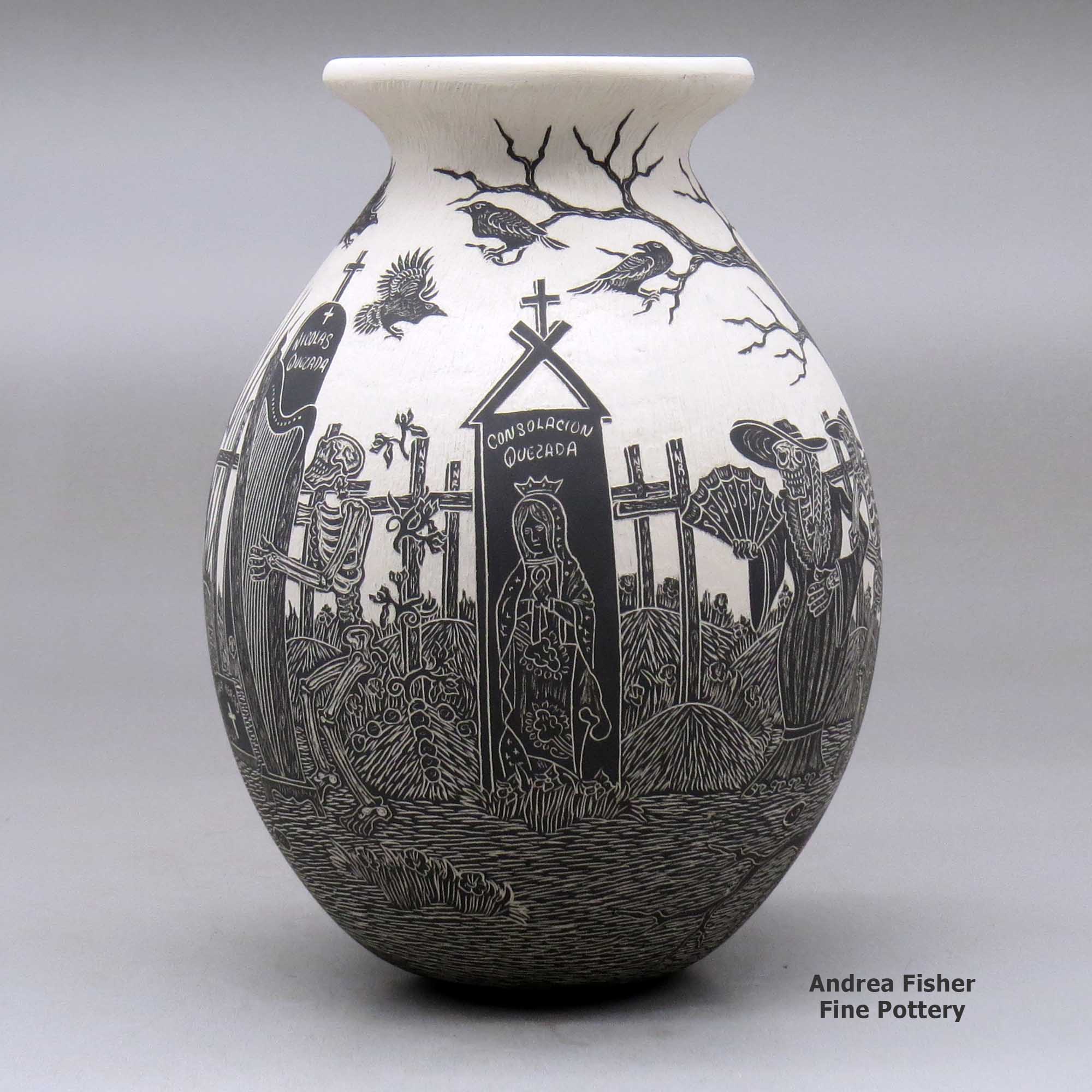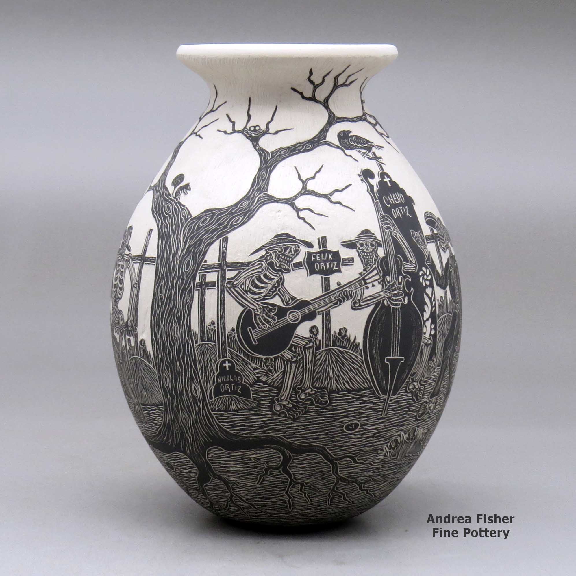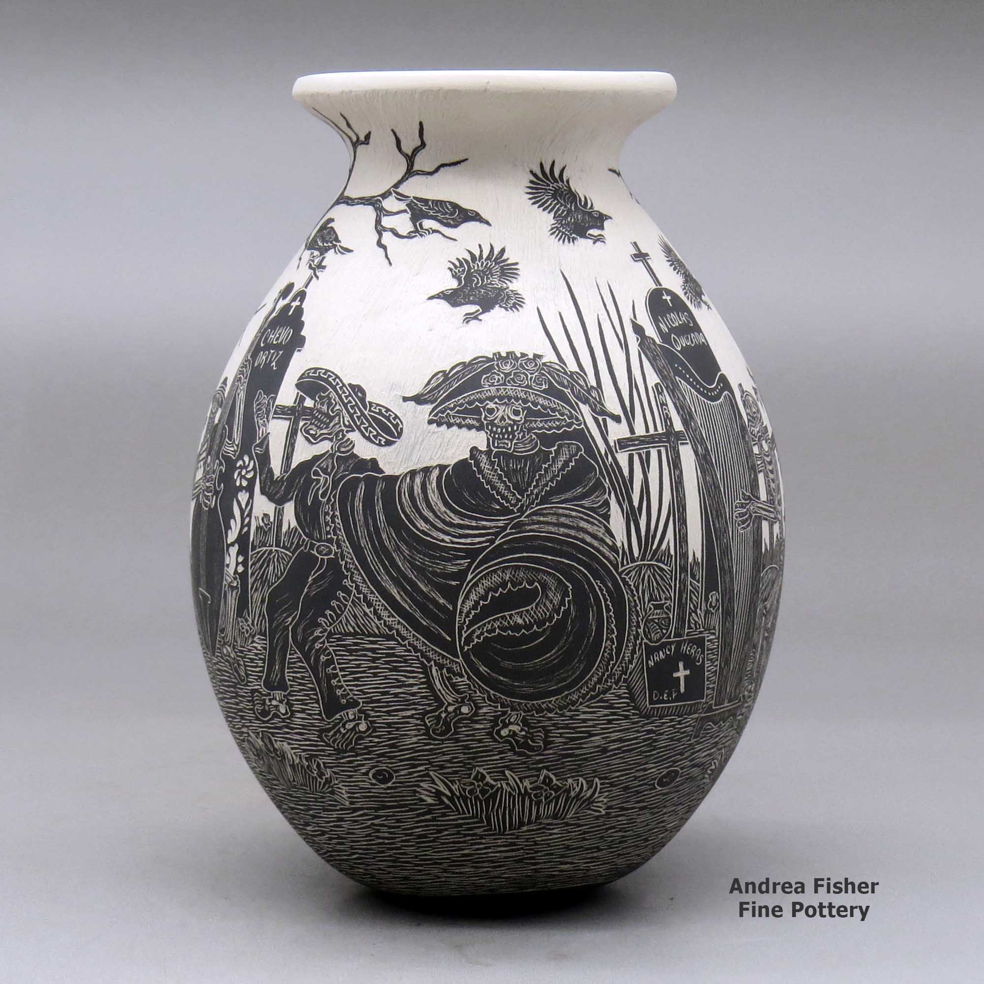 Born in 1984, Hector Javier Martinez sprang onto the Mata Ortiz pottery scene around 2008 with his distinctive style of black and white pots incised with Day of the Dead and Night of the Dead motifs. Those designs resulted from a comment made to him by Steve Rose (a well-known American pottery dealer).