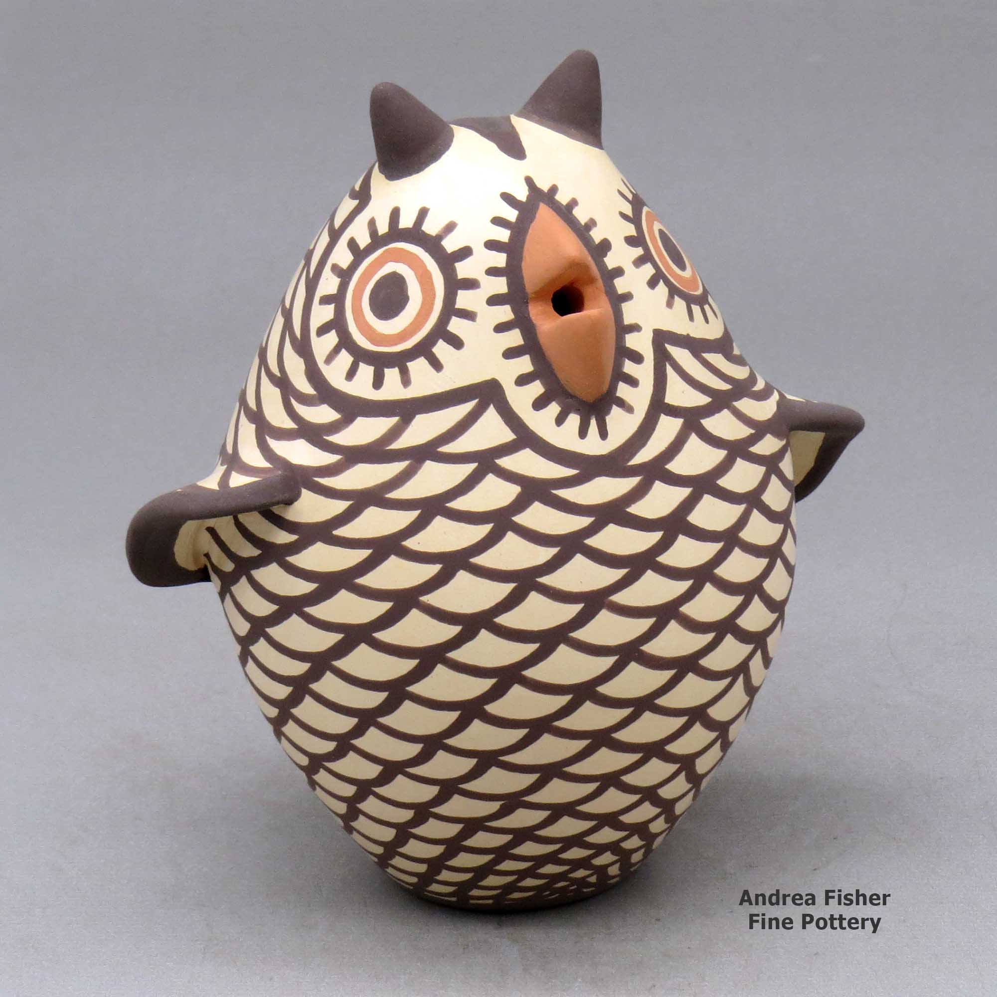 A polychrome owl figure made by Carlos Laate of Zuni