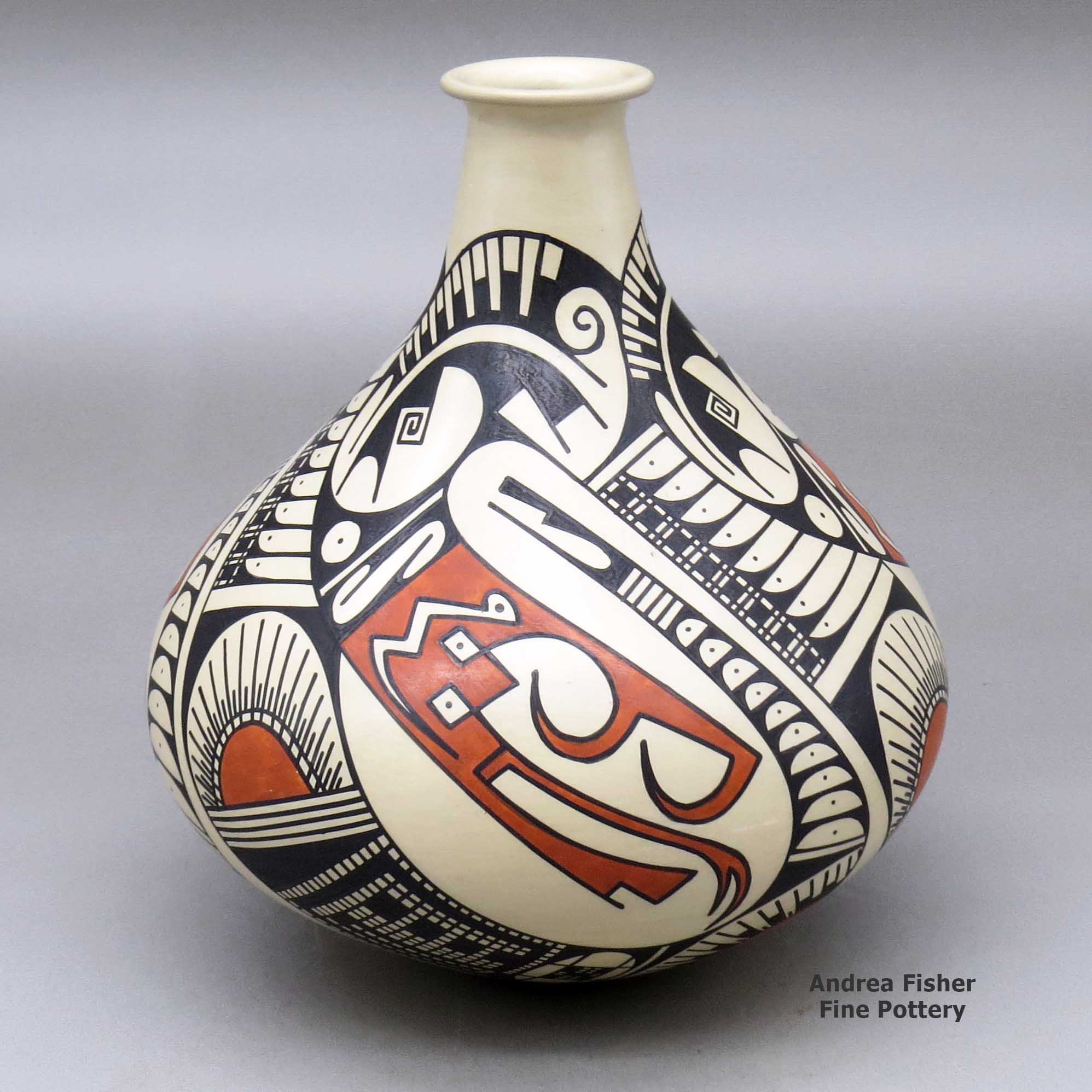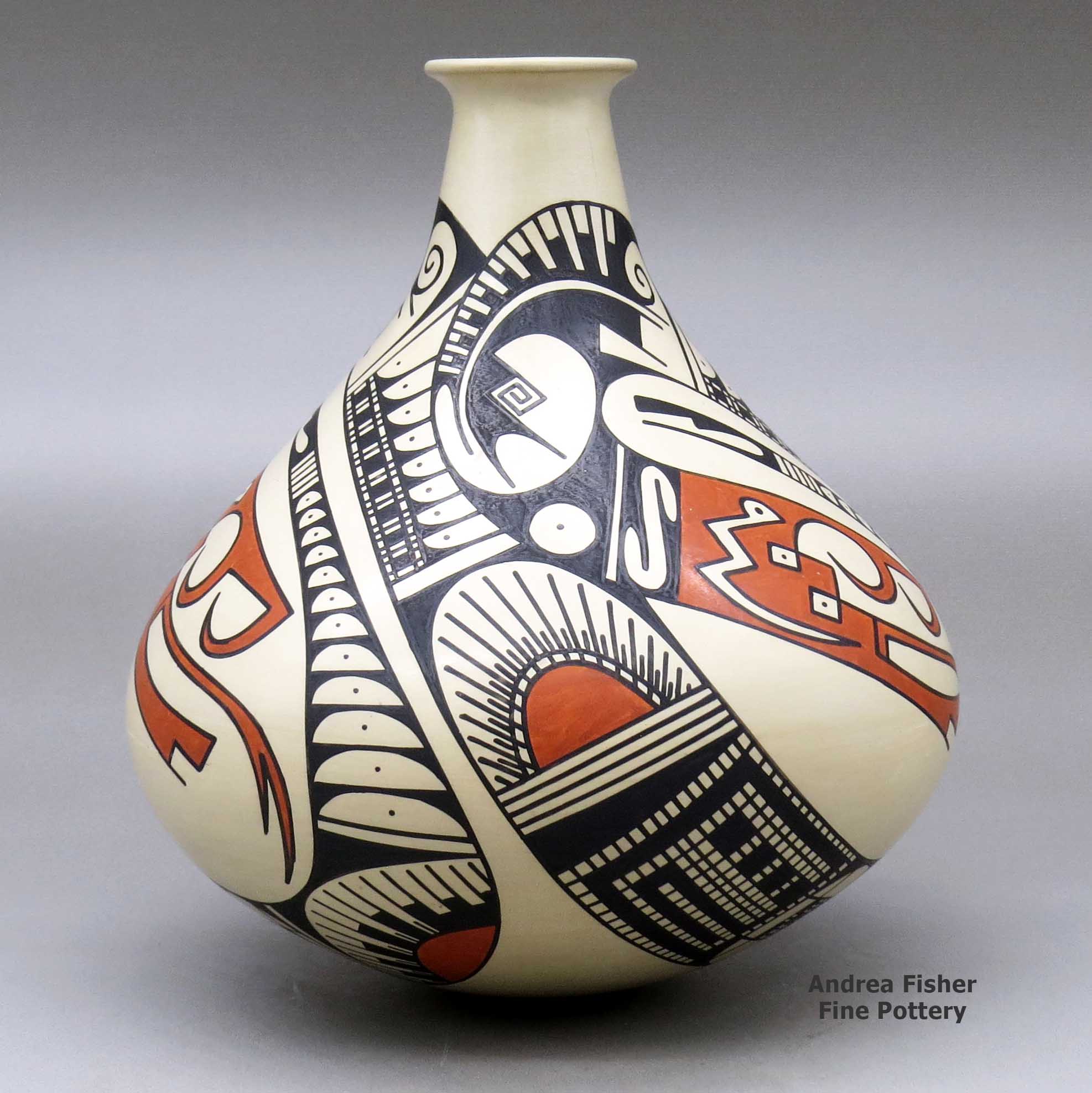 Juan is also the progenitor of the "Quezada style," a design style that incorporates whitespace into the overall design. In contradistinction to that is the "Porvenir style," originated by potters in the Porvenir neighborhood of Mata Ortiz. The Porvenir style essentially decorates every centimeter of a pot's surface, leaving little-to-no whitespace.