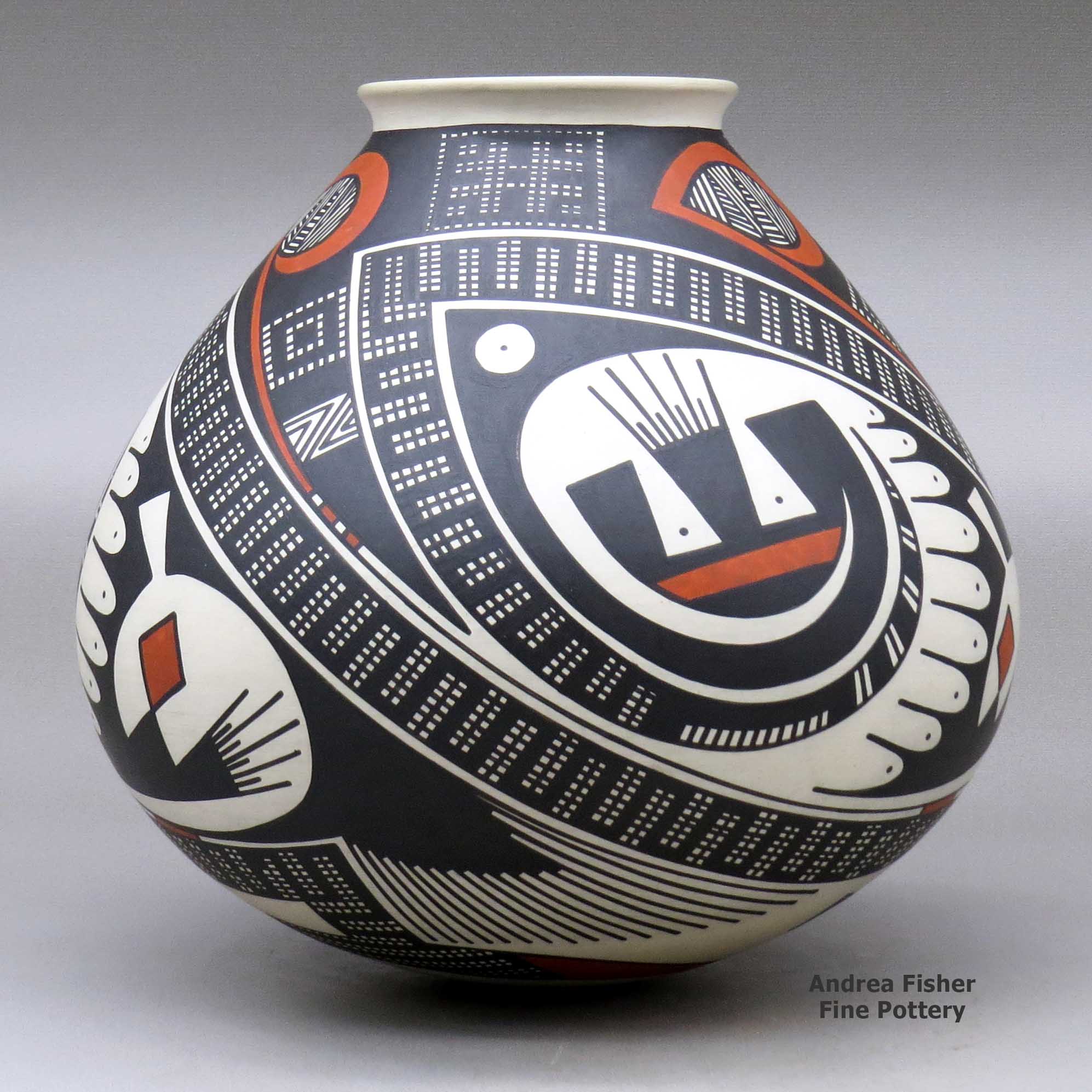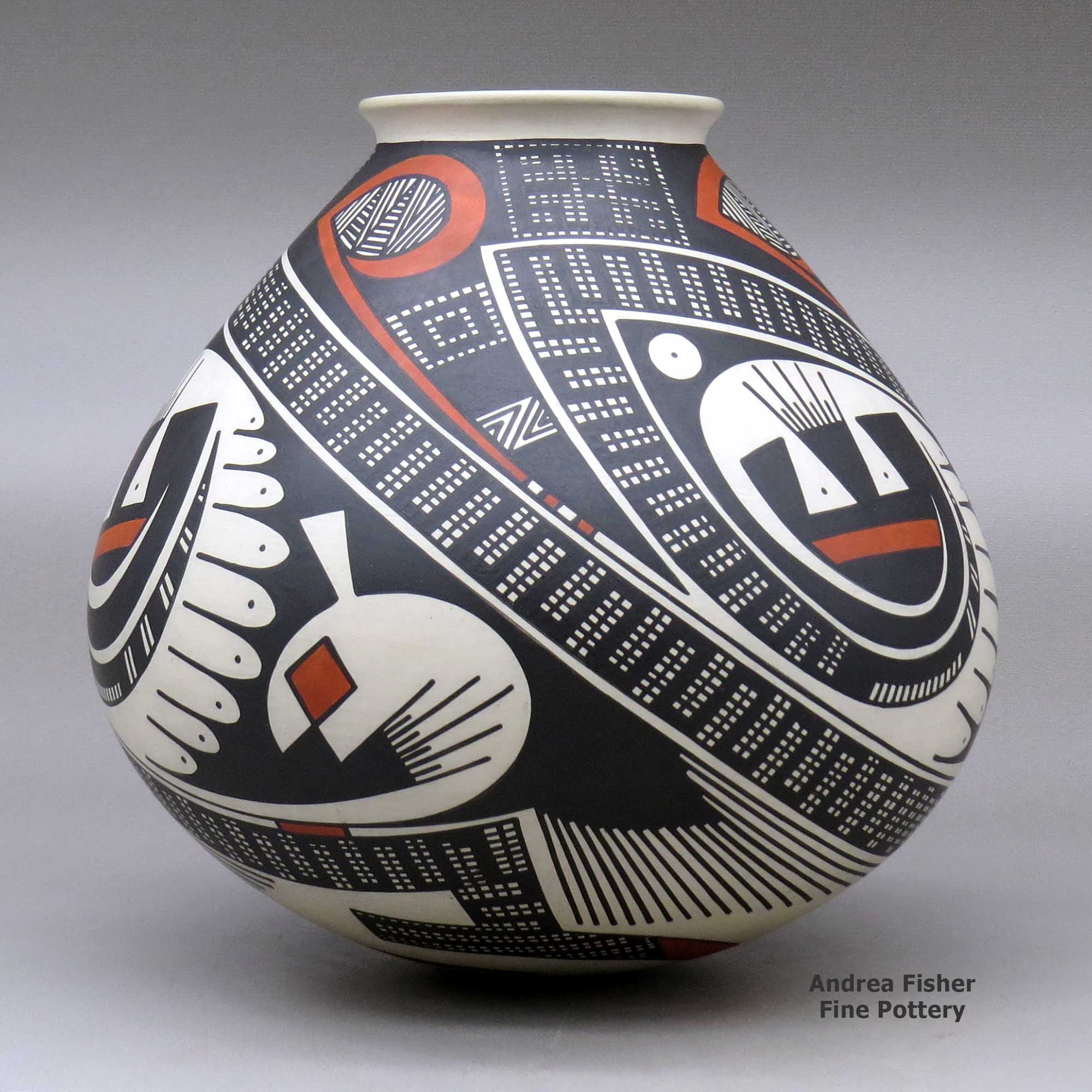 Juan is also the progenitor of the "Quezada style," a design style that incorporates whitespace into the overall design. In contradistinction to that is the "Porvenir style," originated by potters in the Porvenir neighborhood of Mata Ortiz. The Porvenir style essentially decorates every centimeter of a pot's surface, leaving little-to-no whitespace.