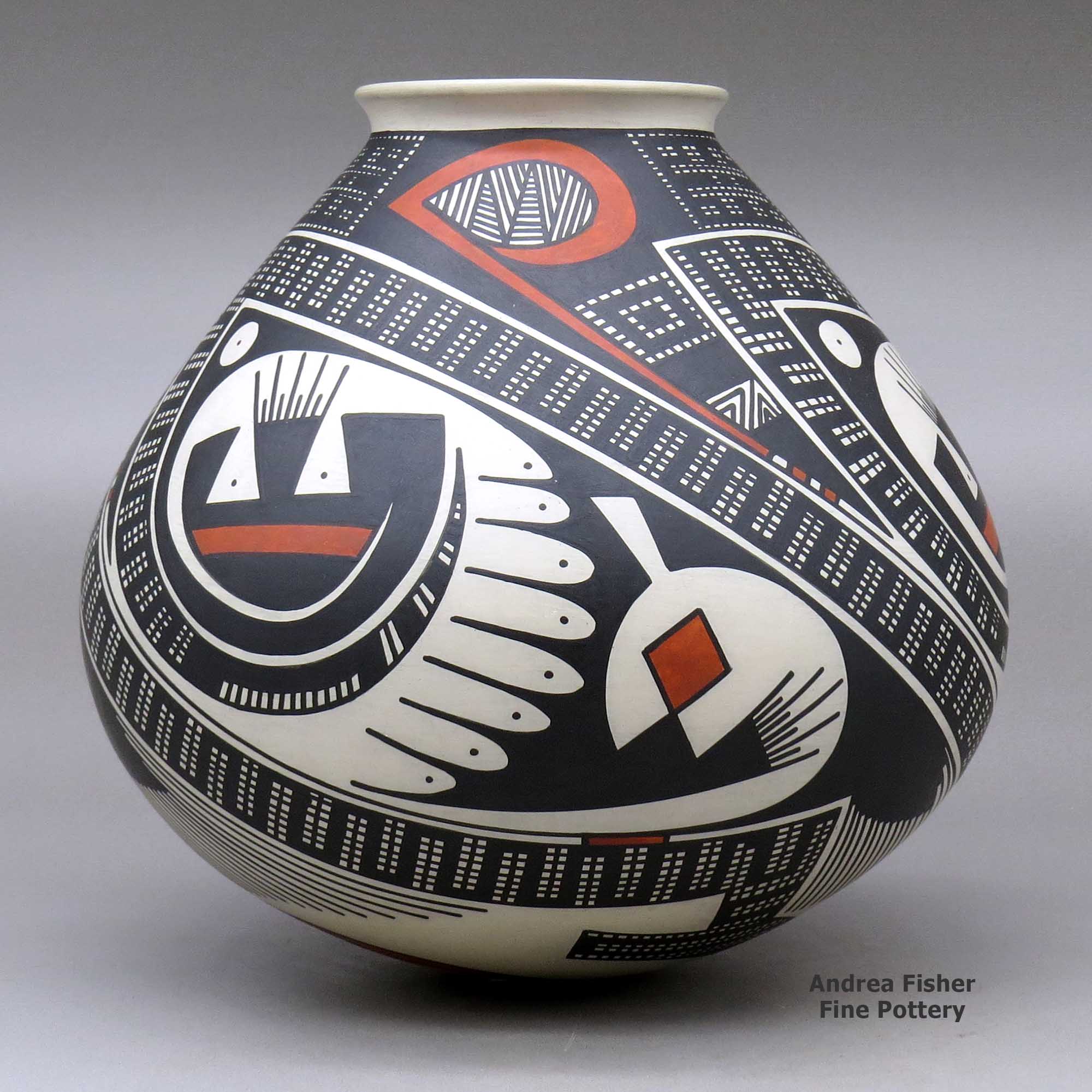 A jar with a flared rim and decorated with a three panel geometric design made by Juan Quezada Sr of Mata Ortiz and Casas Grandes