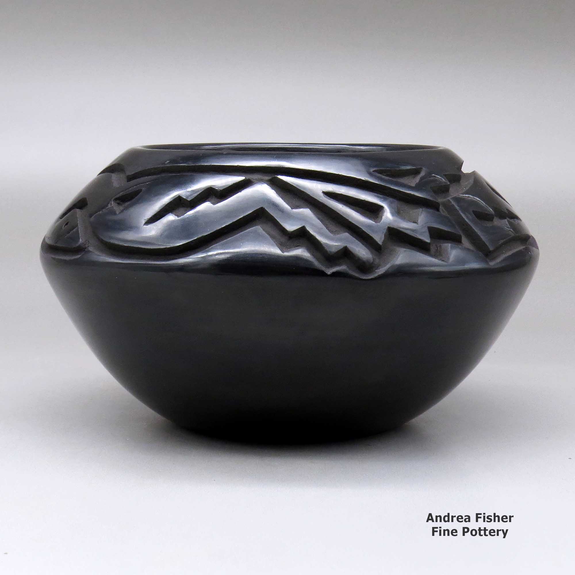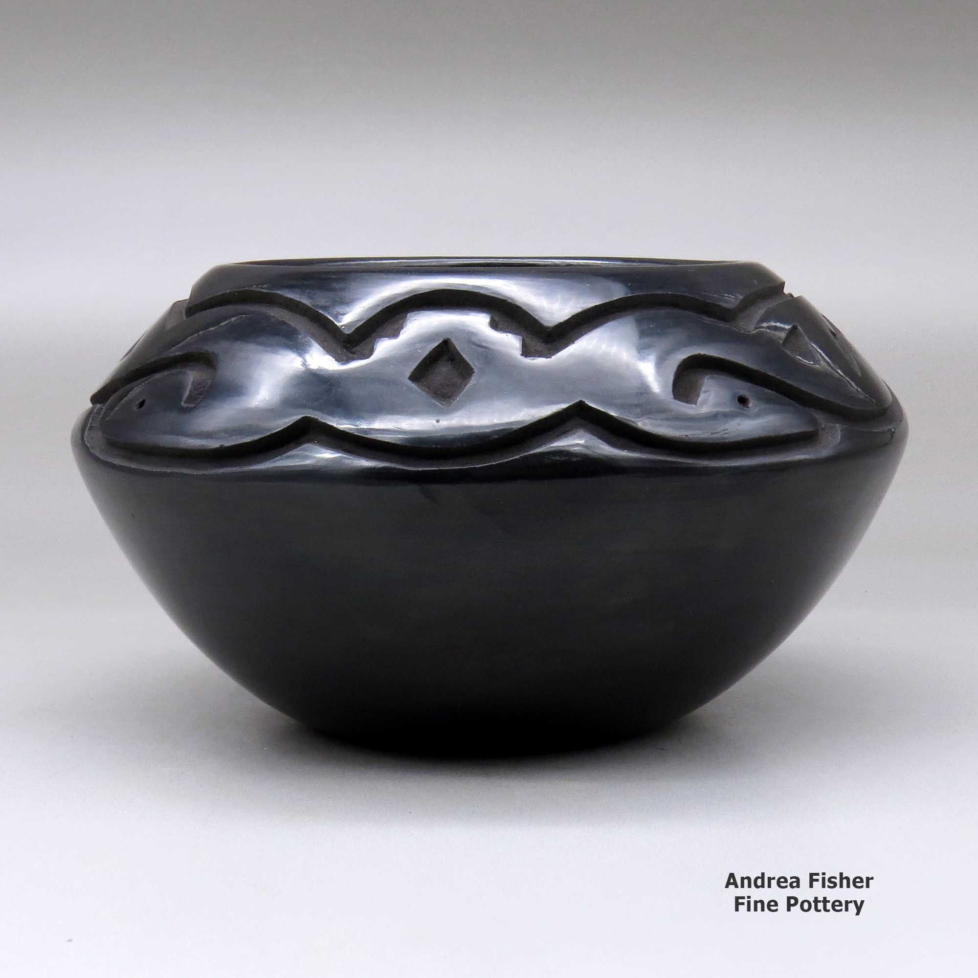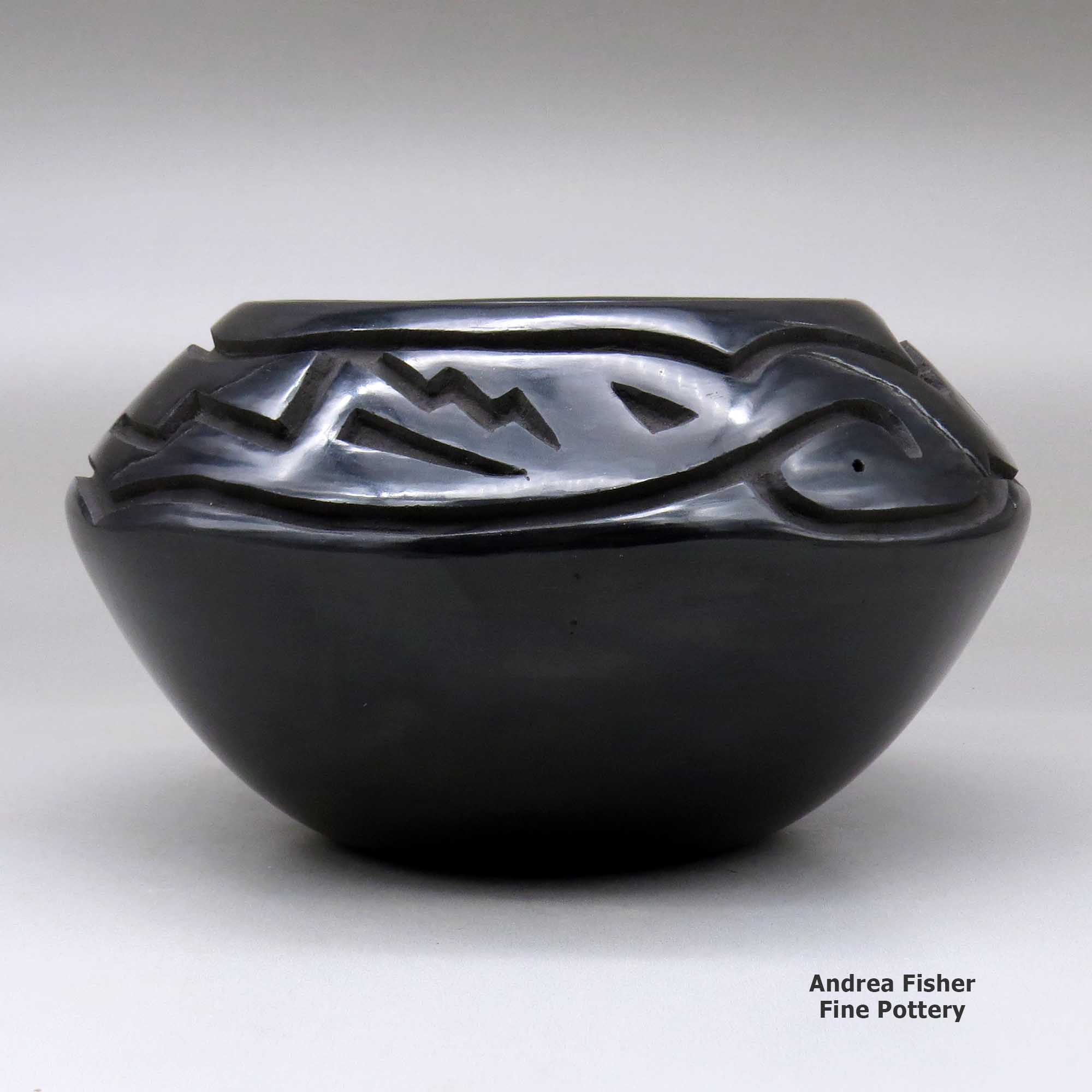 Chris works in both black and red pottery styles, specializing in large jars and low shouldered bowls. His pots are characterized by bold carving and fine stone polishing. Over the years Chris has developed his own unique style of carving the avanyu (the water serpent of the Santa Clara Tewa people). He has also elaborated on the forms he learned from his grandmother, creating his own designs that also incorporate eagle feathers and other symbols of his culture.
