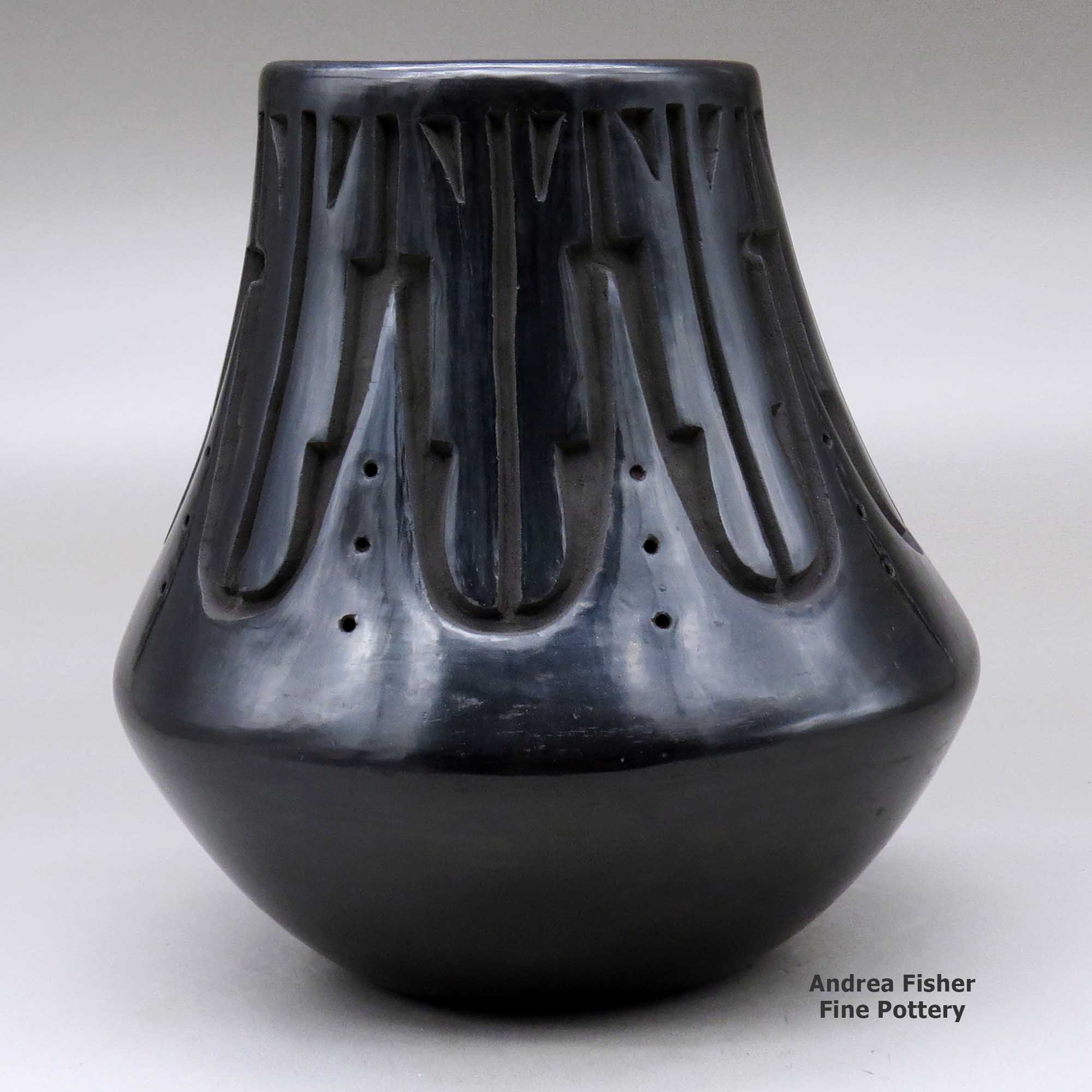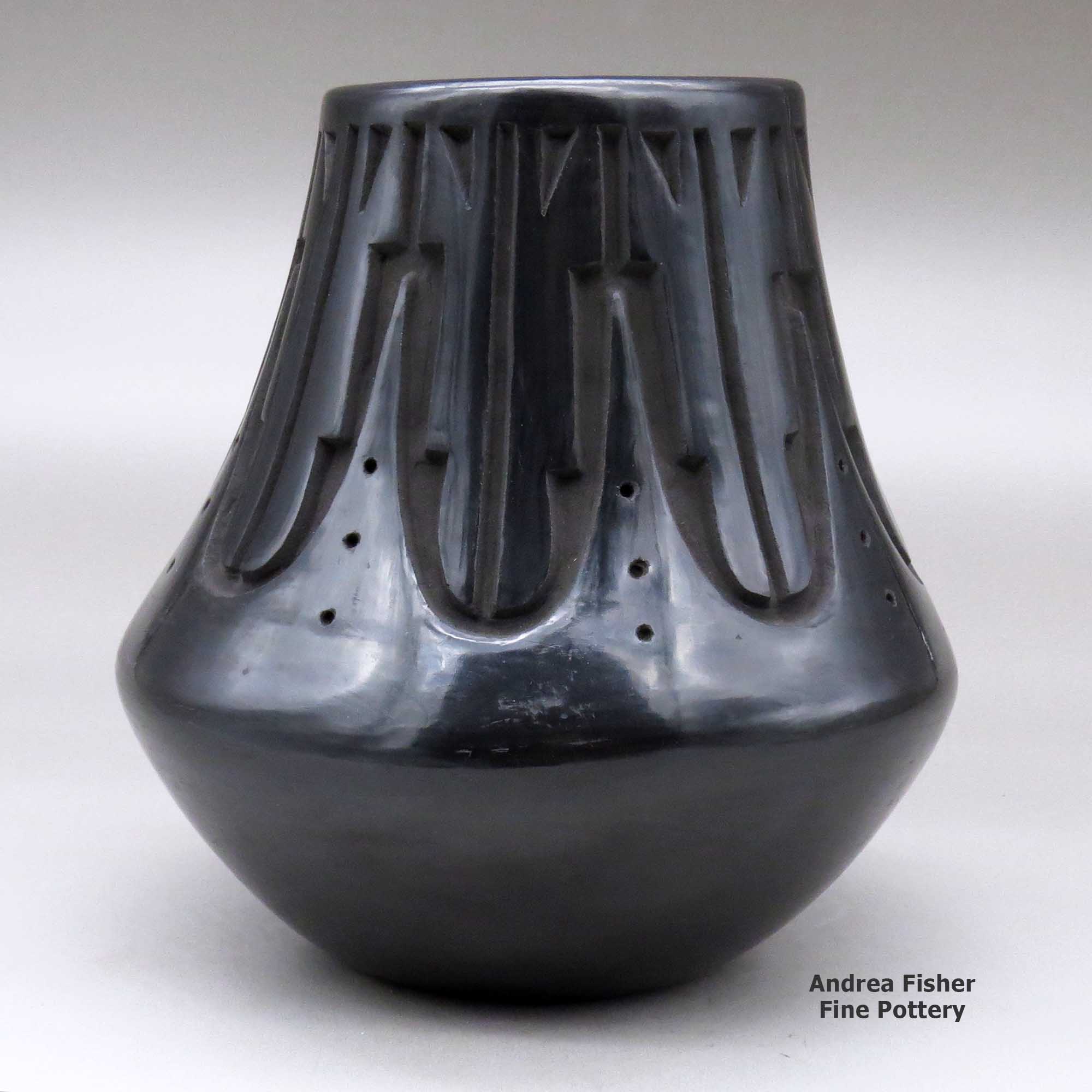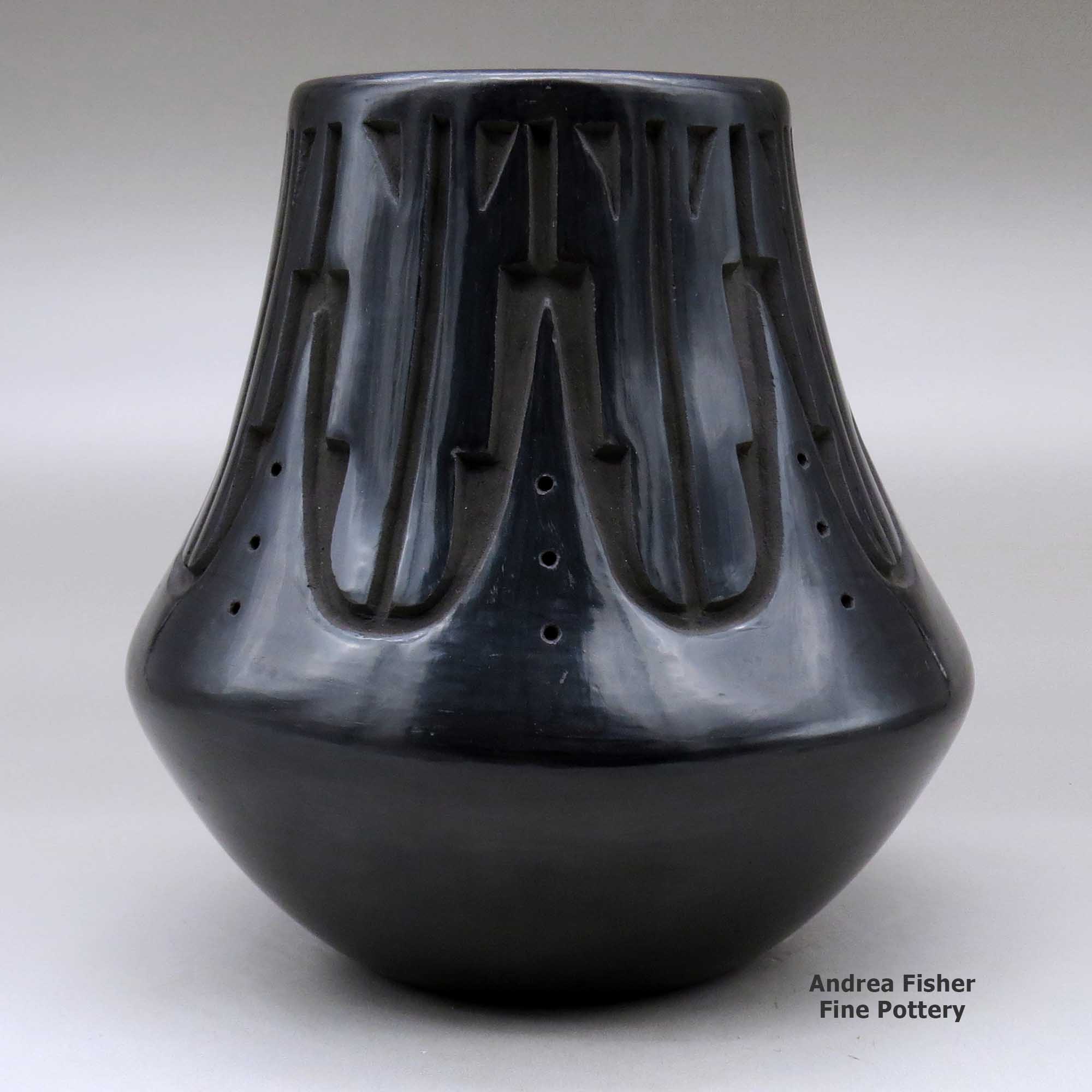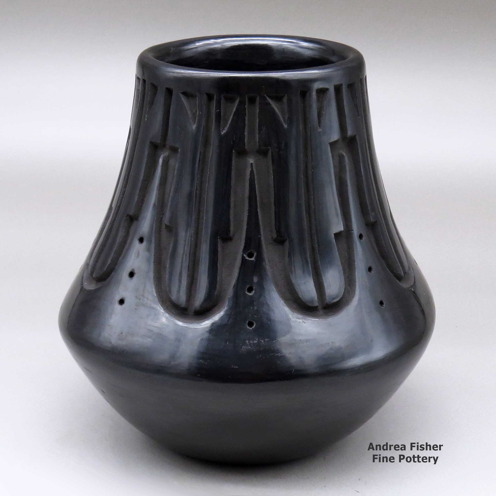 Chris works in both black and red pottery styles, specializing in large jars and low shouldered bowls. His pots are characterized by bold carving and fine stone polishing. Over the years Chris has developed his own unique style of carving the avanyu (the water serpent of the Santa Clara Tewa people). He has also elaborated on the forms he learned from his grandmother, creating his own designs that also incorporate eagle feathers and other symbols of his culture.