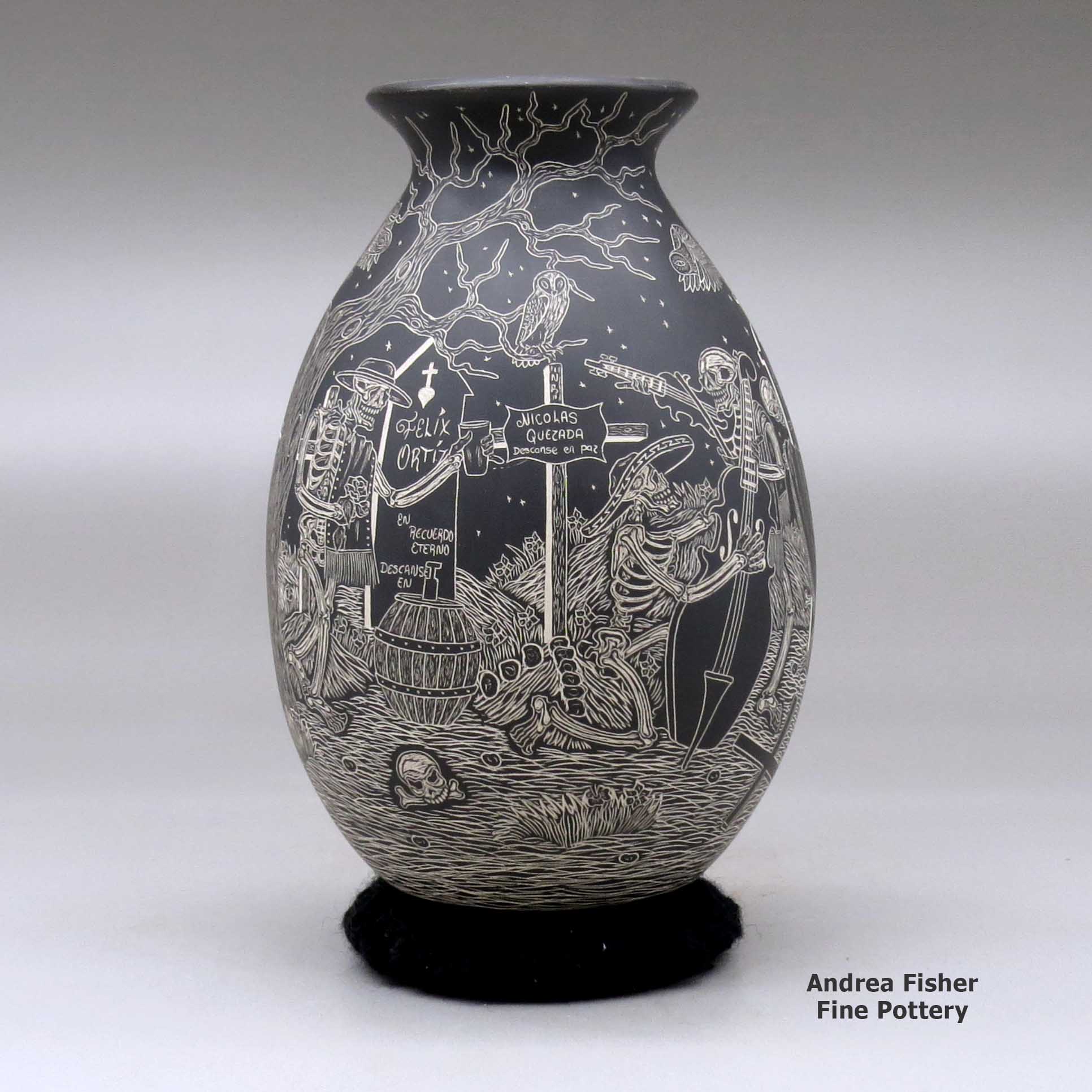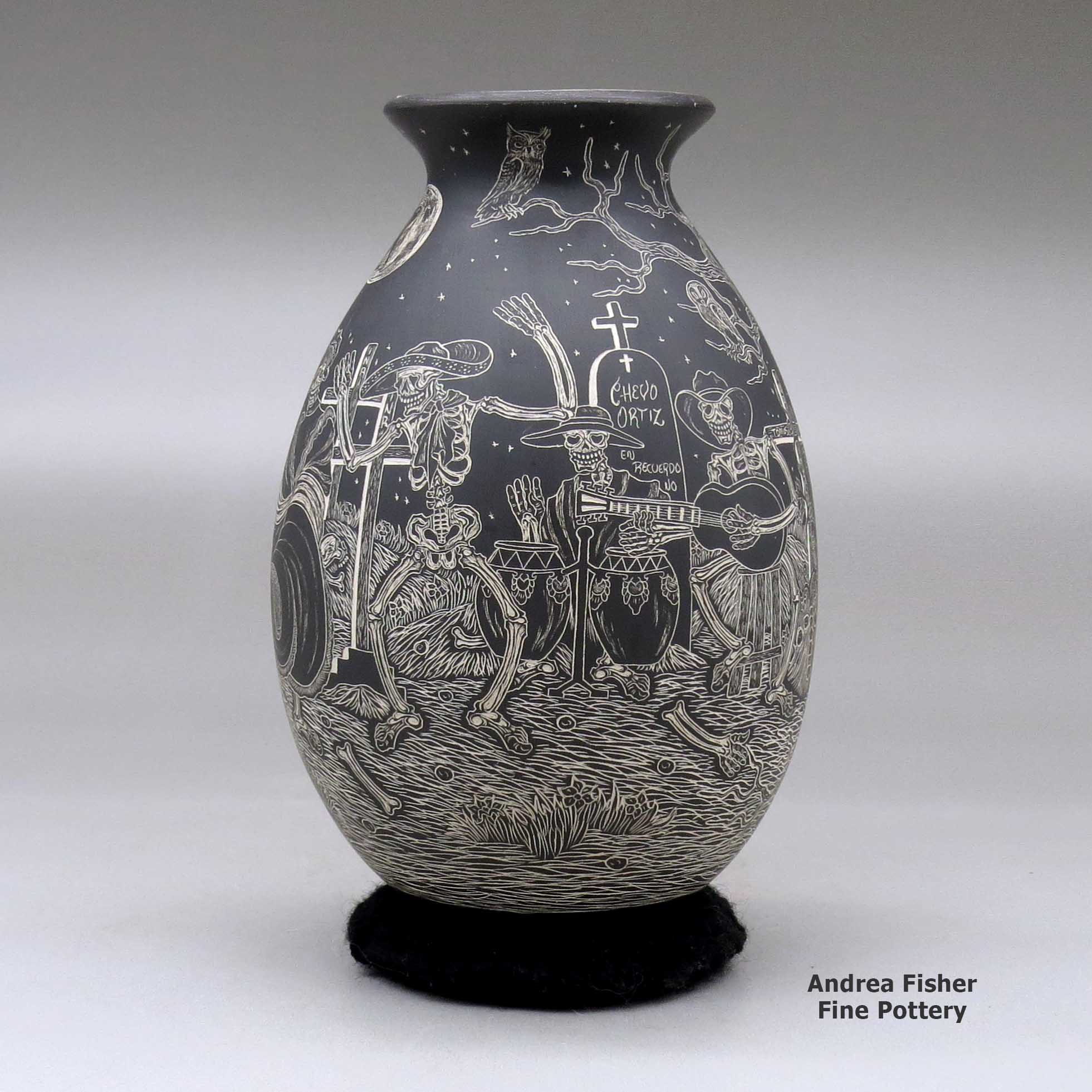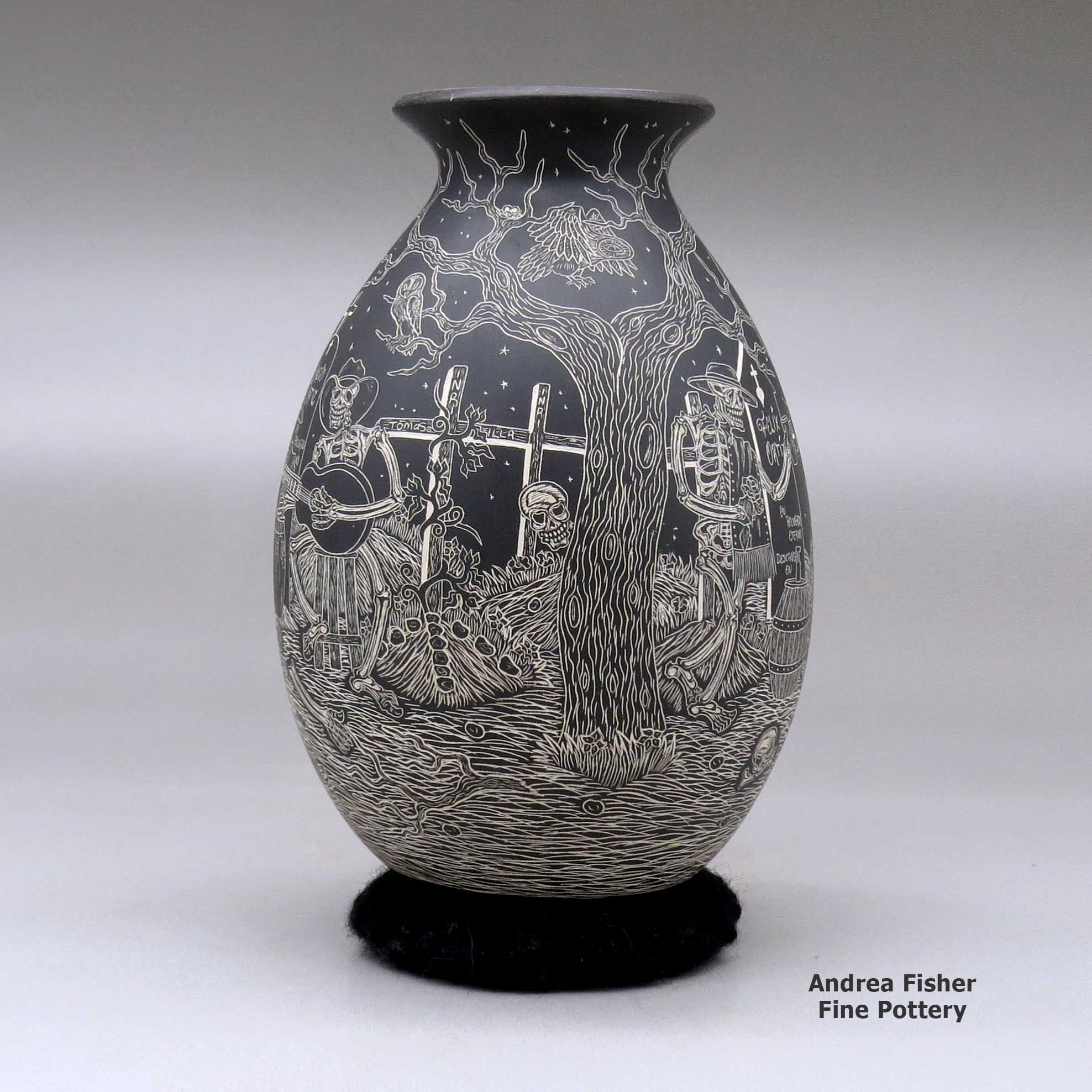 Hector Javier Martinez, Mata Ortiz and Casas Grandes, A black on white jar decorated with a sgraffito Night of the Dead at the Cemetery design