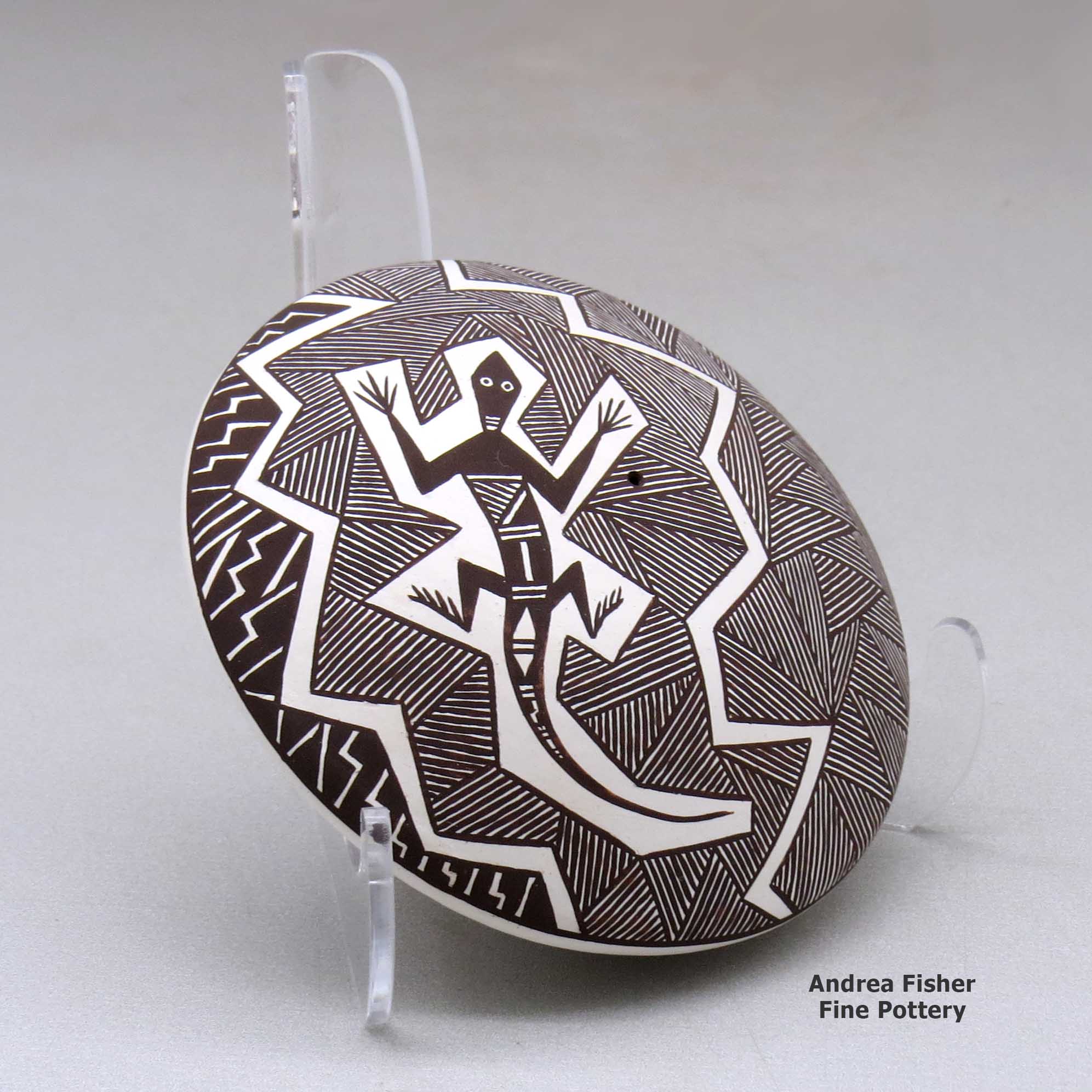 Rebecca Lucario, Acoma, A black on white seed pot decorated on top with a lizard, fineline and geometric design