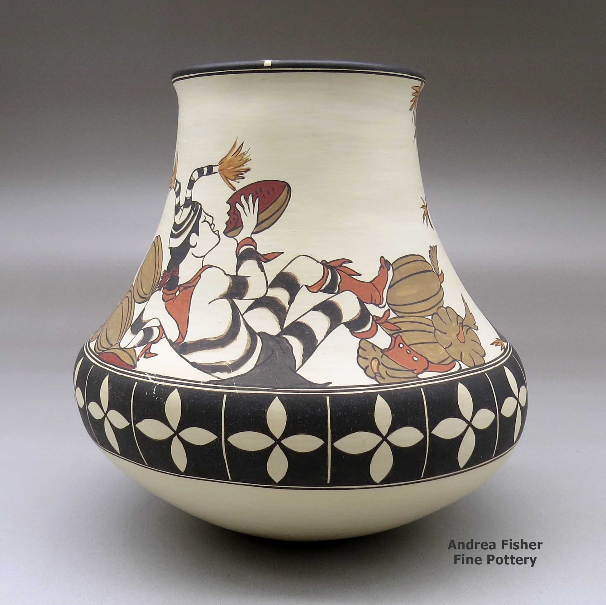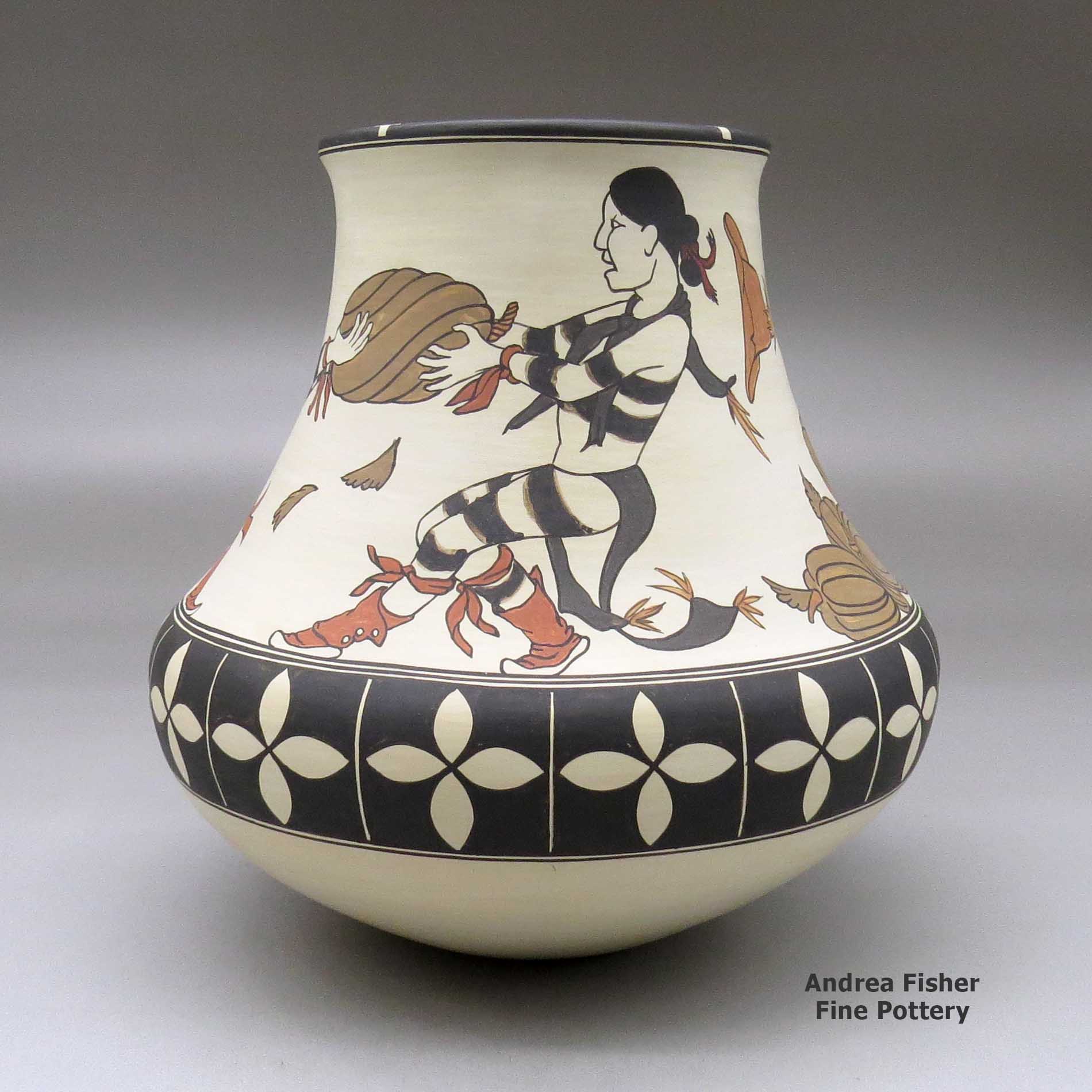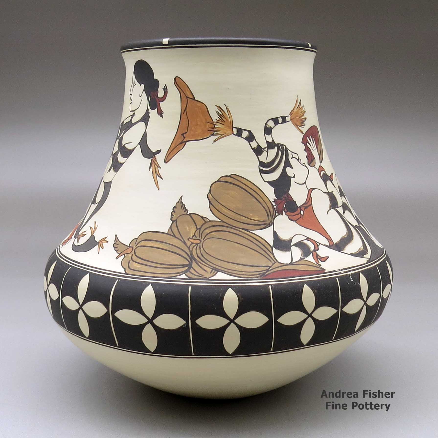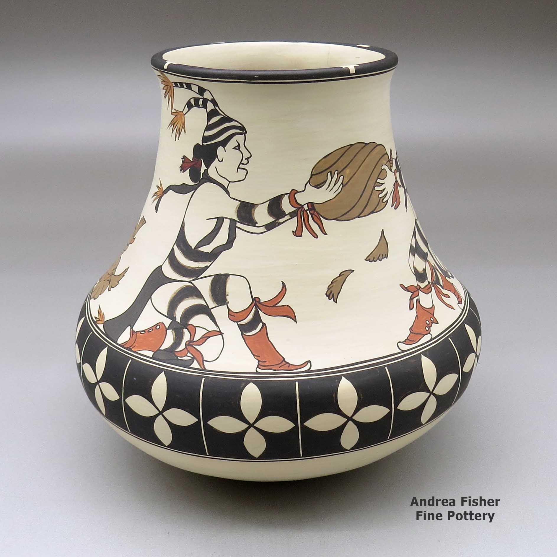 Lois's specialty is polychrome pottery made the way it used to be at Santa Clara, before the carving and sgraffito processes took hold. Her designs are often depictions of scenes from pueblo life, adorned with appropriate geometrics.