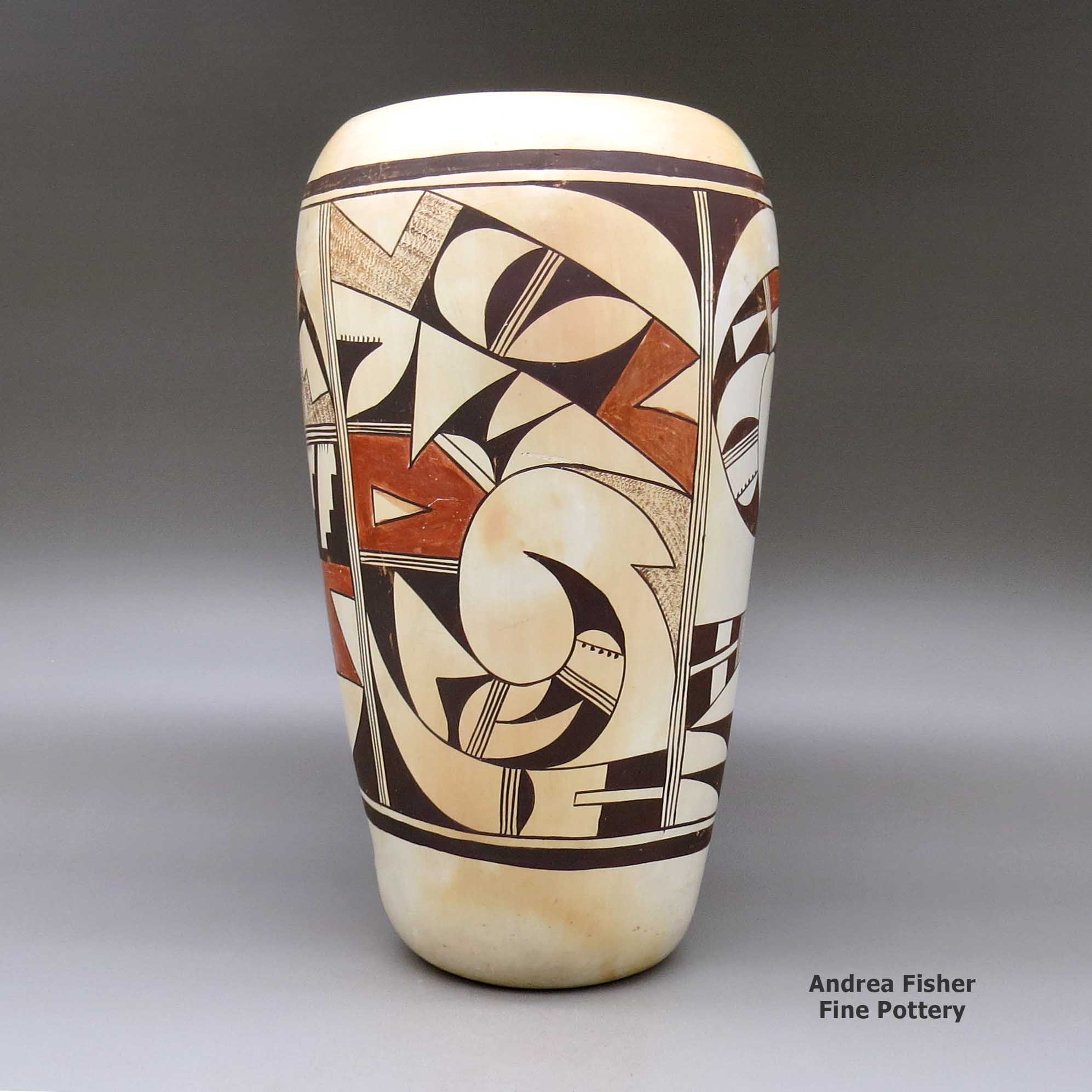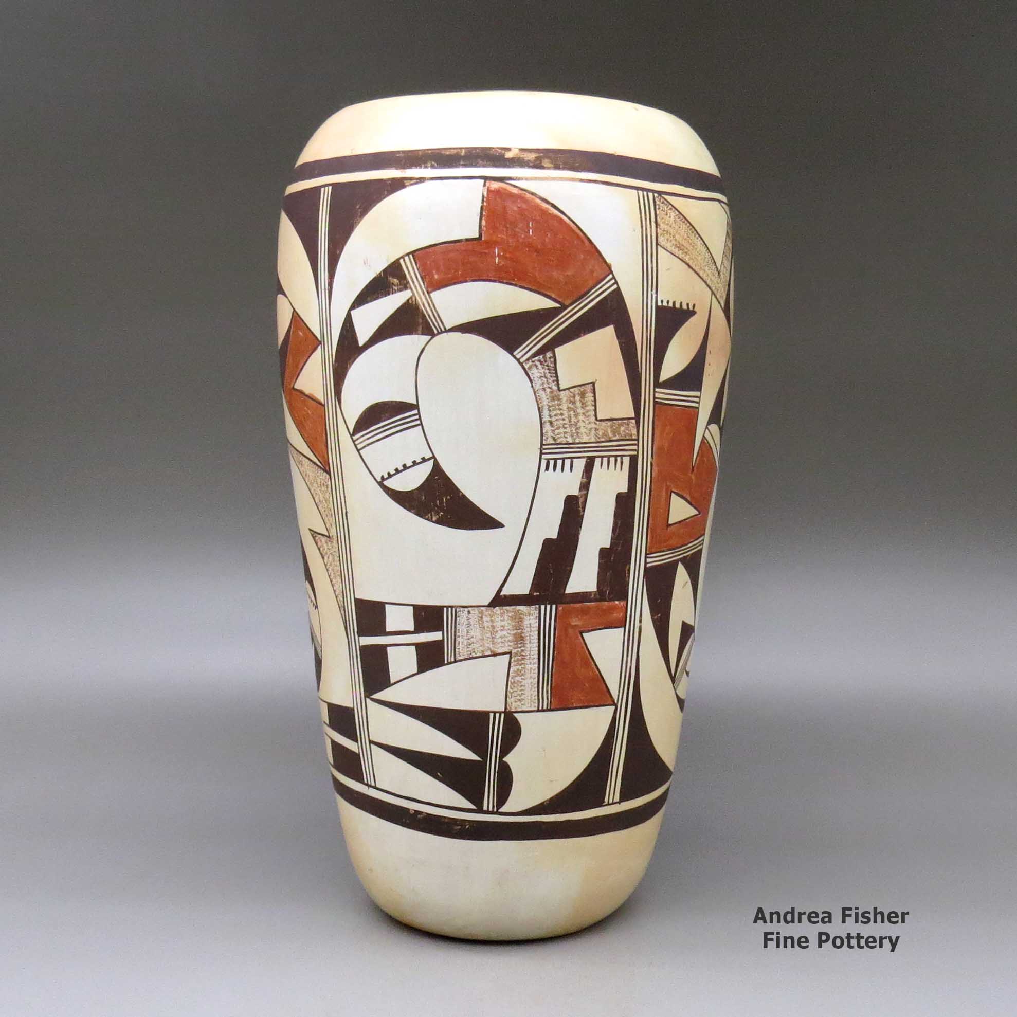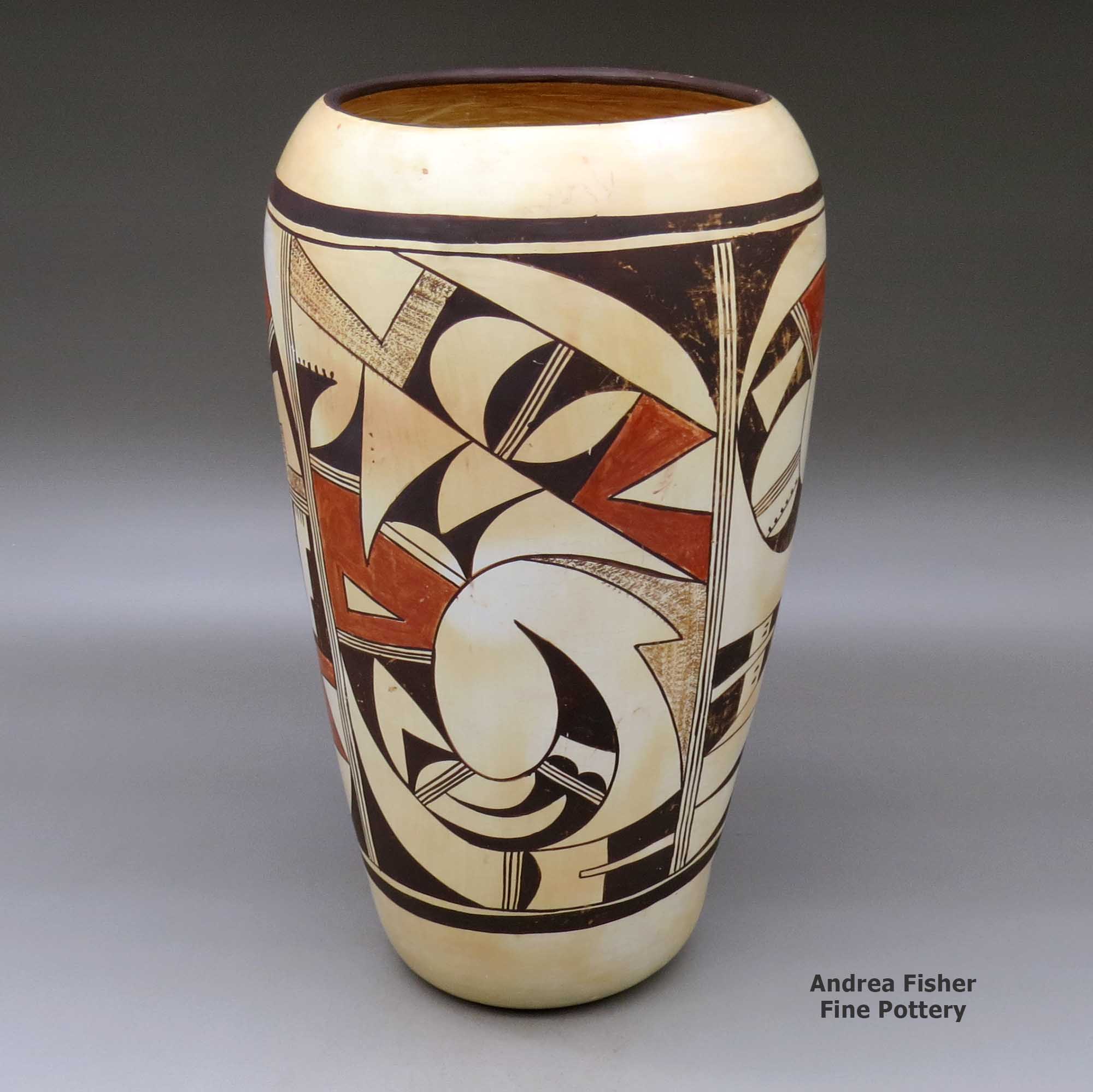 Today's Hopi pottery tends to be a white, yellow, orange or buff colored background decorated with designs in red and black mineral paints. Painted designs sometimes fill the entire space, often with an asymmetrical and symmetrical design. Most of the symbology painted on Hopi pottery is themed with "bird elements:" eagle tails, feathers, bird wings and migration patterns. Many Hopi, Hopi-Tewa and Tewa potters are members of the Corn Clan and their annual religious cycle revolves around the seasons of corn. The vast majority of today's Hopi pottery shapes and the designs painted on them are obvious descendants of the work of Sikyátki and Awat'ovi potters.