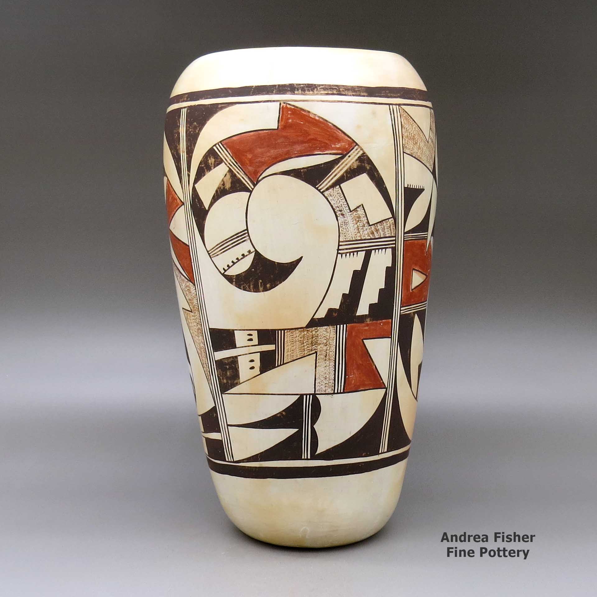 Paqua Naha was born into the Hopi-Tewa Kachina/Parrot Clan around 1890. Little is known of her childhood but she was producing pottery for the marketplace by the time she was 20 (about 1910). She produced pottery using several different colors for the body: white, red and yellow, with black and red decorations. Her favorite designs seem to have been parrots, feathers, birds, the mythic bird-hanging-from-sky-band, rain, water and Zuni-style scrolls. She's most famous for her white ware pieces, made with a process she developed and perfected only in the last three years of her life.