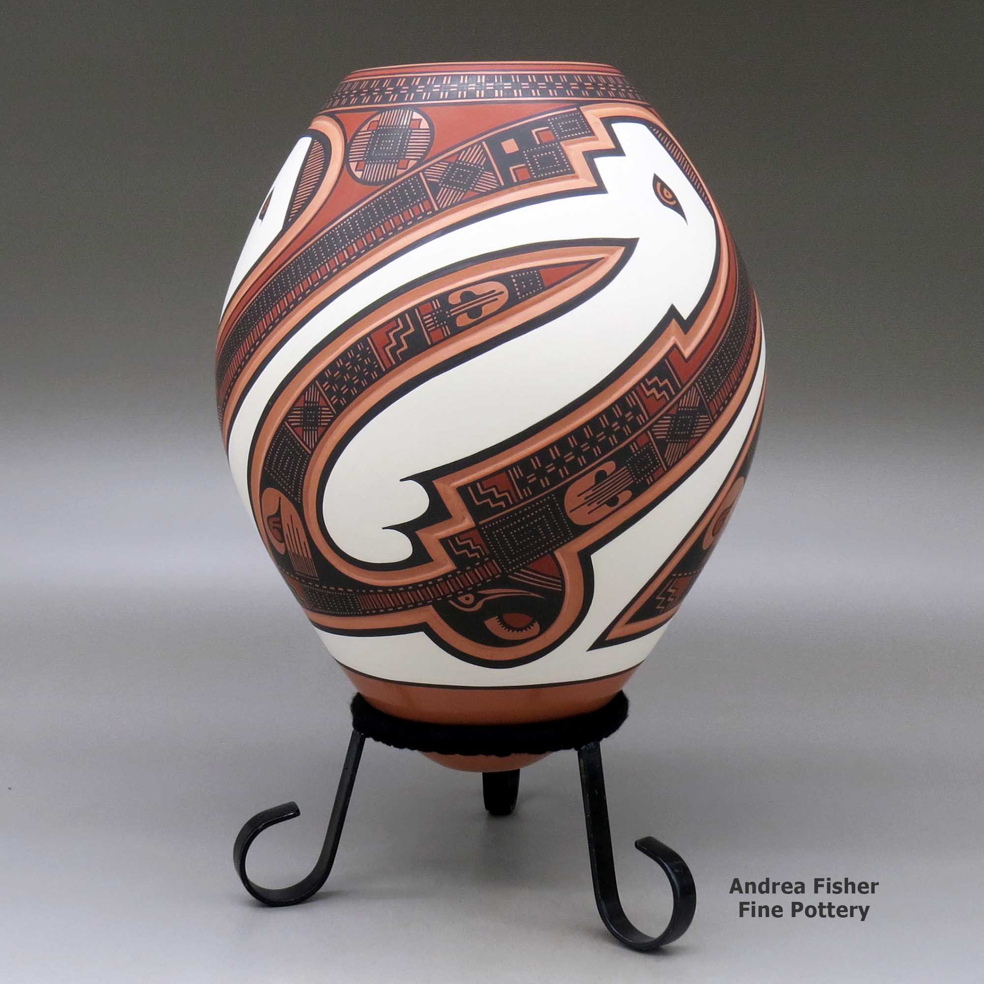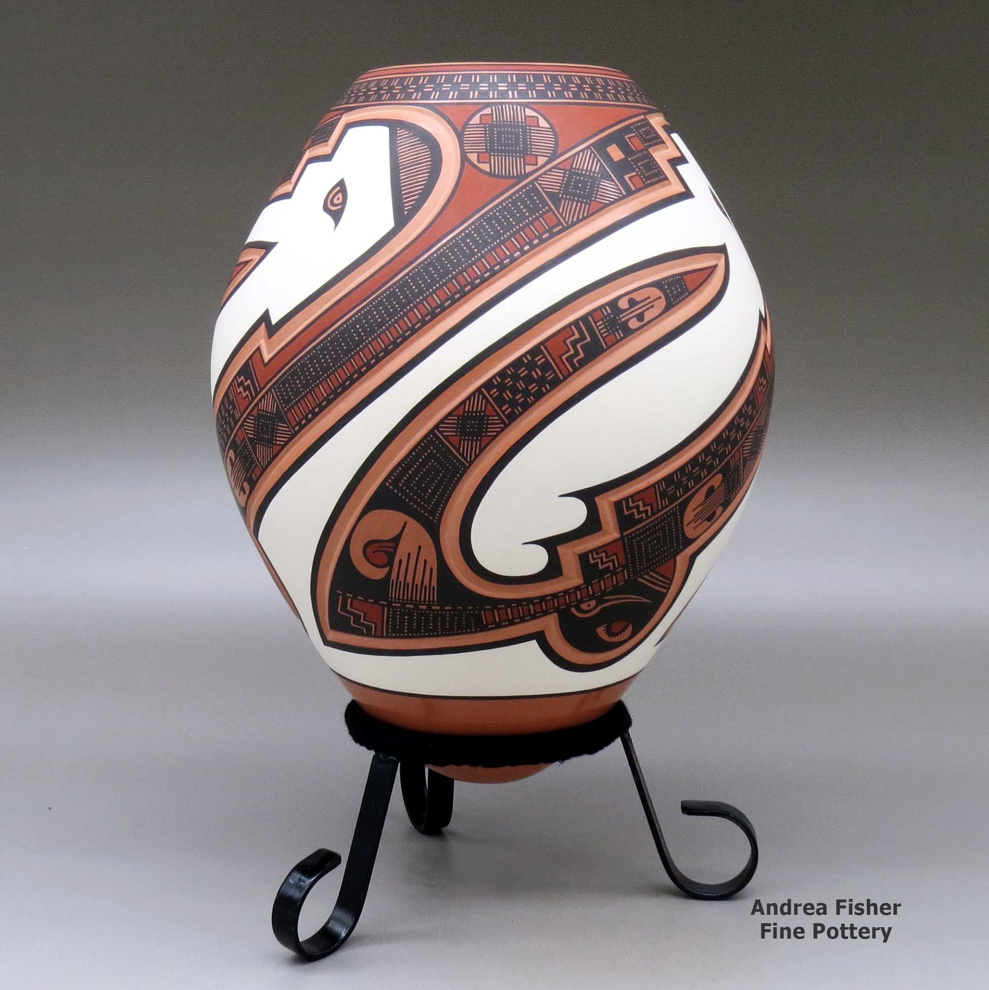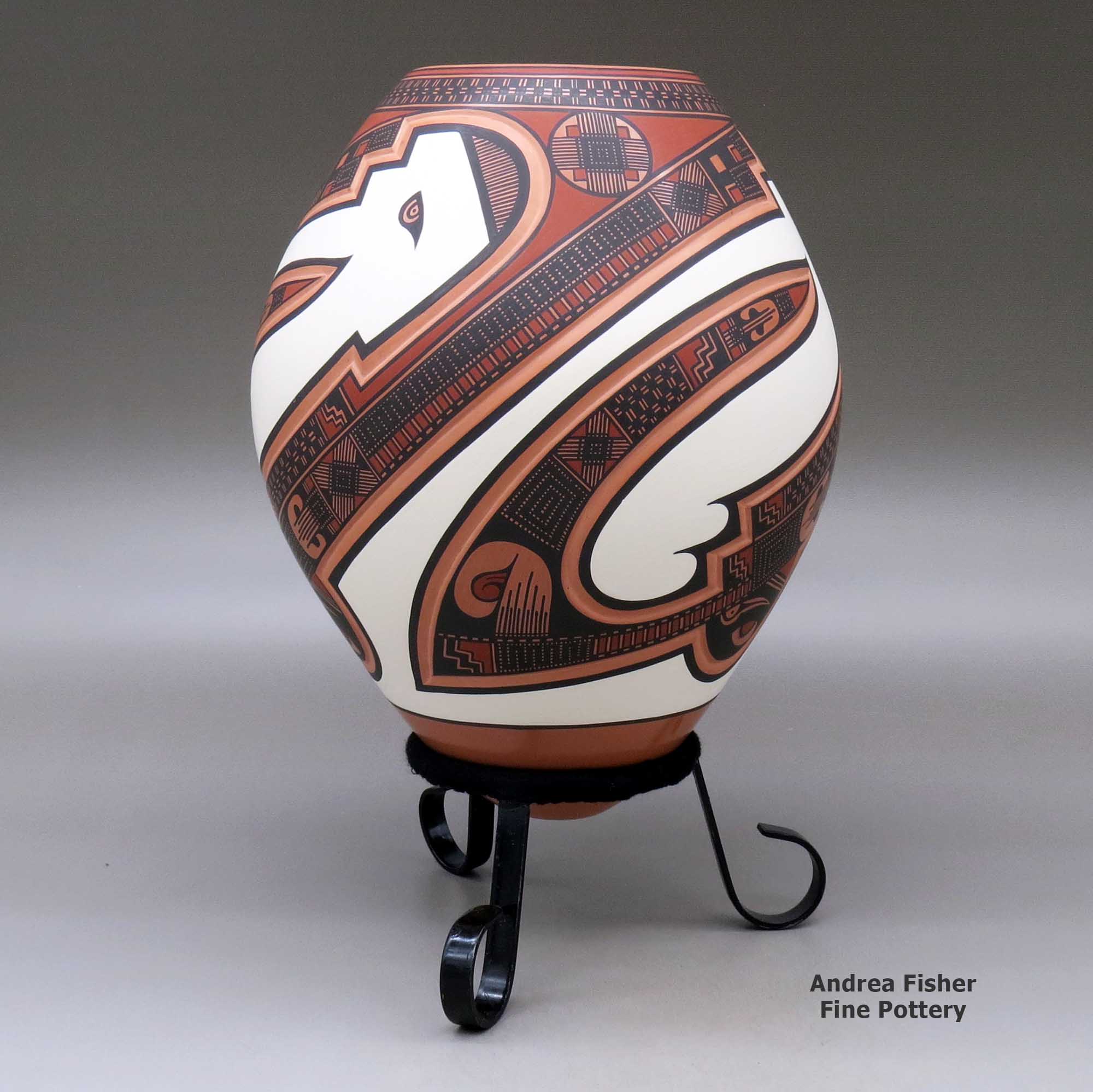 Octavio Tavo Silveira is a second-generation potter from the El Porvenir neighborhood in Mata Ortiz. Early in his pottery career he began to make a name for himself by making large pieces of exceptional quality. He seems to have liked making large pots with lids, small handles and lightly carved, boldly painted designs. His principal color mix was rose-pink, coral and flat black on a white-body vessel. His designs were very energetic and exuded motion. Then his work evolved into smaller, but no less elegant, vases and jars, still lightly carved, still brilliantly painted, still exquisitely shaped.