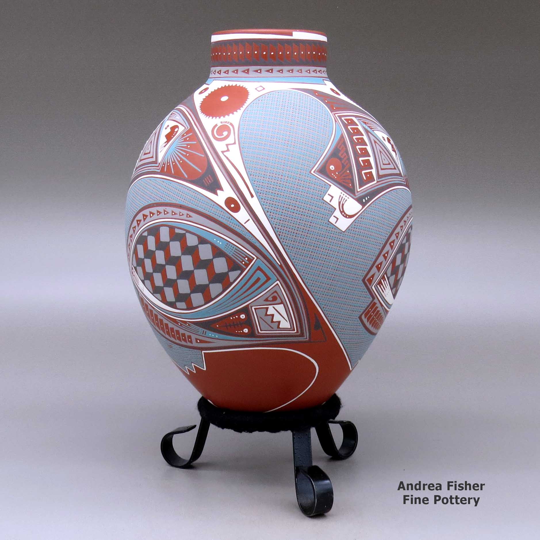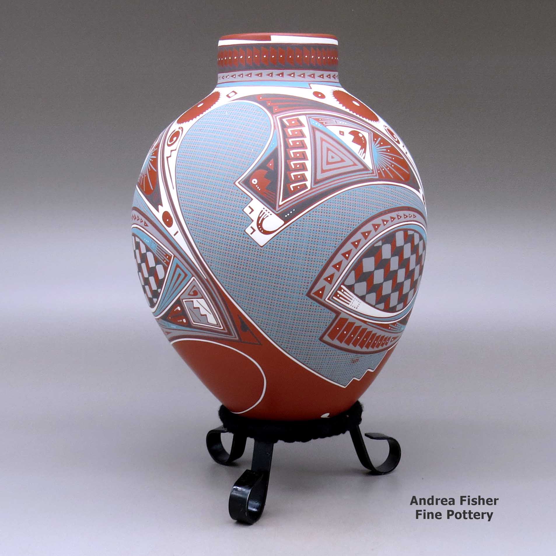 Rocio Silveira started polishing pottery for her father when she was still a young child in Mata Ortiz. Then he had her filling in the design outlines that he painted. When she was 18, she married Fabian Ortiz, the son of Nicolas Ortiz. At first, she was helping him to make his own pottery. Then once she'd gotten comfortable with doing the whole process herself, she was off on her own.