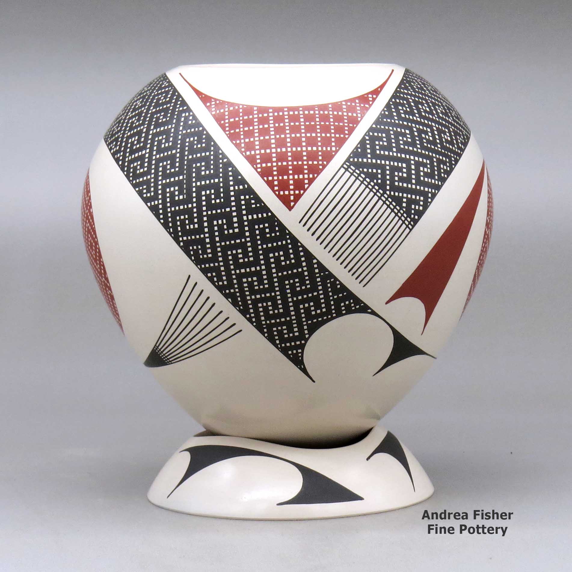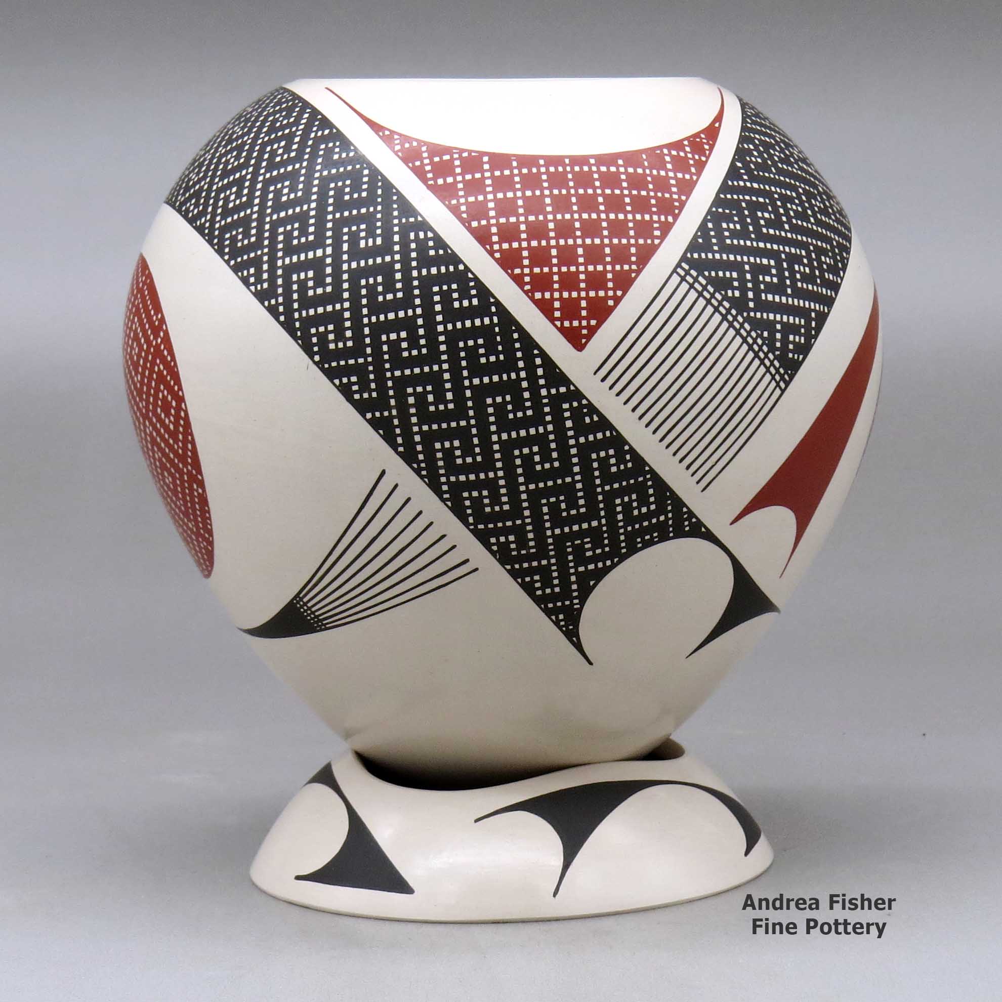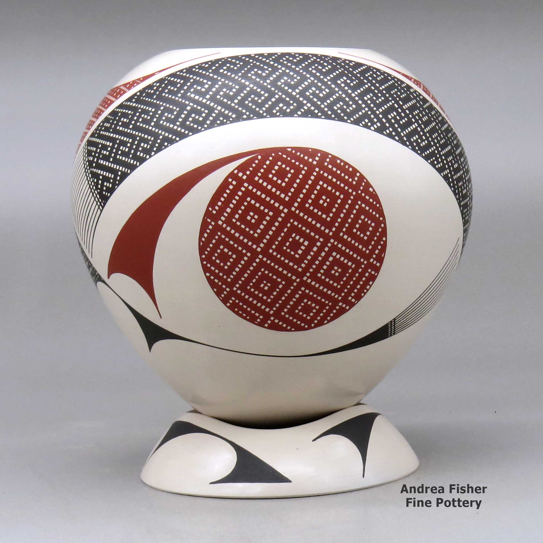 Elias began by painting standard Paquimé flowing geometric designs on standard pottery shapes but soon branched into painting combinations of animals, figures and geometrics on figures, effigies and deformed pots. His pottery also tends to have very thin walls, so thin that sanding them can be a problem. He works alone, doing everything from digging his own clay to making his pots to decorating and firing them. He says painting the designs is his favorite part of the process.