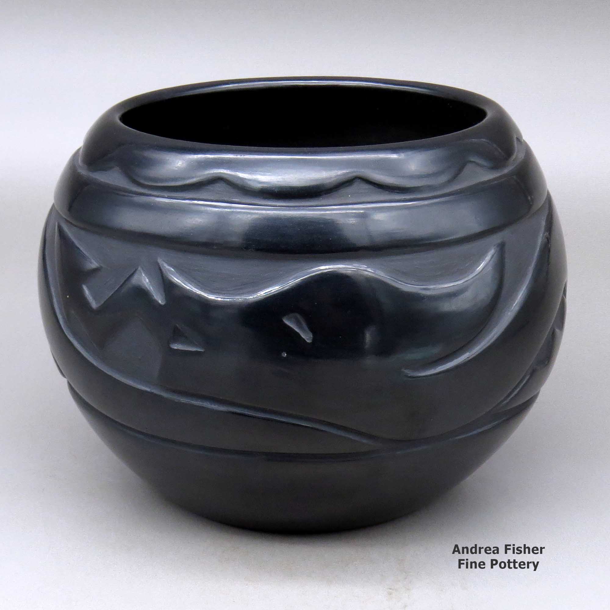 Born into Santa Clara Pueblo in May 1936, Mary Singer was the daughter of Pablita Chavarria. Among her siblings were Stella Chavarria, Florence Browning, Elizabeth Naranjo, Reycita Naranjo and Clara Shije. Pablita made sure all her kids learned how to make pottery as they were growing up. Mary excelled at it. She mostly made very large blackware jars and liked to carve them with bear claws, avanyus, inverted feathers and terraced clouds.