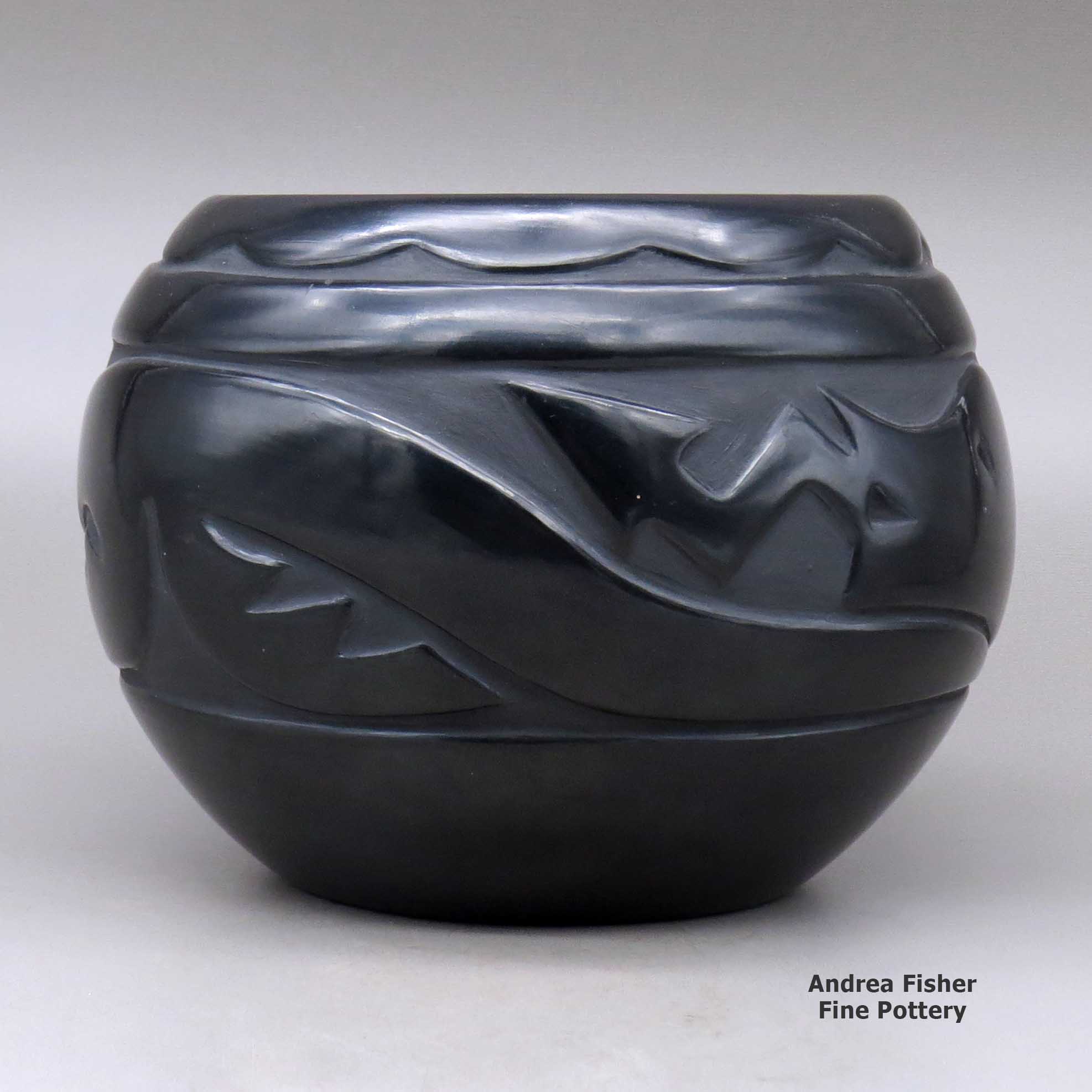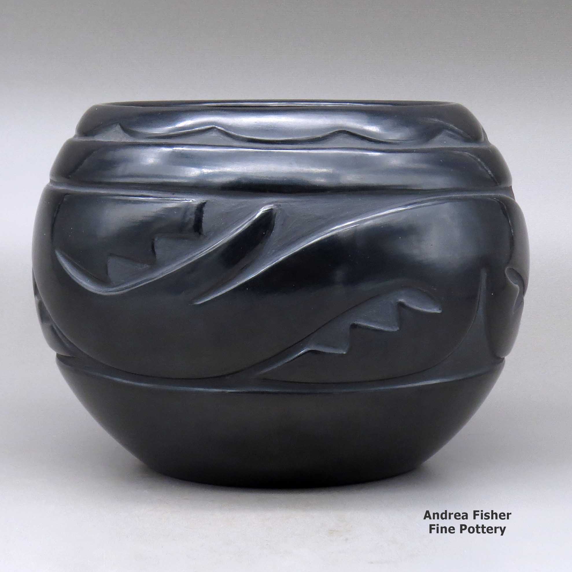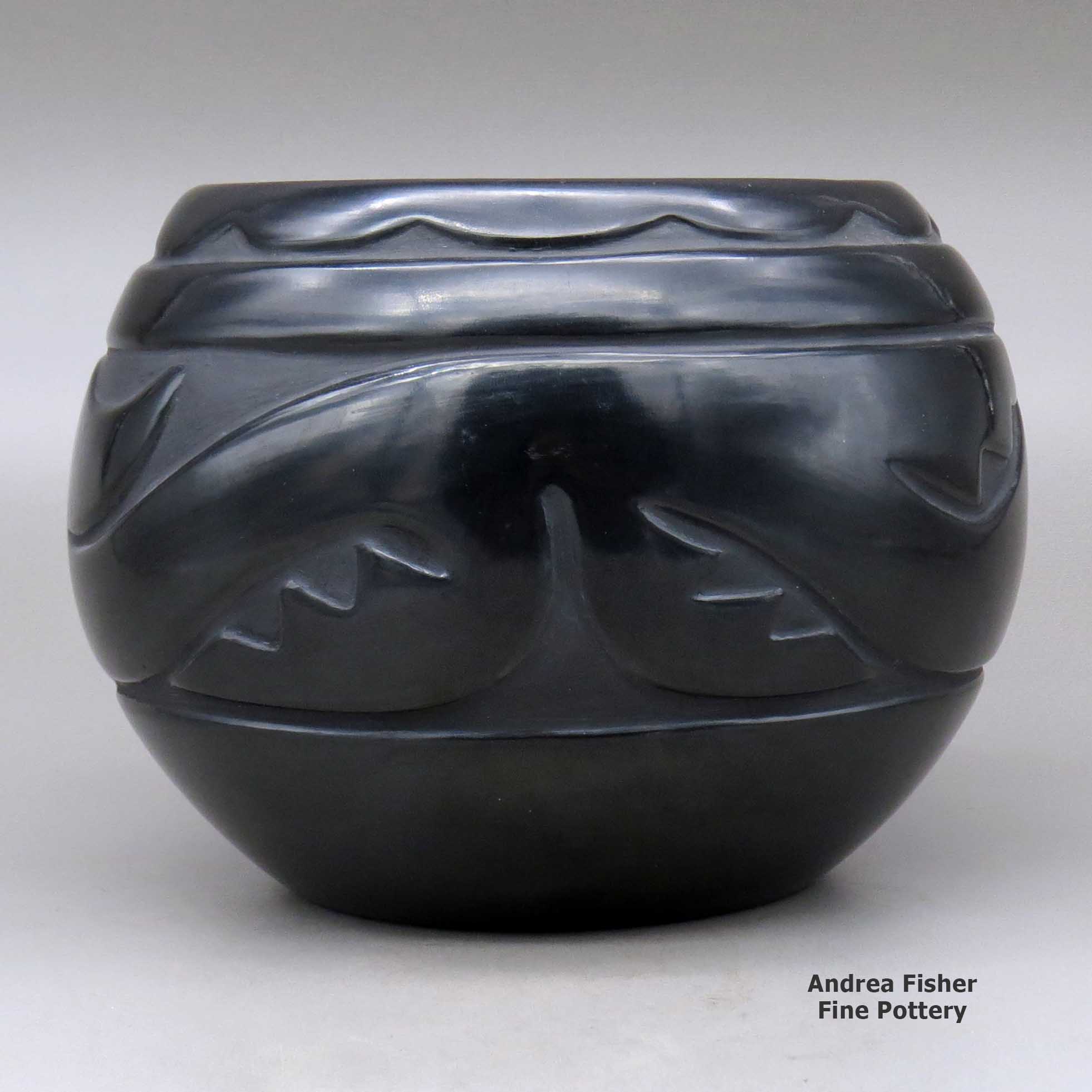 Today's pottery from Santa Clara is typically either black or red. It is usually highly polished and designs might be deeply carved or etched ("sgraffito") into the pot's surface. The water serpent, (avanyu), is a very common traditional design motif on Santa Clara pottery. Another motif comes from the legend that a bear helped the people find water during a drought. The bear paw has appeared on much of their pottery ever since.