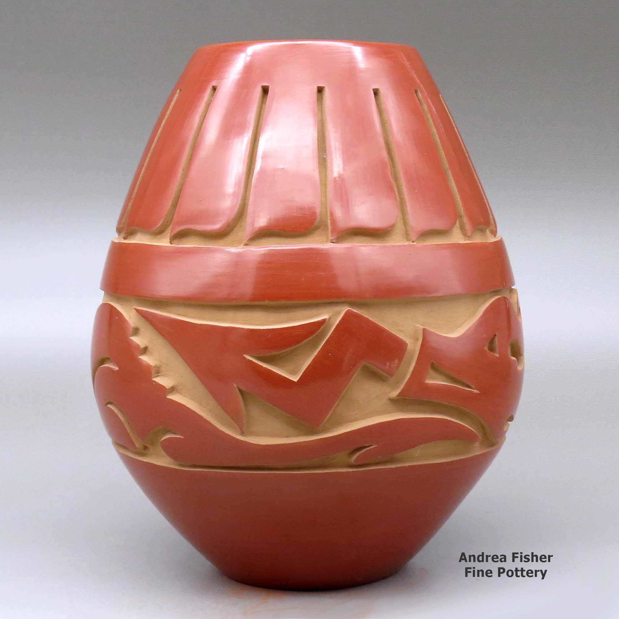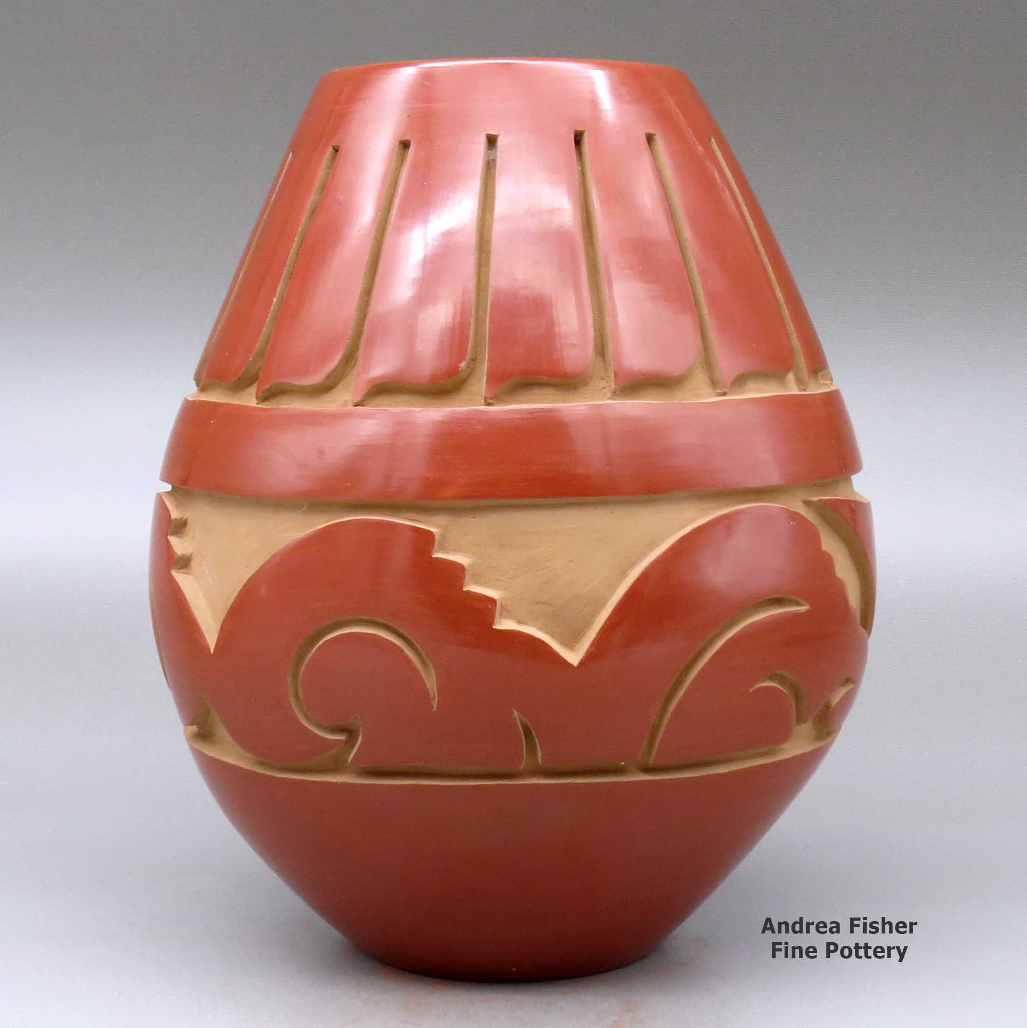 Today's pottery from Santa Clara is typically either black or red. It is usually highly polished and designs might be deeply carved or etched ("sgraffito") into the pot's surface. The water serpent, (avanyu), is a very common traditional design motif on Santa Clara pottery. Another motif comes from the legend that a bear helped the people find water during a drought. The bear paw has appeared on much of their pottery ever since.