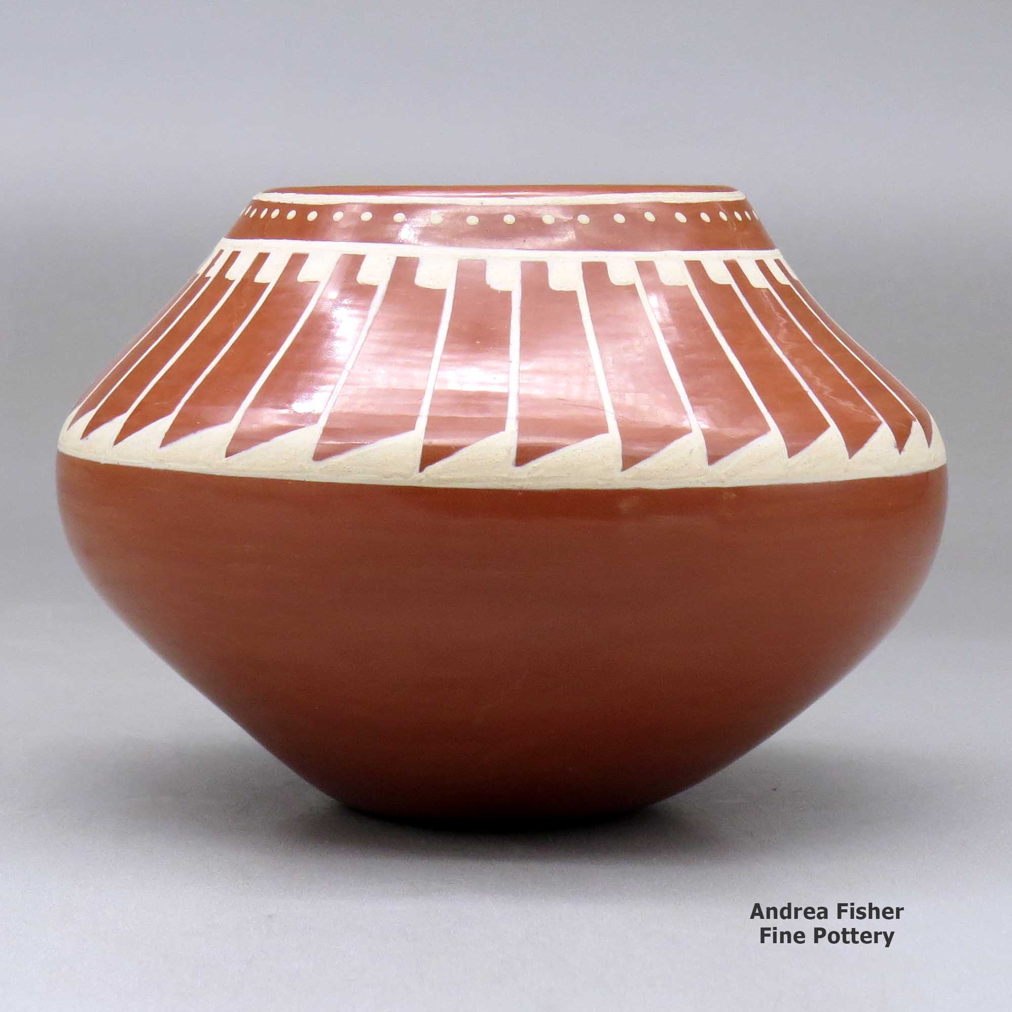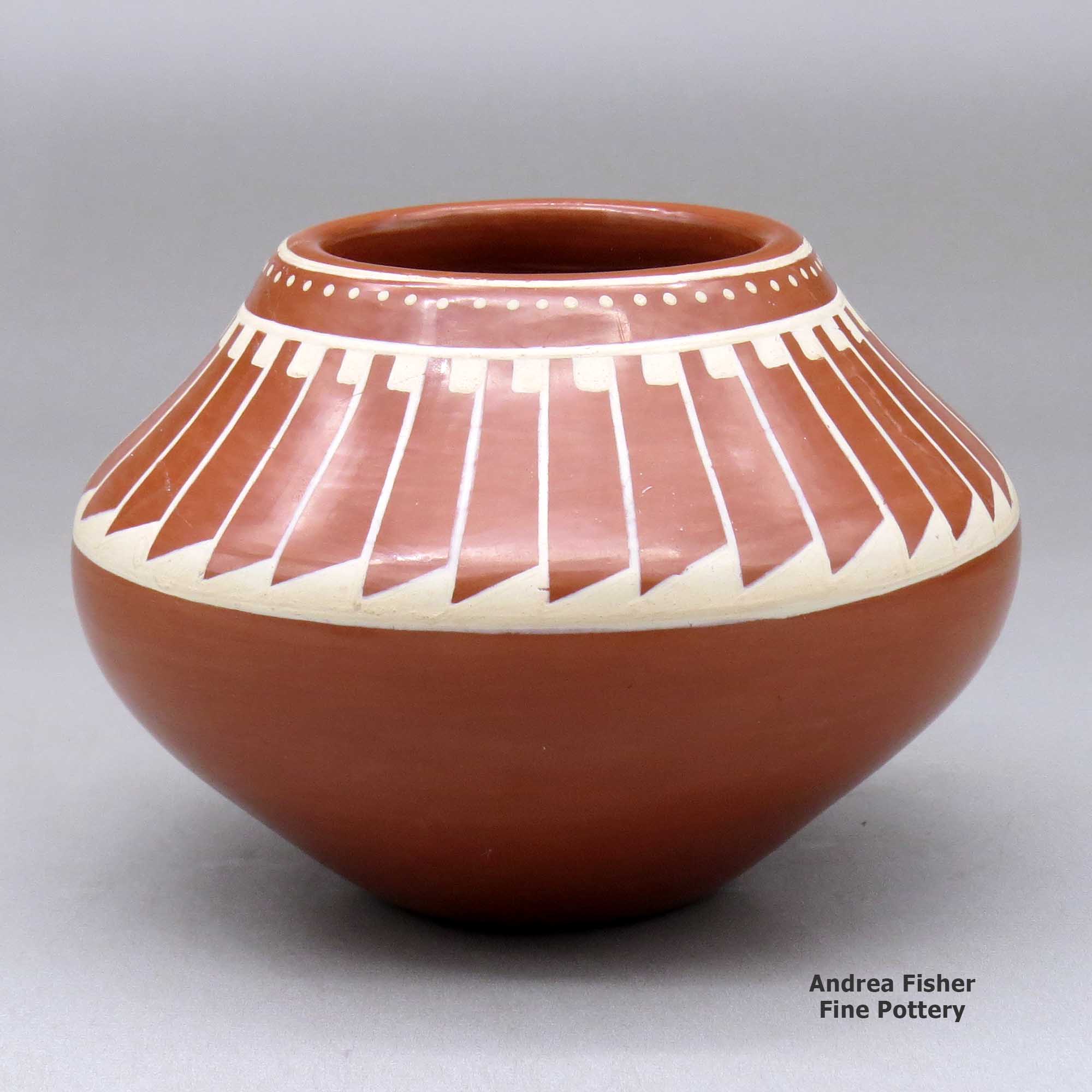A buff on red bowl decorated with a ring of feathers design above the shoulder made by Kathy Gutierrez of San Ildefonso