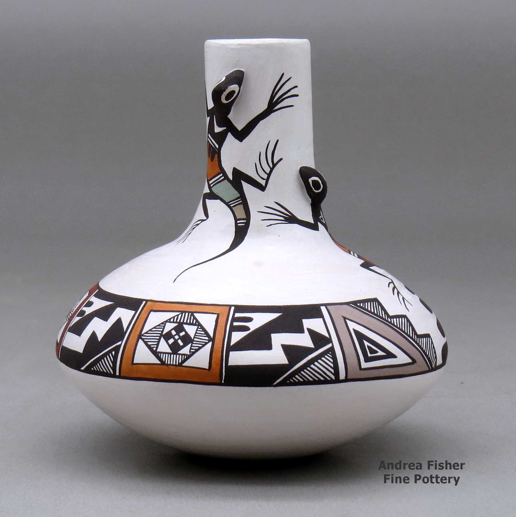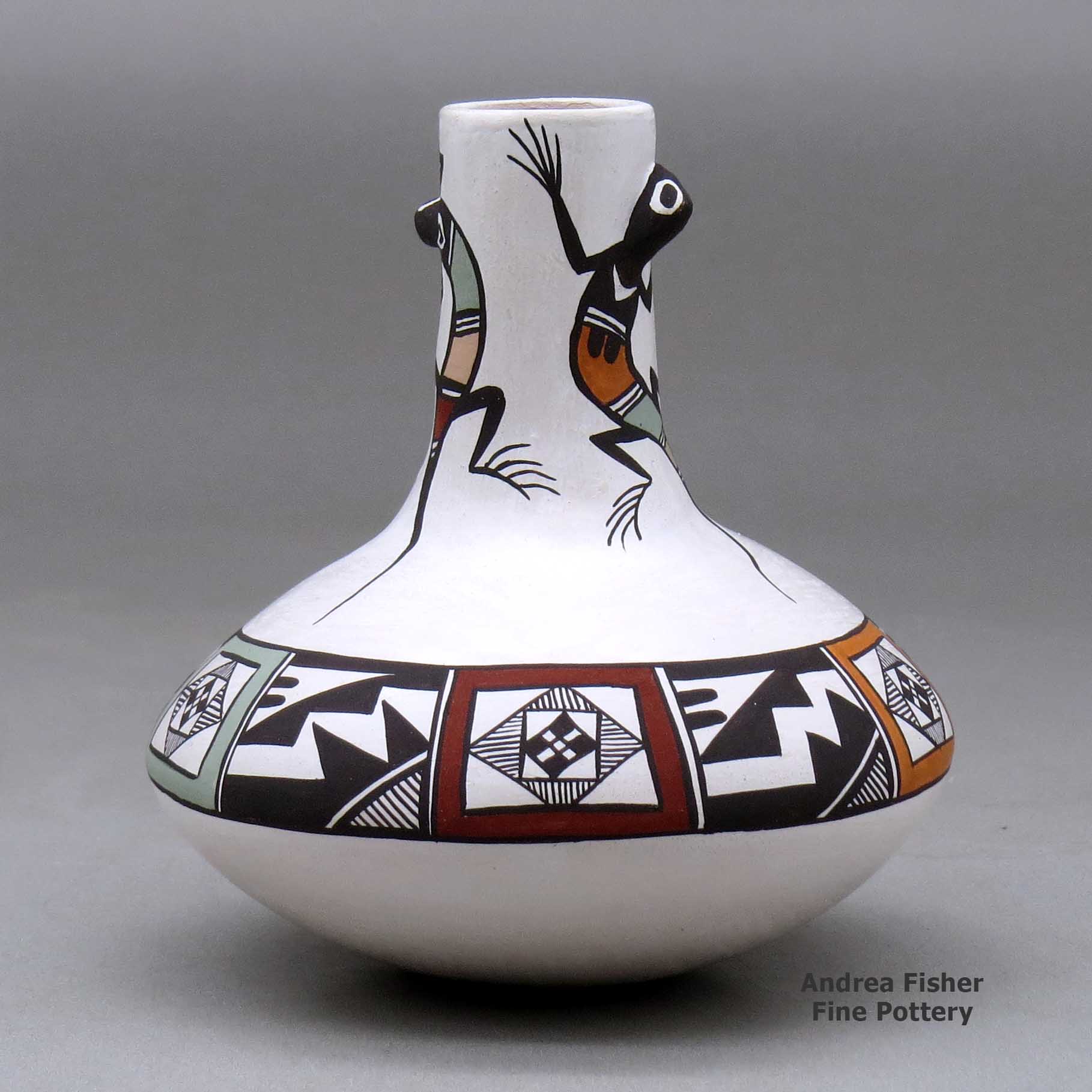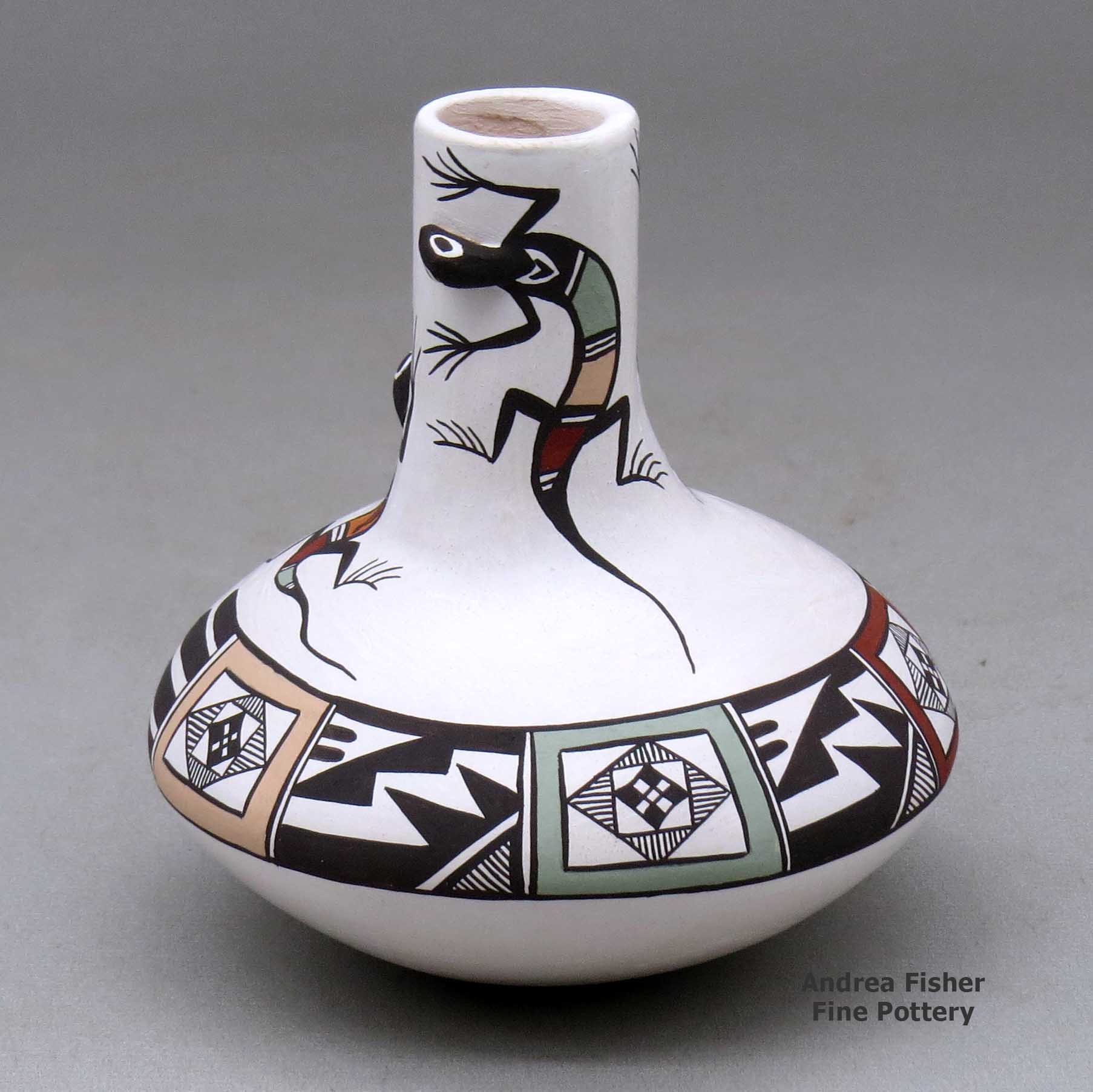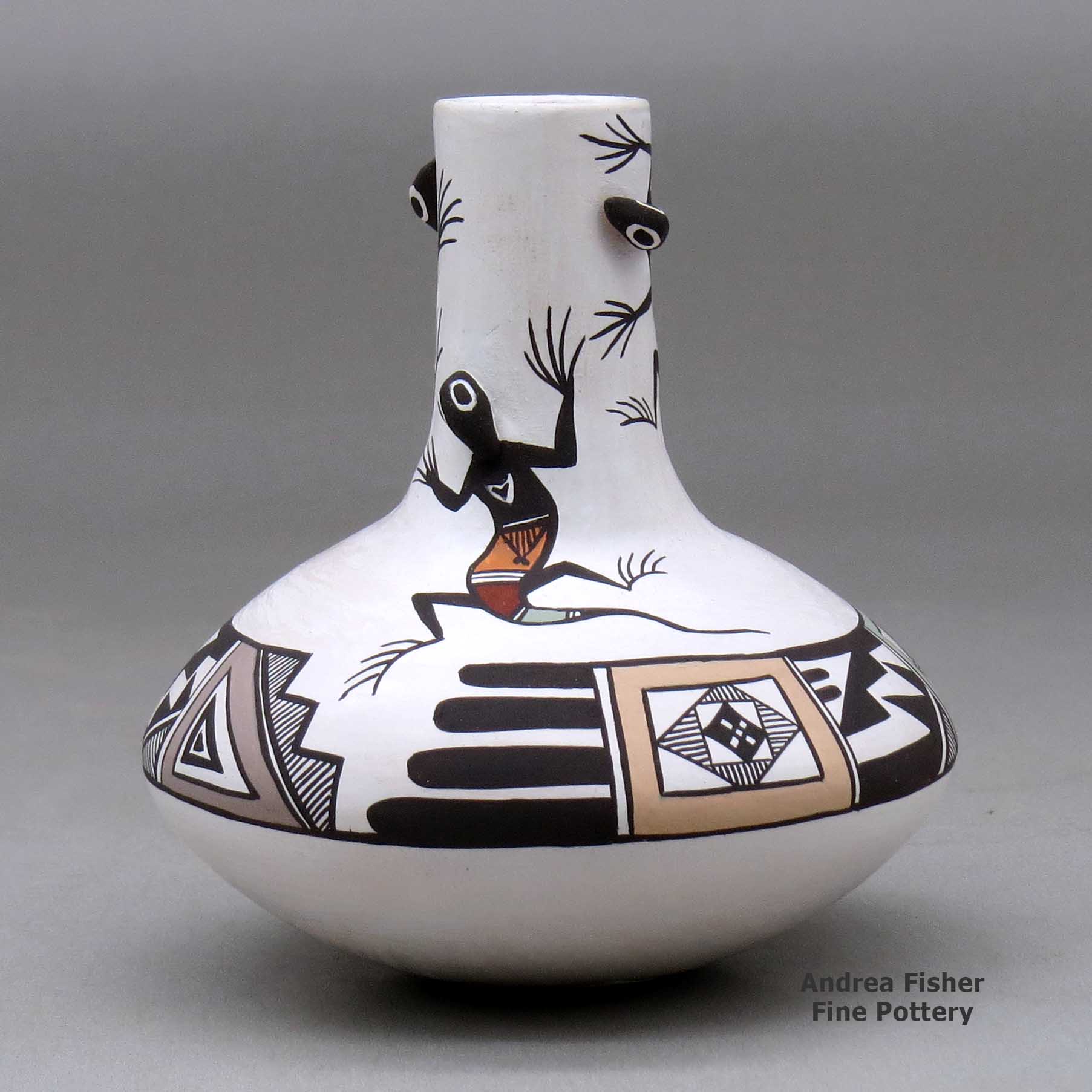 Carolyn's creations always start with animals that are fashioned after ancient Mimbres designs. Many believe that some of the prehistoric Mimbres people migrated to Acoma Pueblo. Her trademark is a tactile element on her seed pots and plates, such as an ear or head of a rabbit that three-dimensionally pops out of the surface, rendering a realistic effect and adding a bit of whimsy. She decides the placement of the creatures and surrounds the figures with fine black-line designs. Carolyn uses a camel hair brush since she's found that yucca brushes don't glide smoothly enough for her purposes.