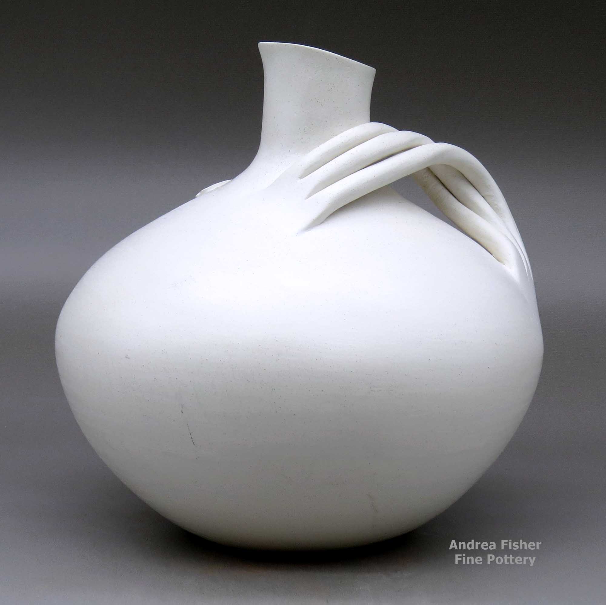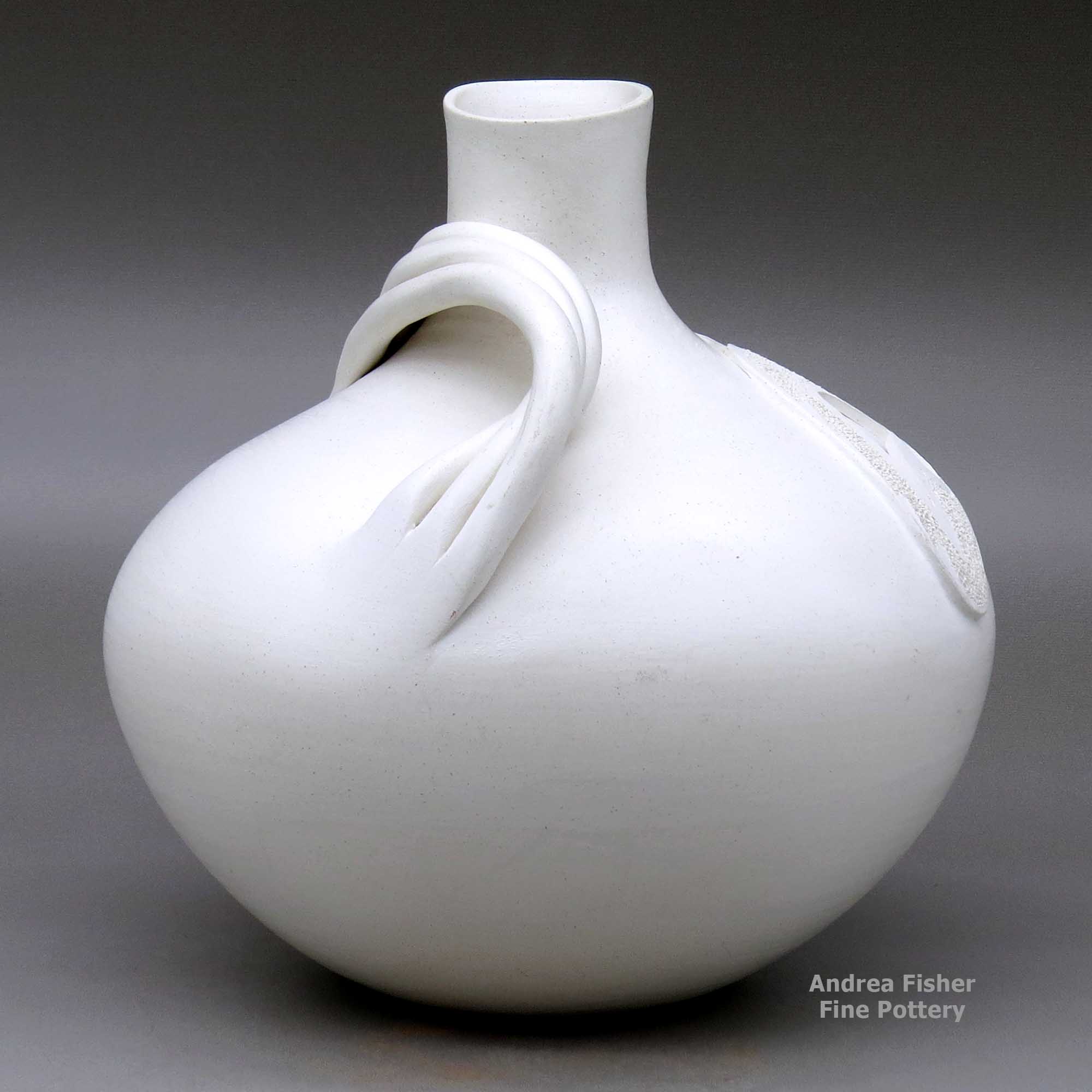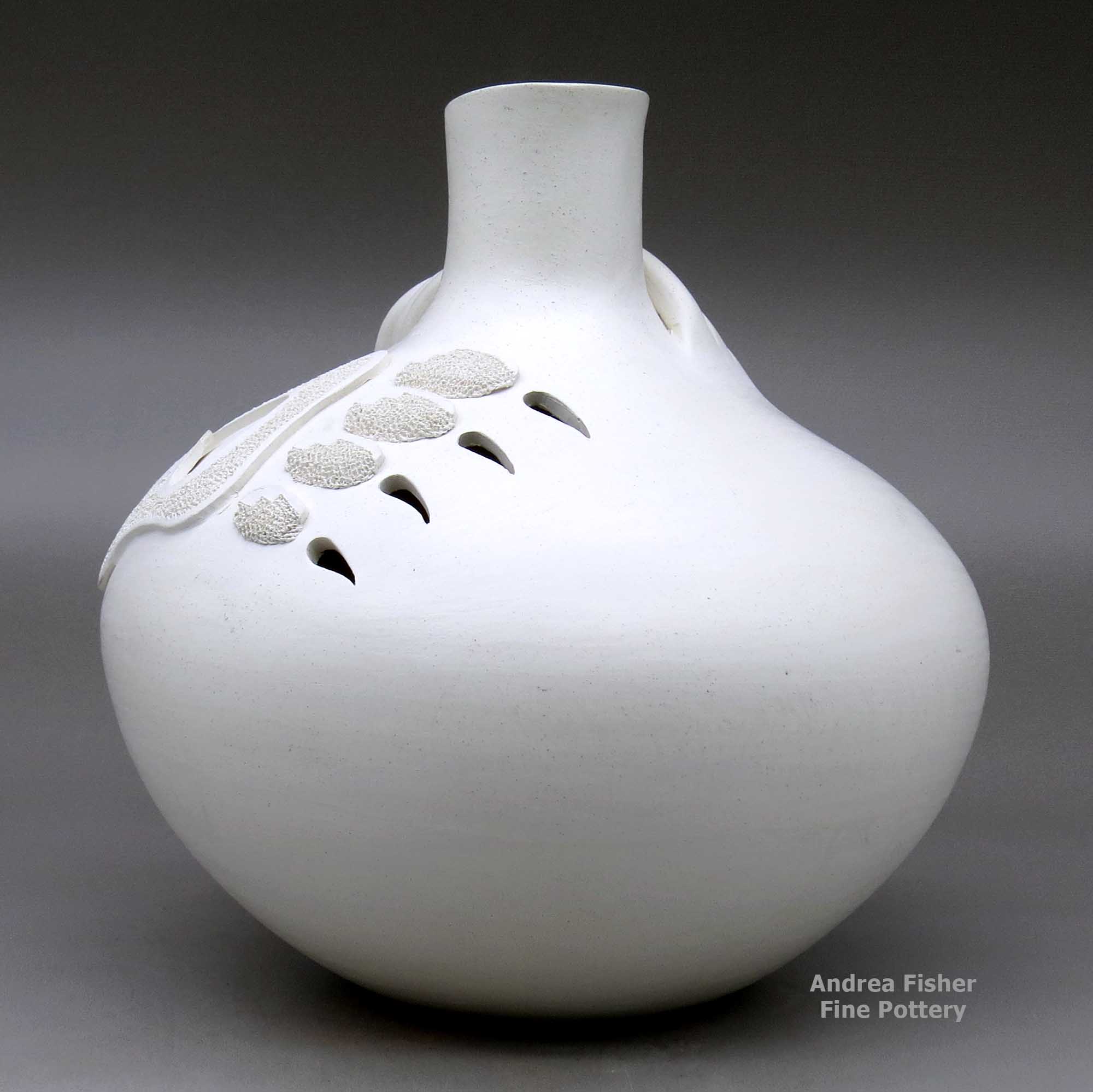 Wilfred often collaborated with his wife, Sandra, in making white jars with organic openings and carved cliff dwelling scenes. They also made white jars with appliqued ears of corn on them. On his own, Wilfred made oval vases with appliqué katsina faces.