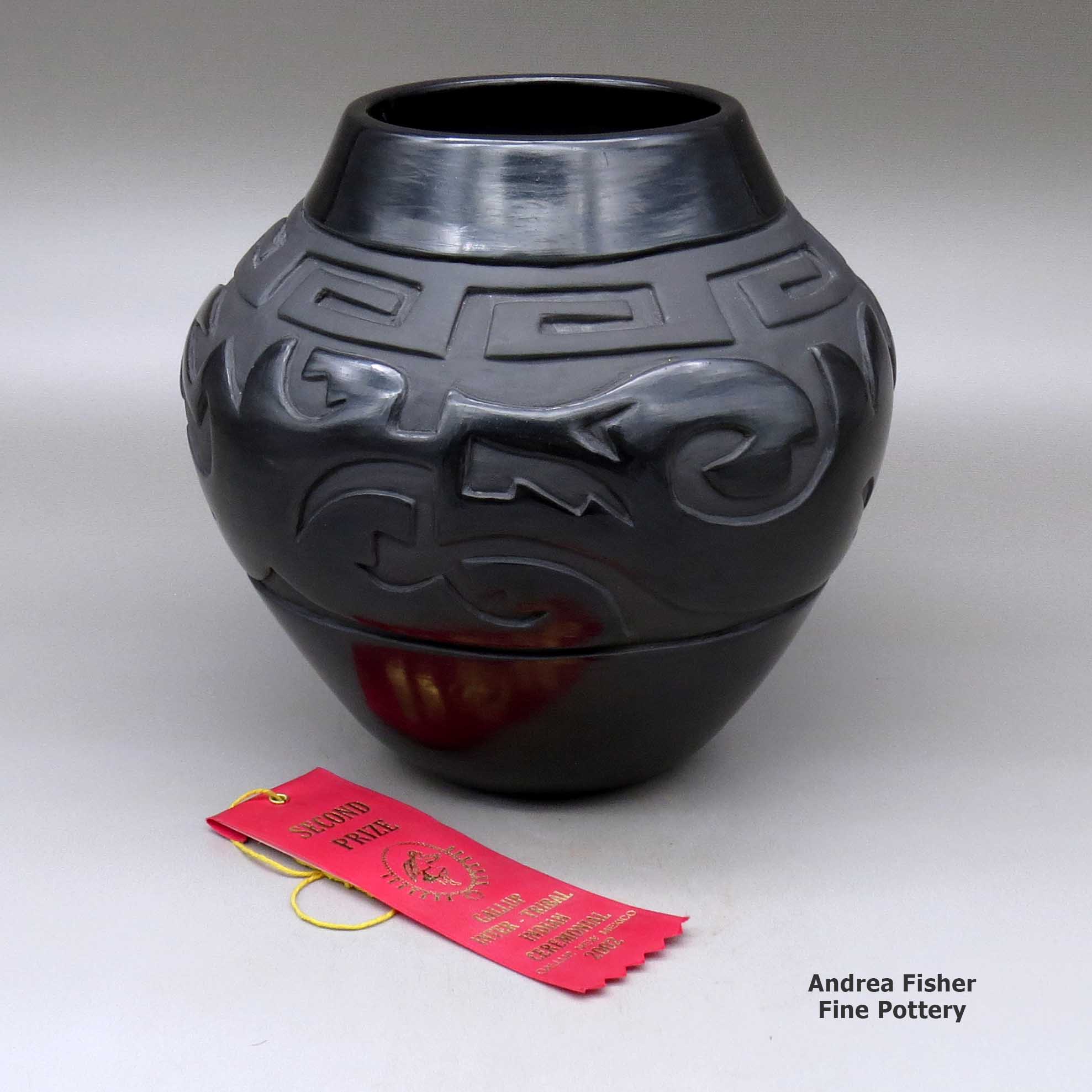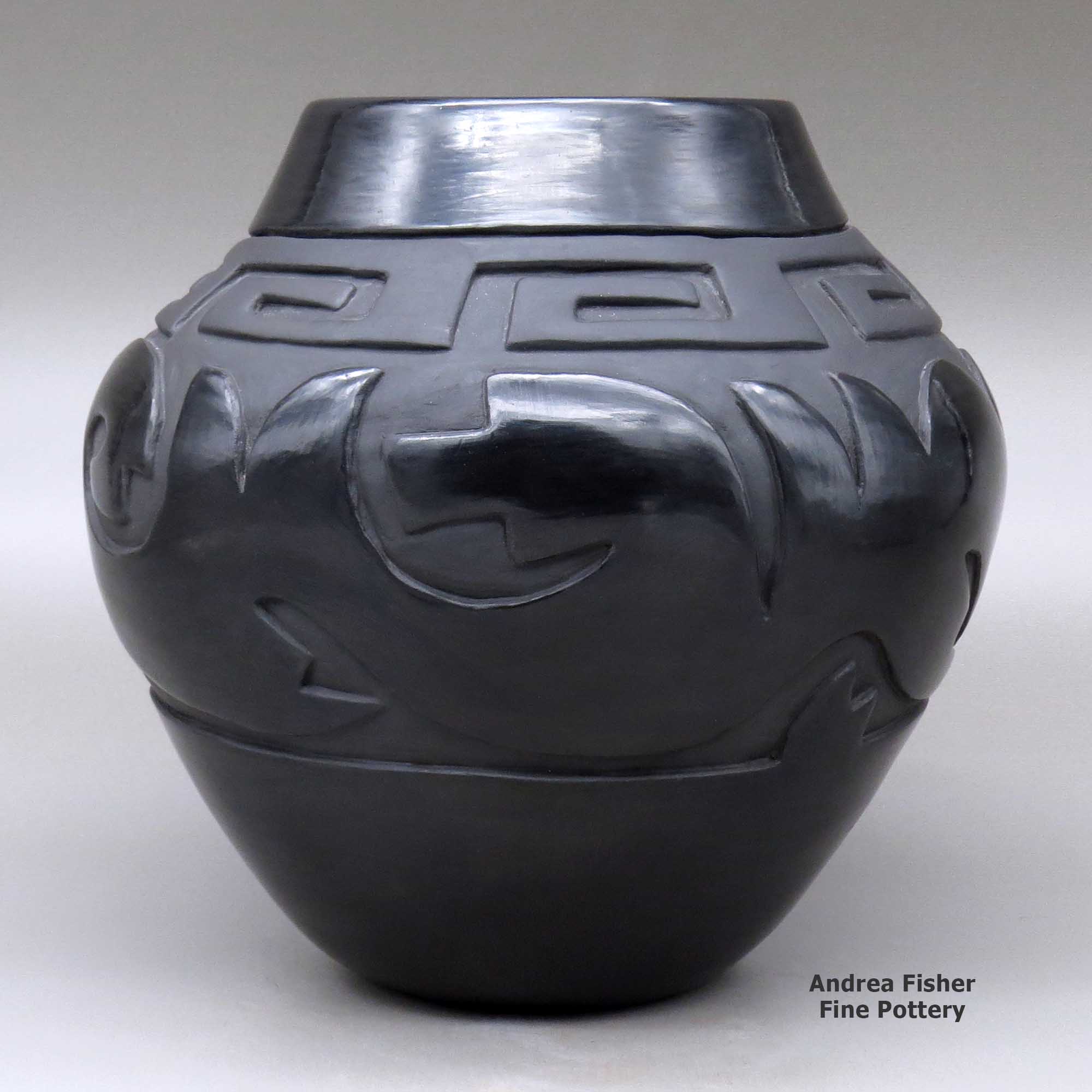 Today's pottery from Santa Clara is typically either black or red. It is usually highly polished and designs might be deeply carved or etched ("sgraffito") into the pot's surface. The water serpent, (avanyu), is a very common traditional design motif on Santa Clara pottery. Another motif comes from the legend that a bear helped the people find water during a drought. The bear paw has appeared on much of their pottery ever since.
