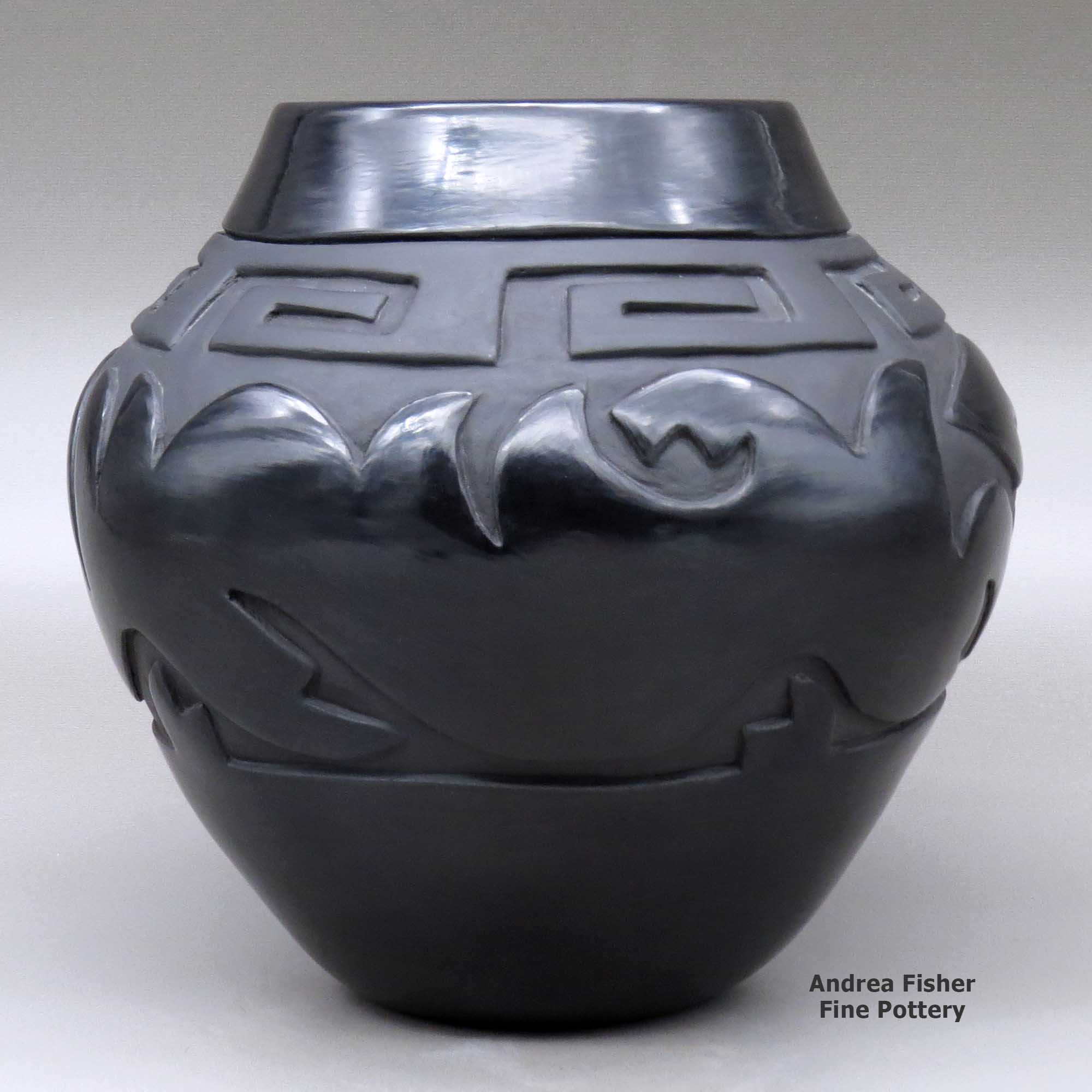Sharon Naranjo Garcia was born in February 1951. Her mother was Cecilia Naranjo but she was raised by her grandmother, Christina Naranjo. She learned how to make carved and plain blackware and redware: water jars, melon bowls, seed pots, vases and wedding vases. Her favorite designs to carve are feathers, bear paws and the avanyu (the mythic Tewa water serpent).