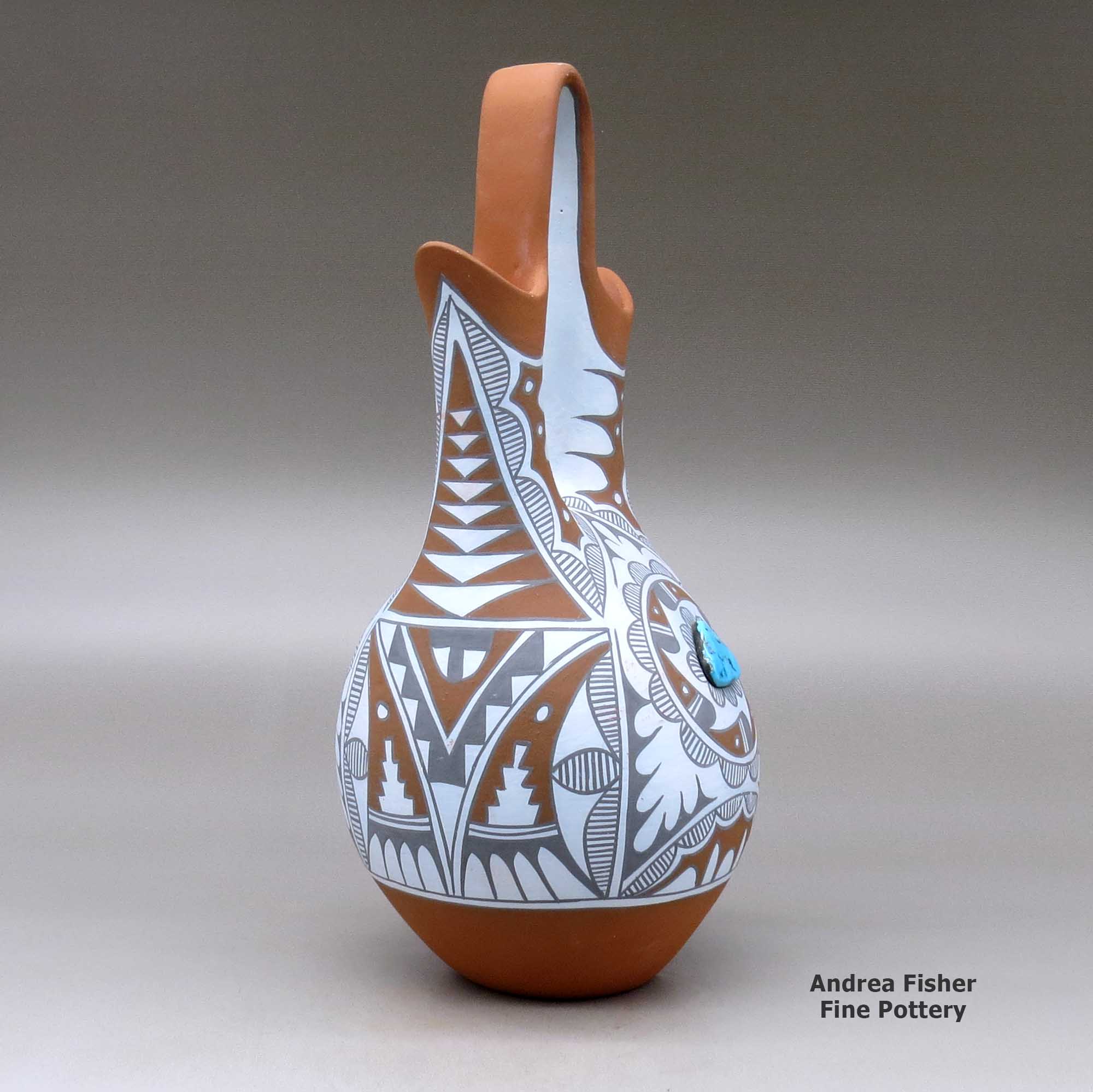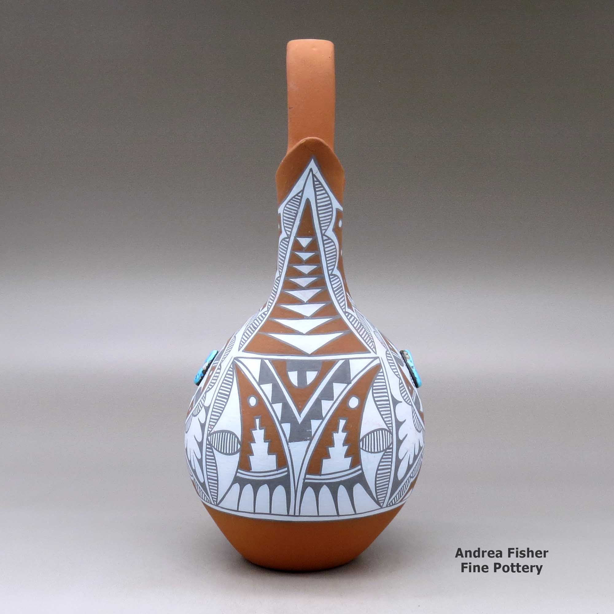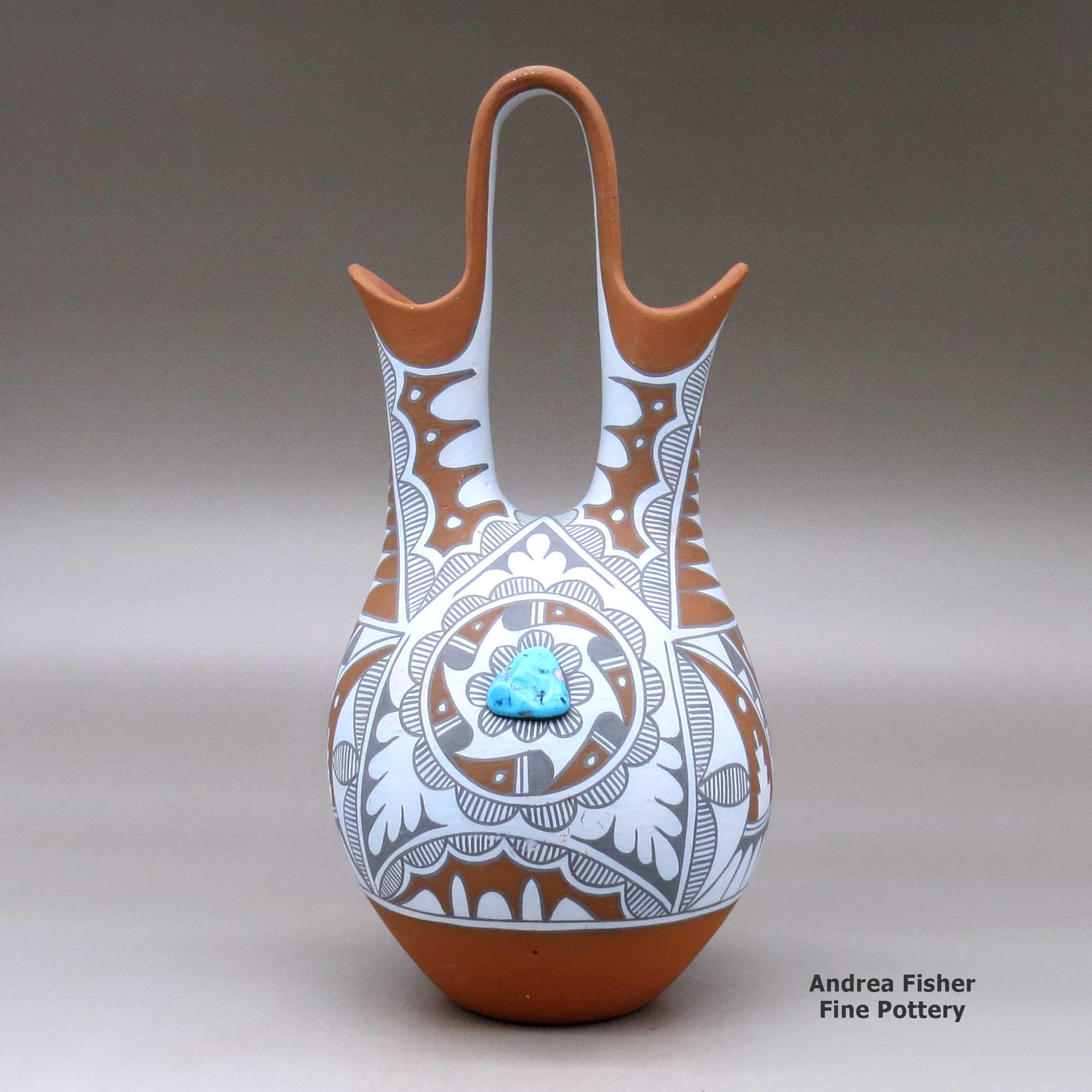 After the exchange of squash blossom necklaces and prayers, the Godmother places the wedding vase in front of the bride and groom. The bride drinks out of one side of the wedding vase and the groom drinks from the other. Then, the vase is passed to all in the room, with the women all drinking from the bride's side, and the men from the groom's.