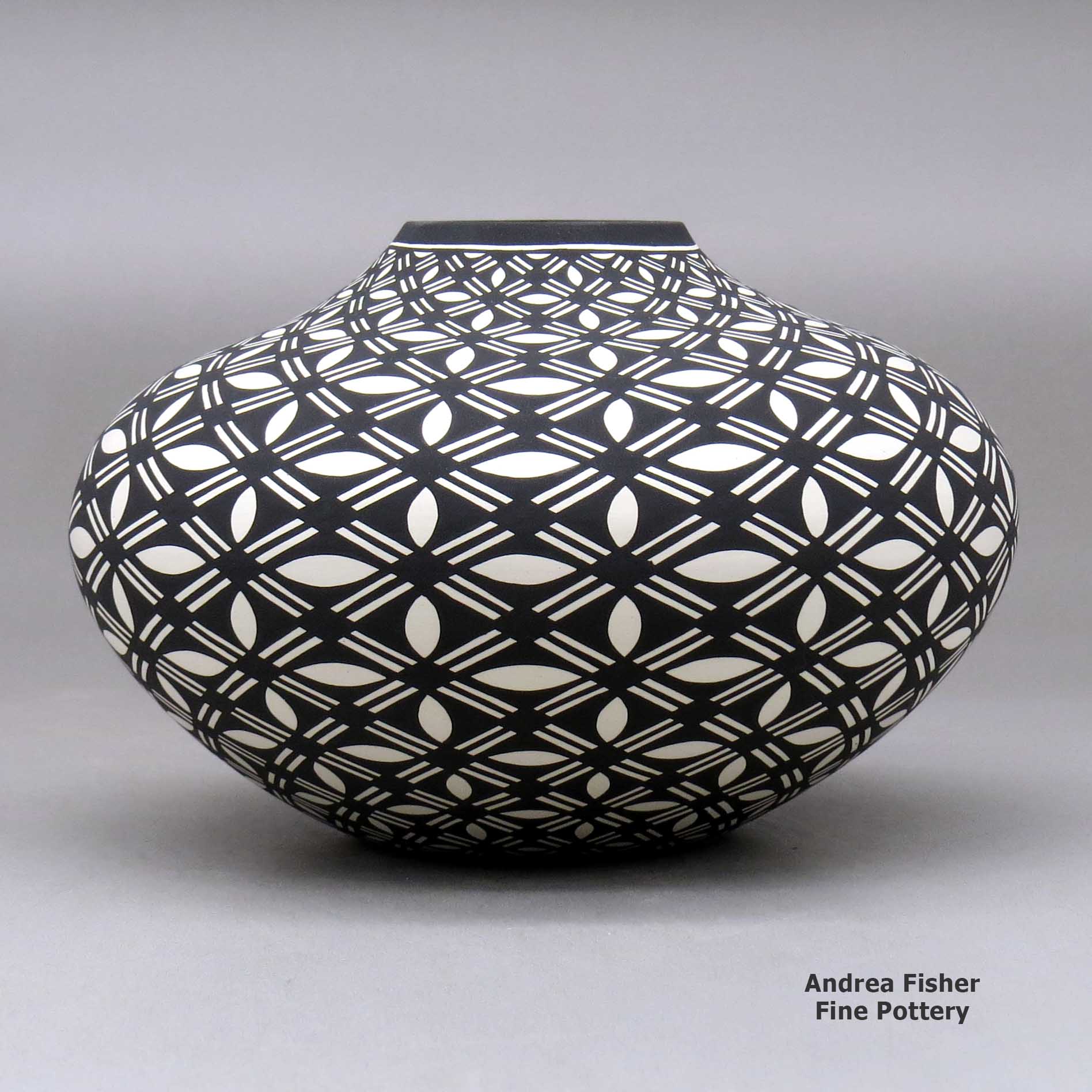 Paula's hand coiled pots are exceptional examples of contemporary Acoma pottery created with perfect shape and form. Her process involves selecting a single Acoma design element and repeating it in an extremely fine progressive pattern on the entire surface of the pot. She says her inspiration comes from her great-grandmother, Mary Estevan Chino. Paula also says she takes making her pottery very seriously. At the same time she admits the creation process is very therapeutic for her.