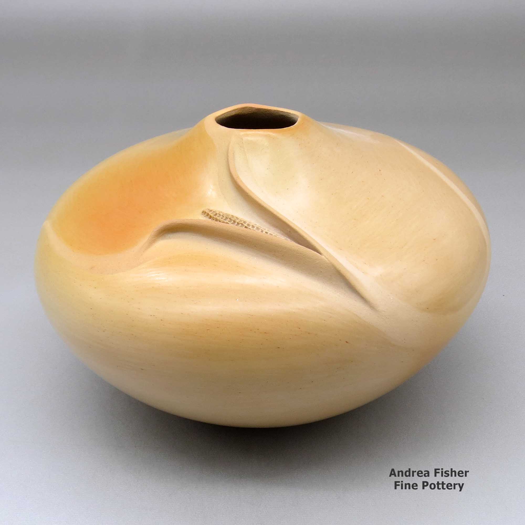 Two "trademarks" of Iris' later works: the delicately carved repoussé ear-of-corn design and the organic opening. She signed her pottery "Iris Nampeyo" with a corn symbol denoting her clan affiliation. Al Qoyawayma was her nephew.