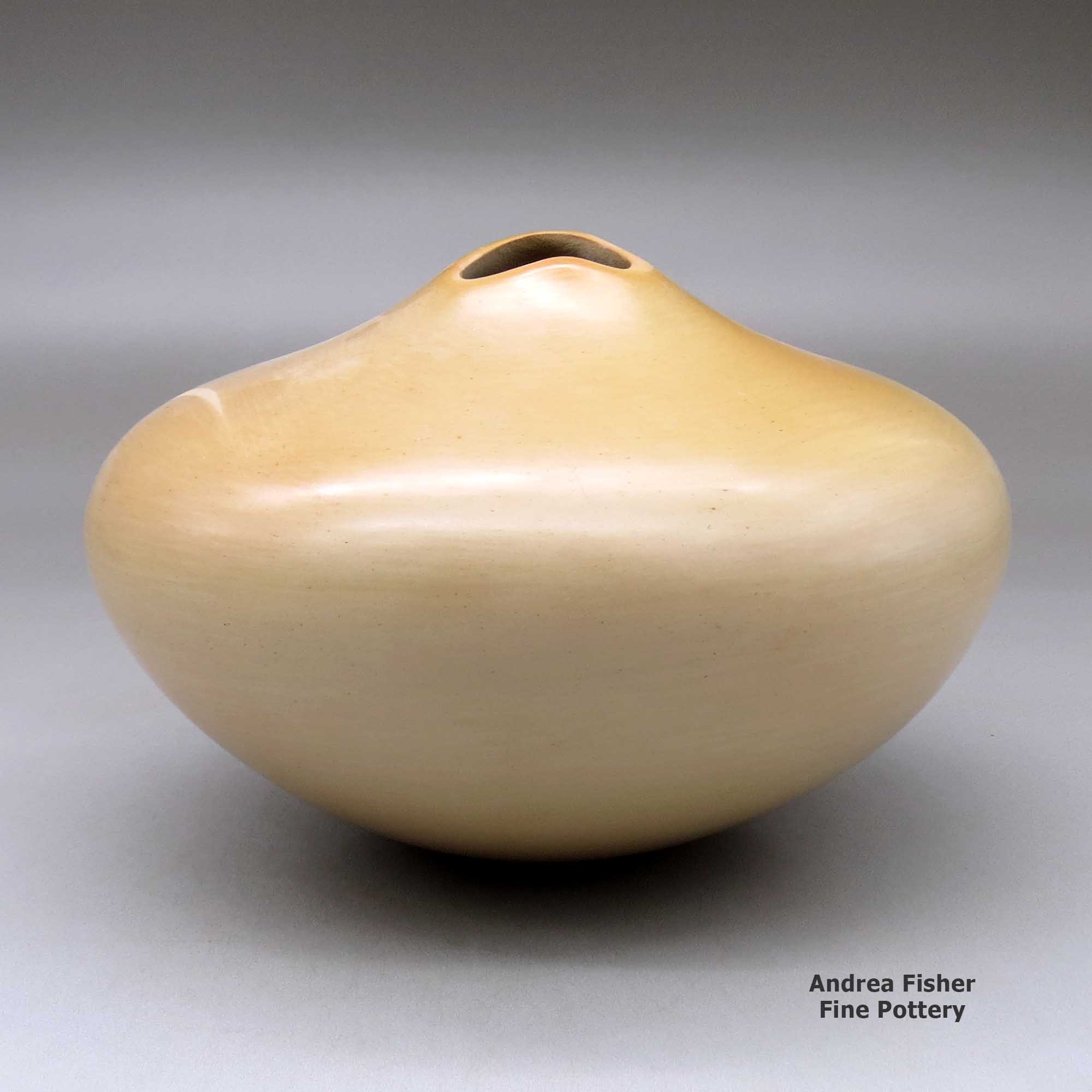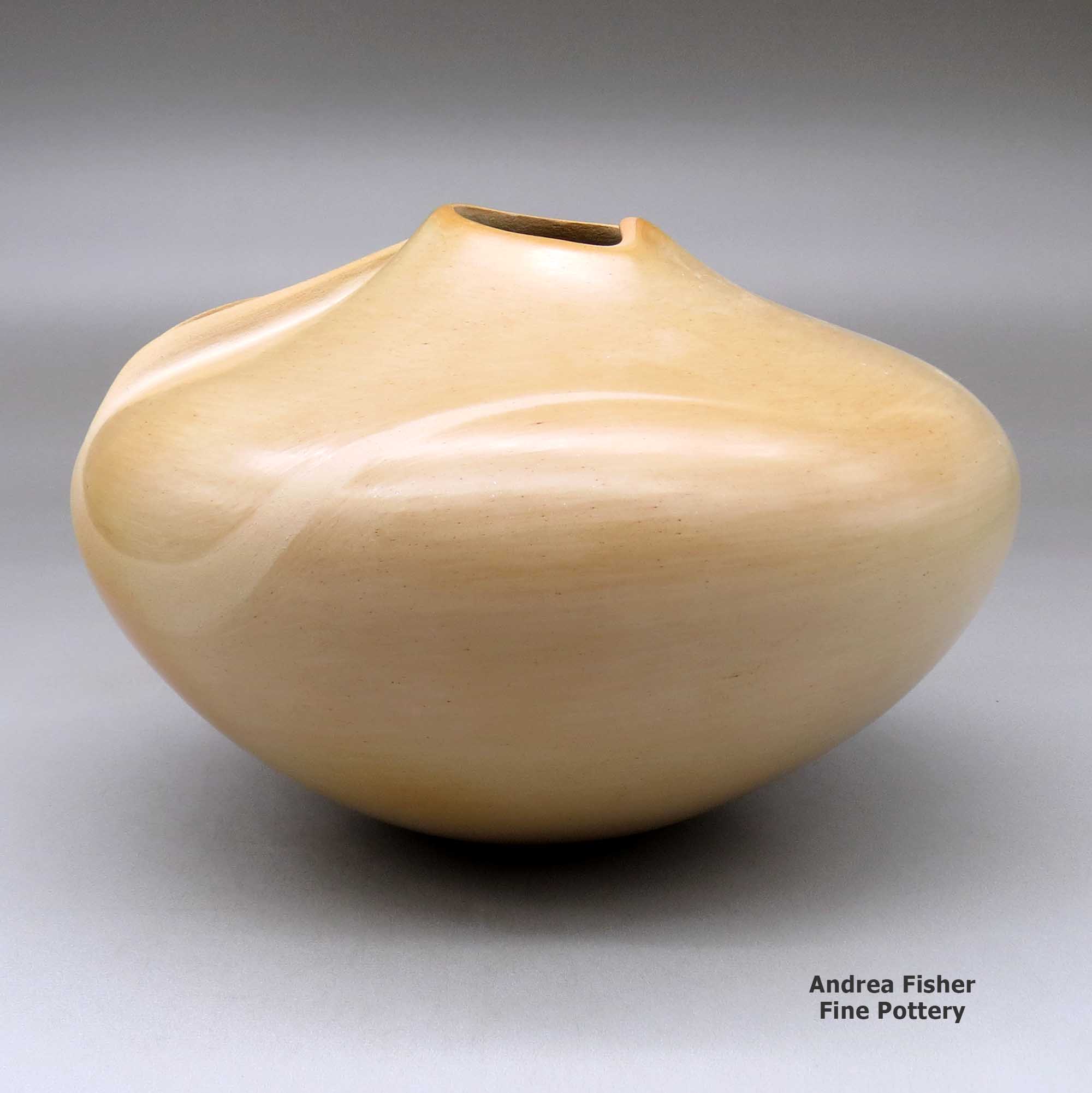 Born in 1944, Iris Youvella Nampeyo was a daughter of Fannie Nampeyo. She learned the traditional art of making pottery by watching and working with her mother as she grew up. Early in her career as a potter she used many of the pottery styles and designs made famous by her mother and grandmother but then she changed to making unslipped tan pottery with no painted decorations.