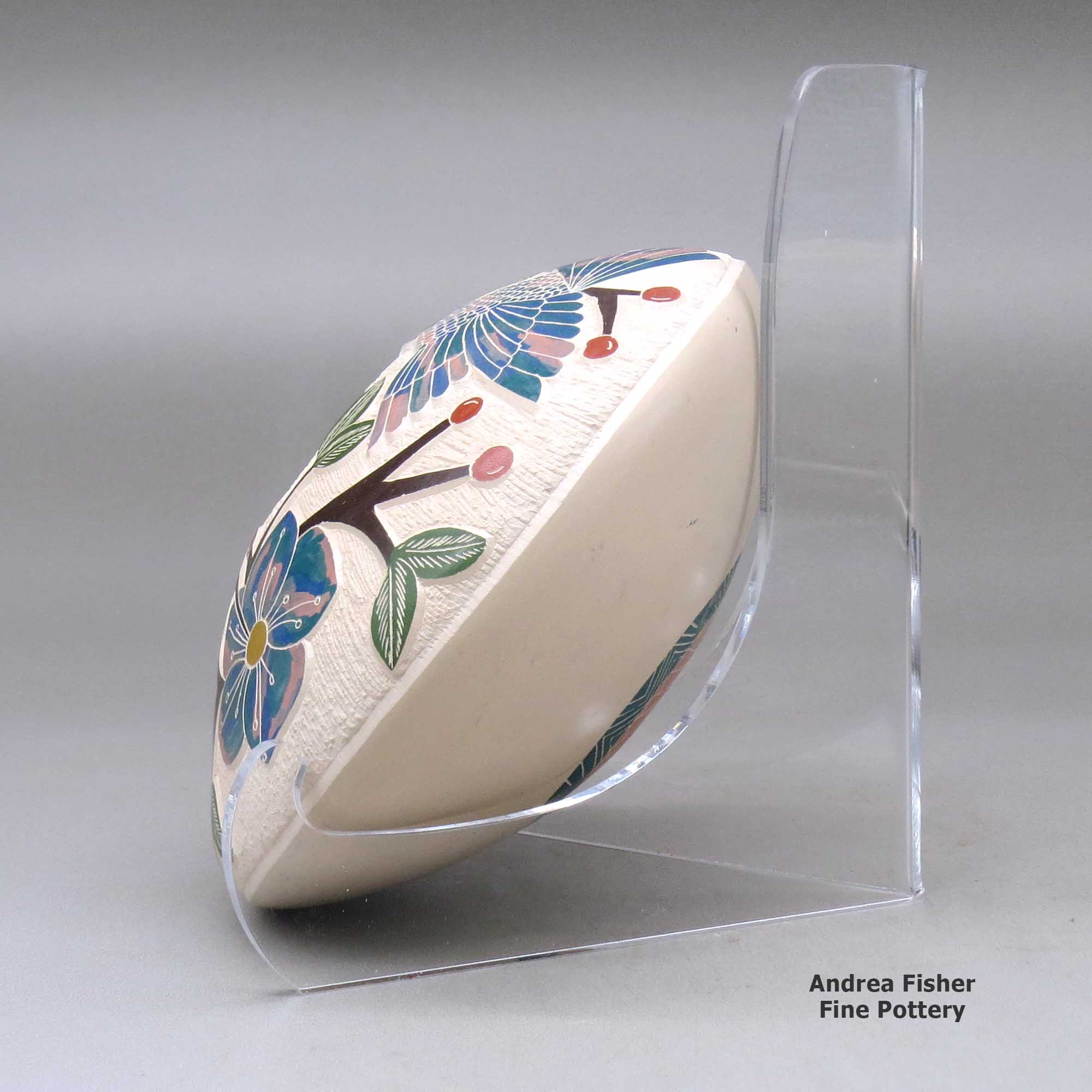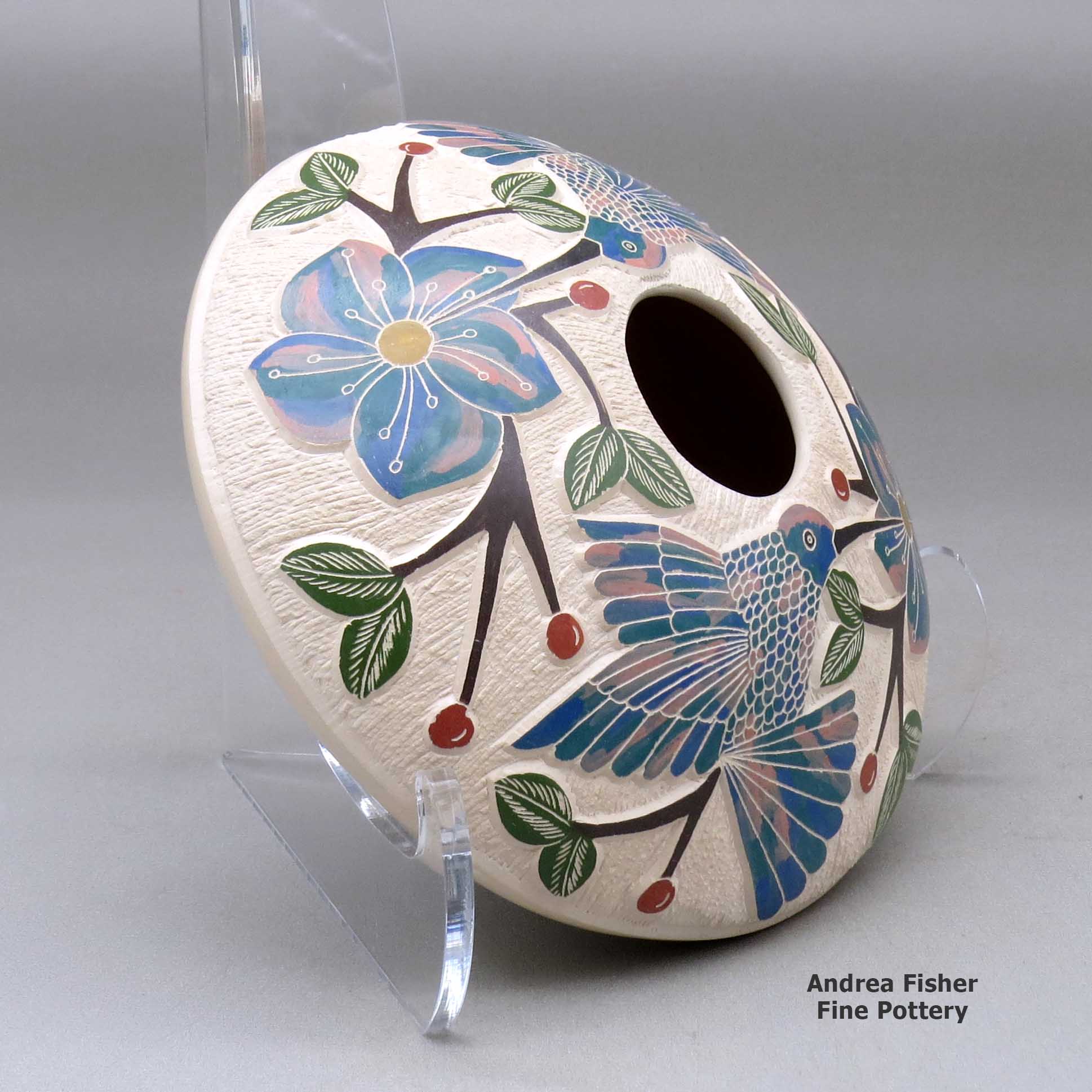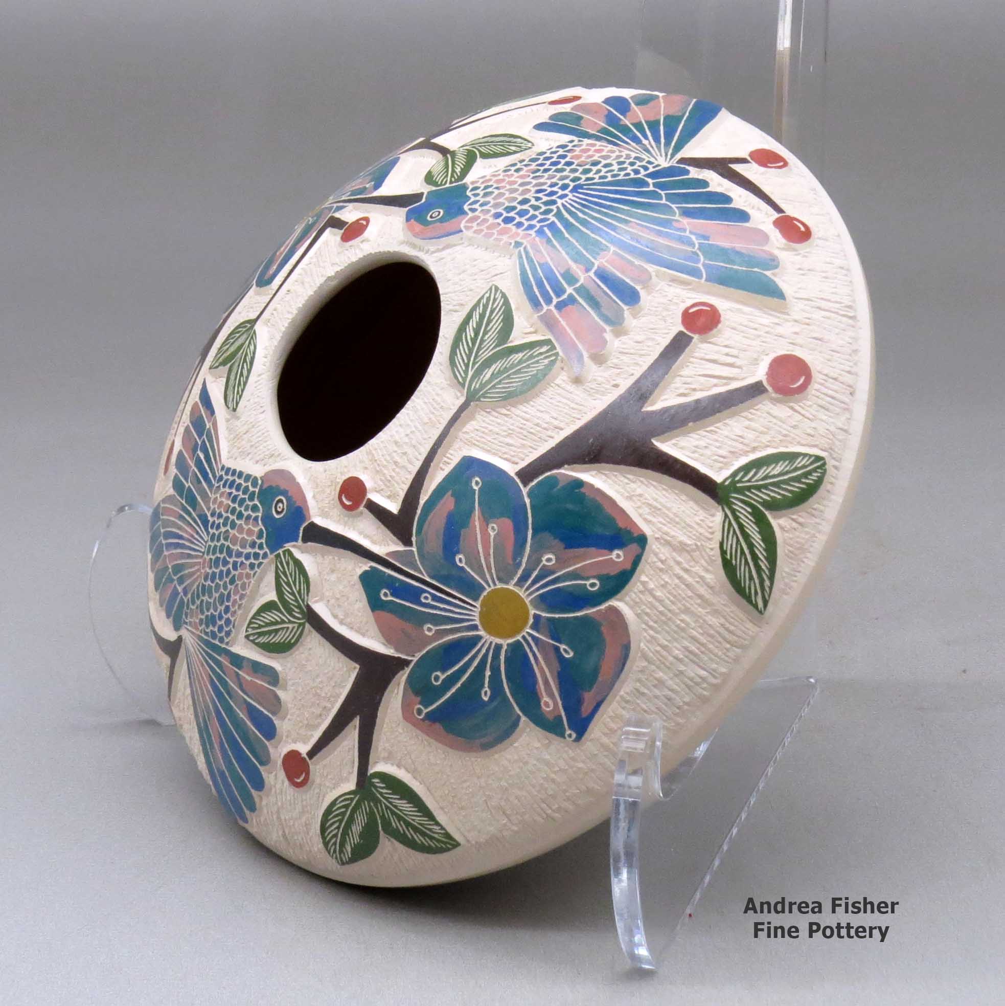 Today she makes polychrome jars and vases, decorating them with sgraffito and painted nature and wildlife designs, often with bands of geometric designs above and/or below the main design. She also often collaborates with Nolberto Quintana.