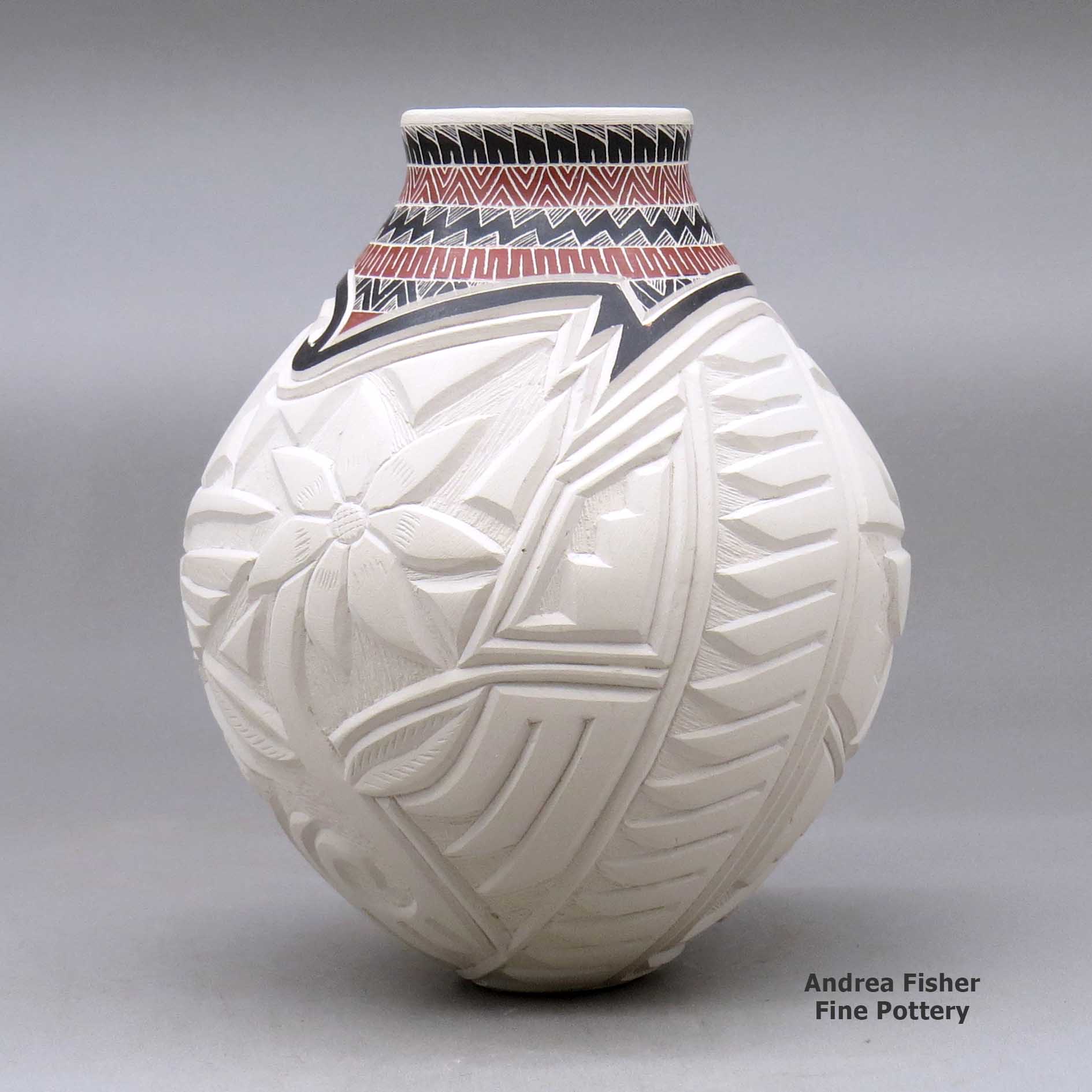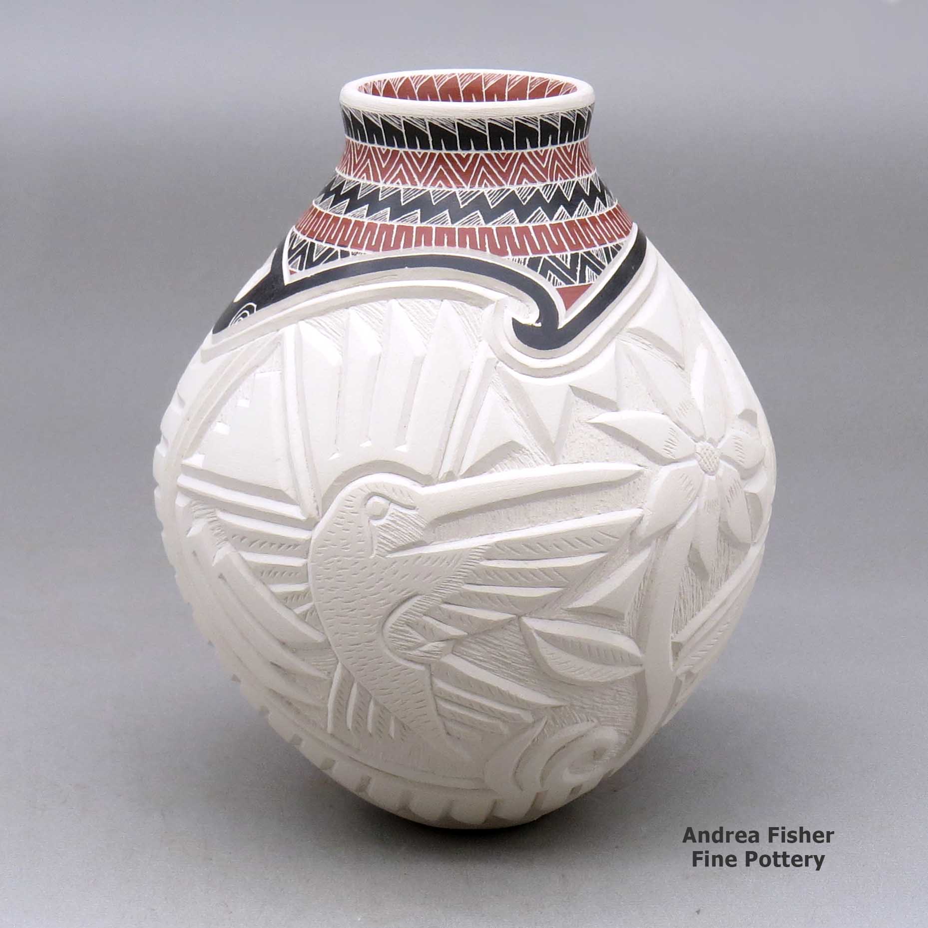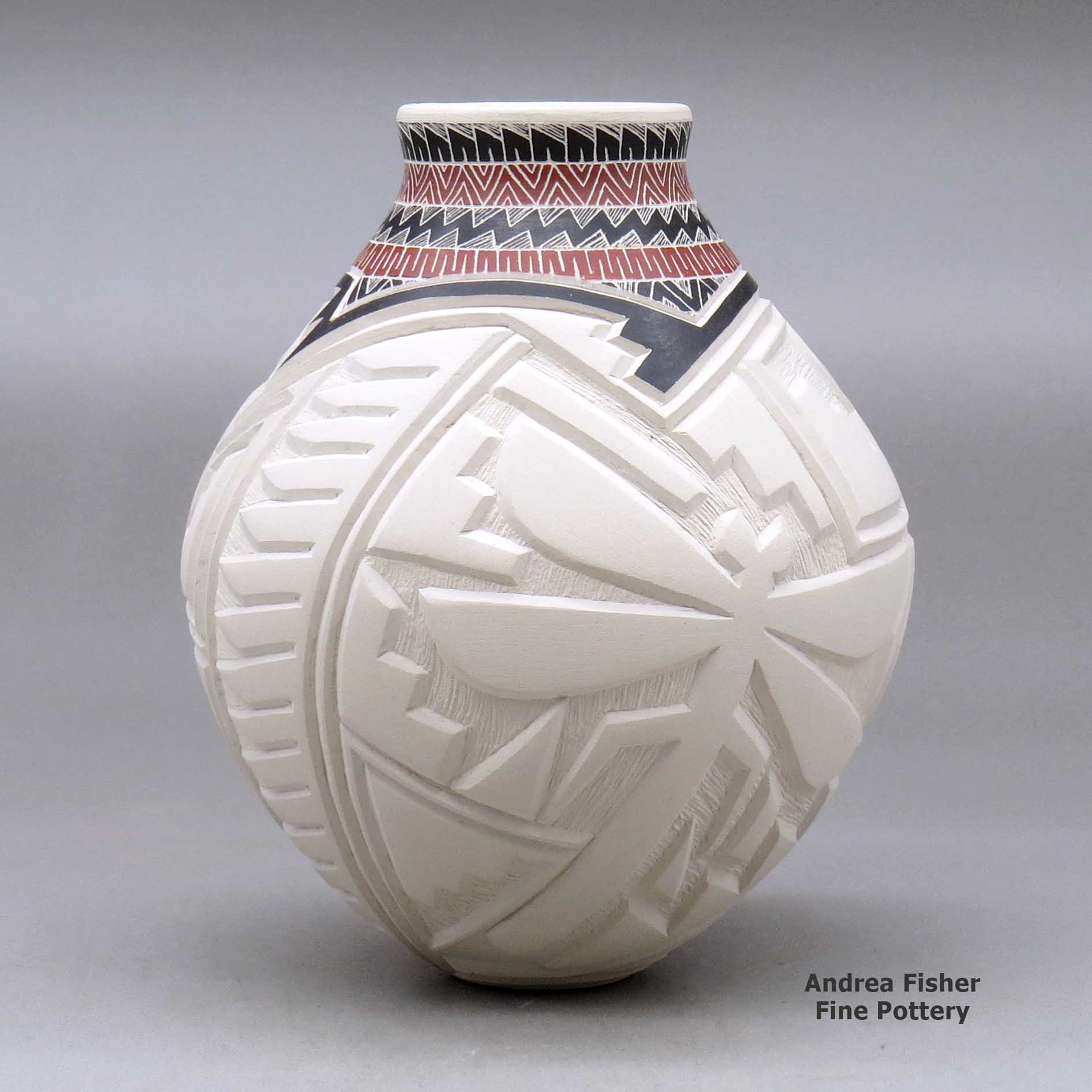 A polychrome vase decorated with a carved hummingbird, dragonfly and geometric design around the body and a sgraffito and painted geometric design around the short neck