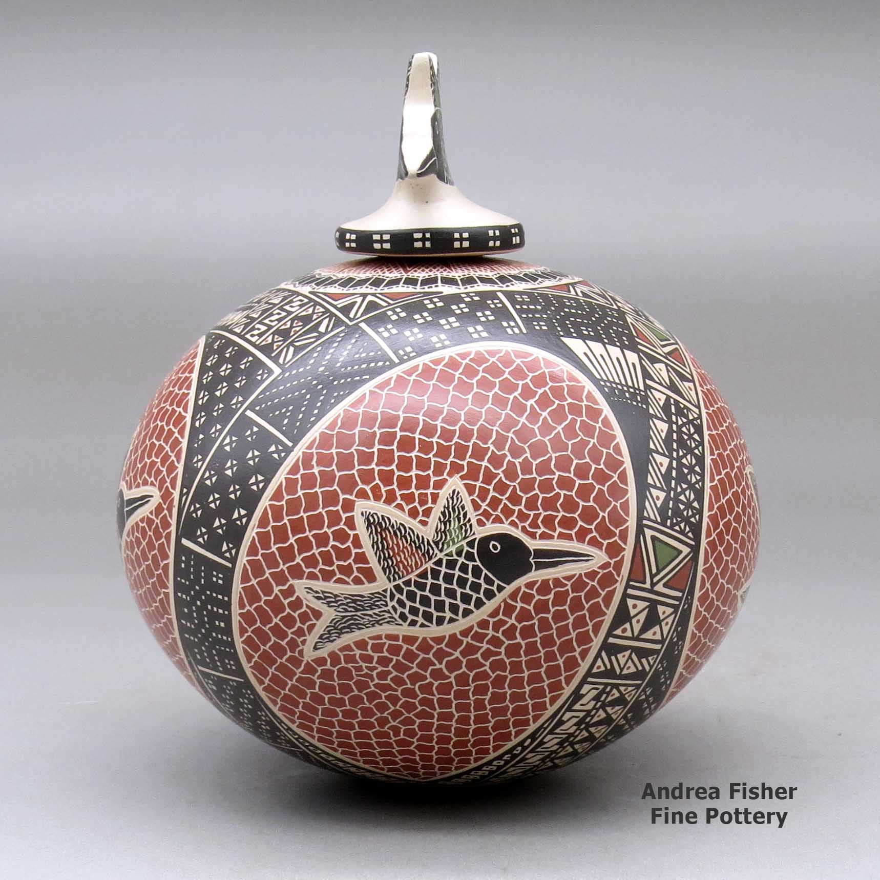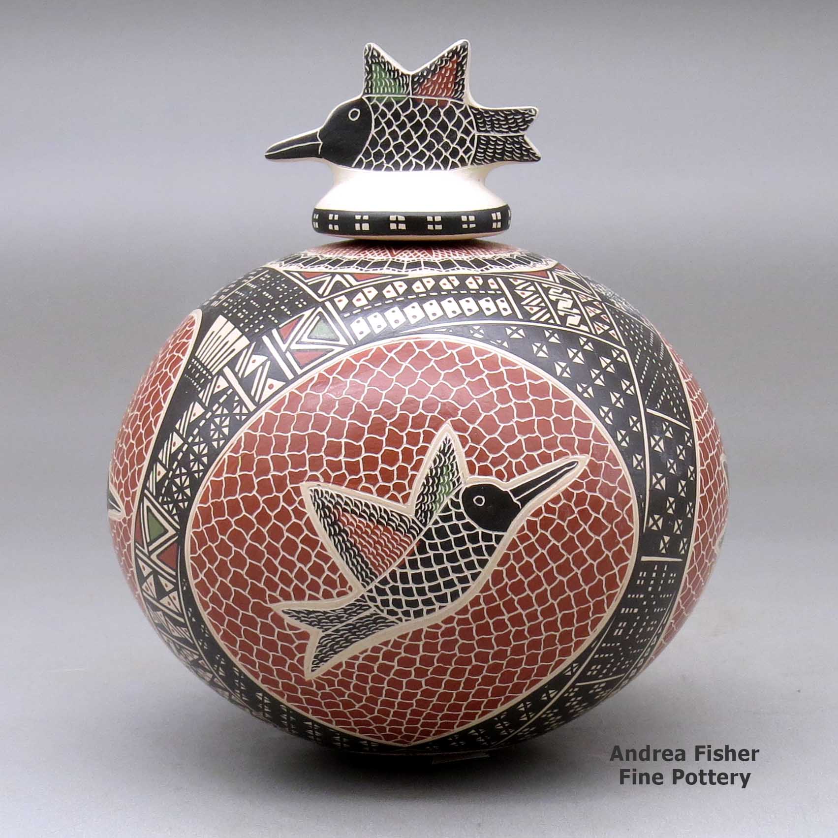 Angela is married to Mata Ortiz potter Oscar Ramirez and they often collaborate on pieces. Both tend to leave more open spaces in their individual designs but when working together, they seem to prefer to cover the surface of a piece almost completely with bands of different colored geometrics. She also makes repousse animals on some of her pieces while he makes lids for some of his.