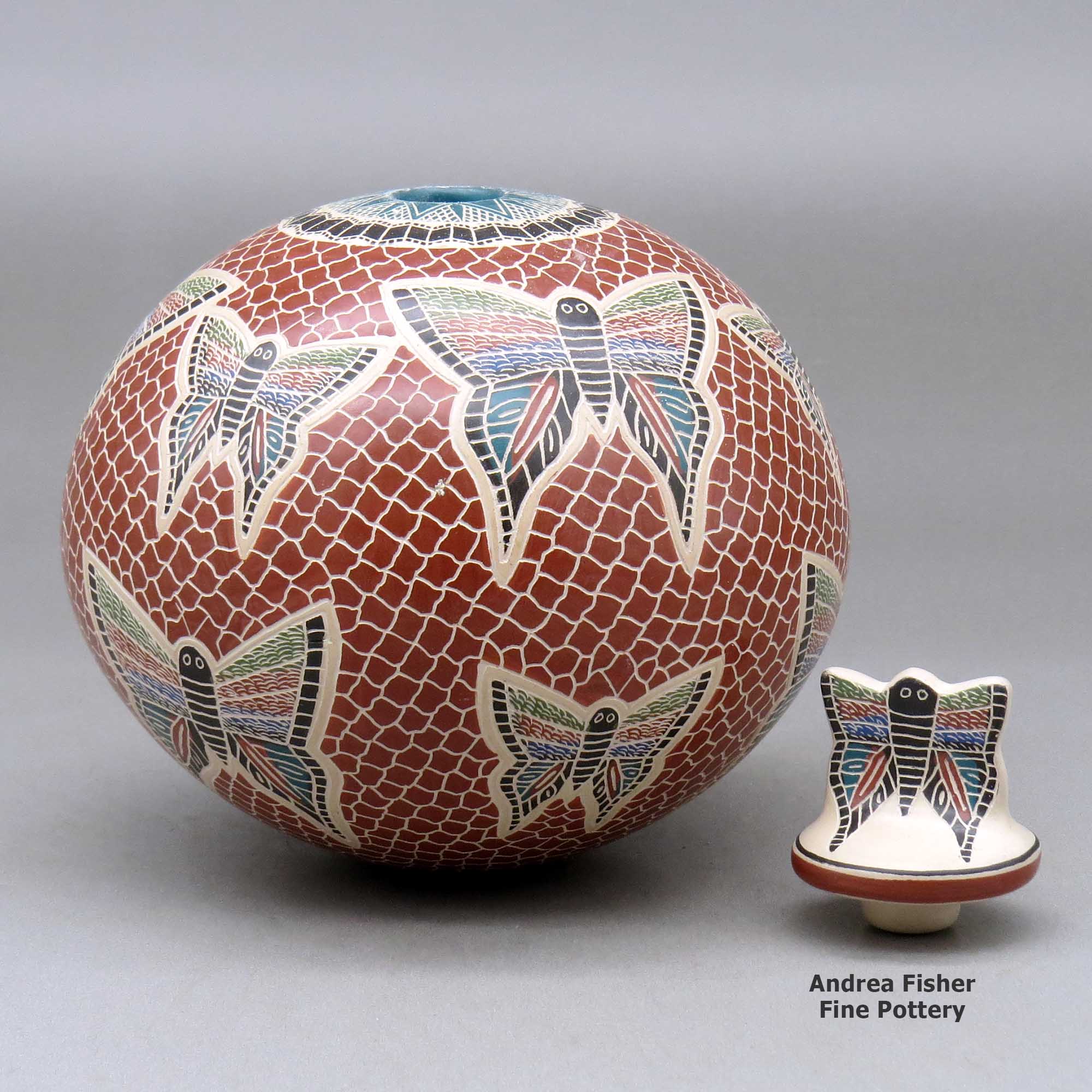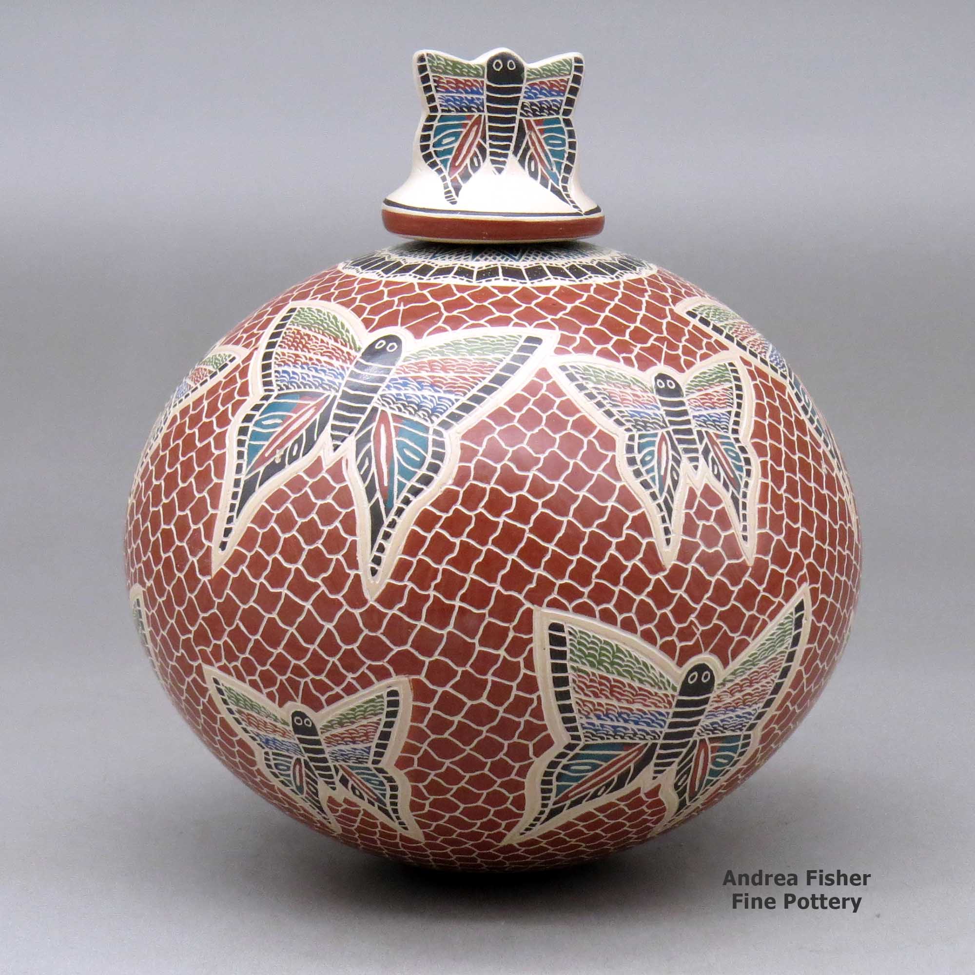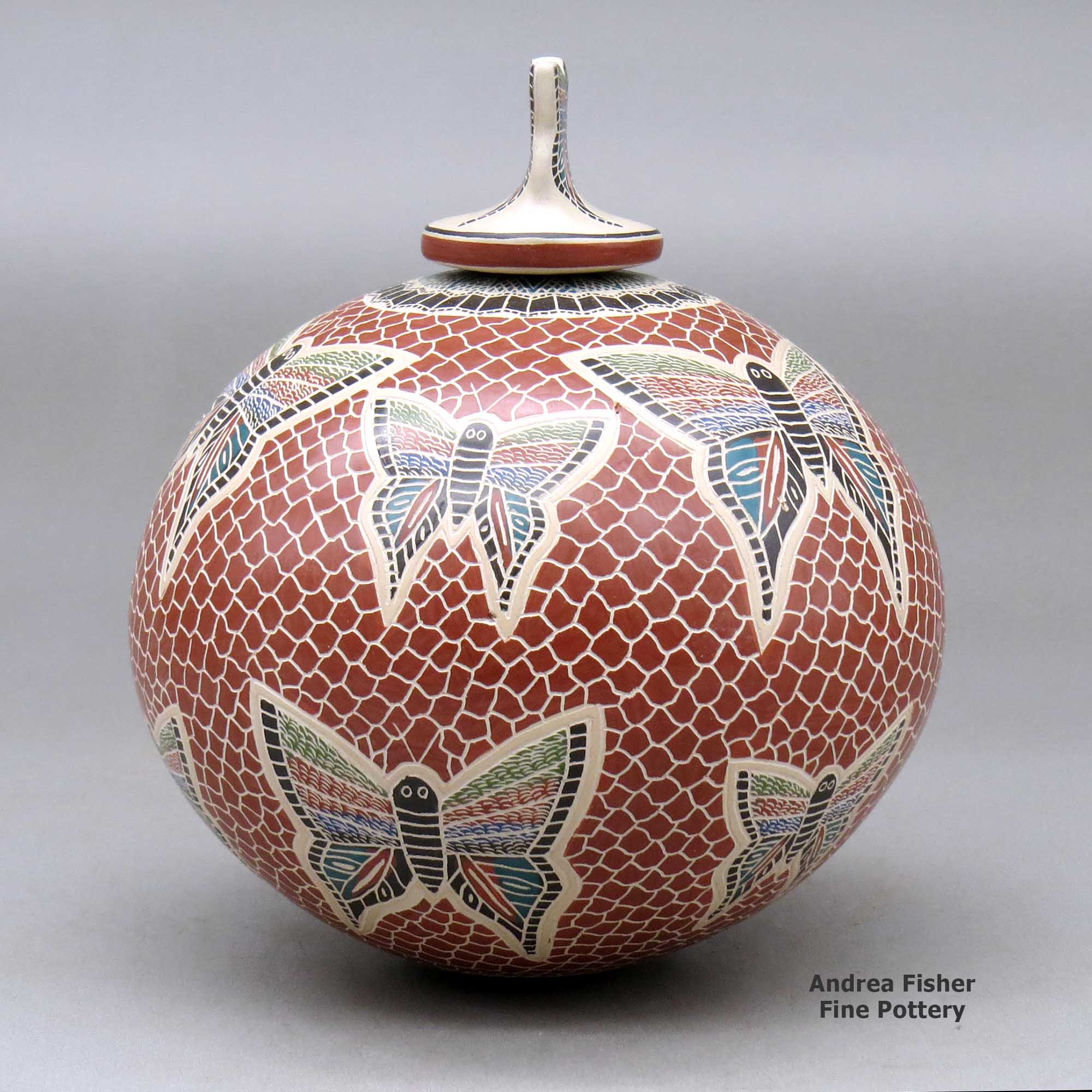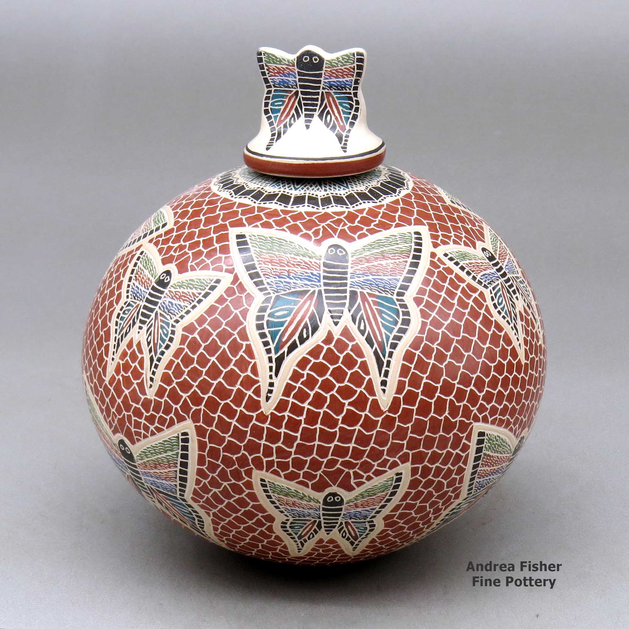 A polychrome jar decorated with a sgraffito and painted butterfly, mesh and geometric design, with a butterfly on the lid made by Oscar Ramirez of Mata Ortiz and Casas Grandes