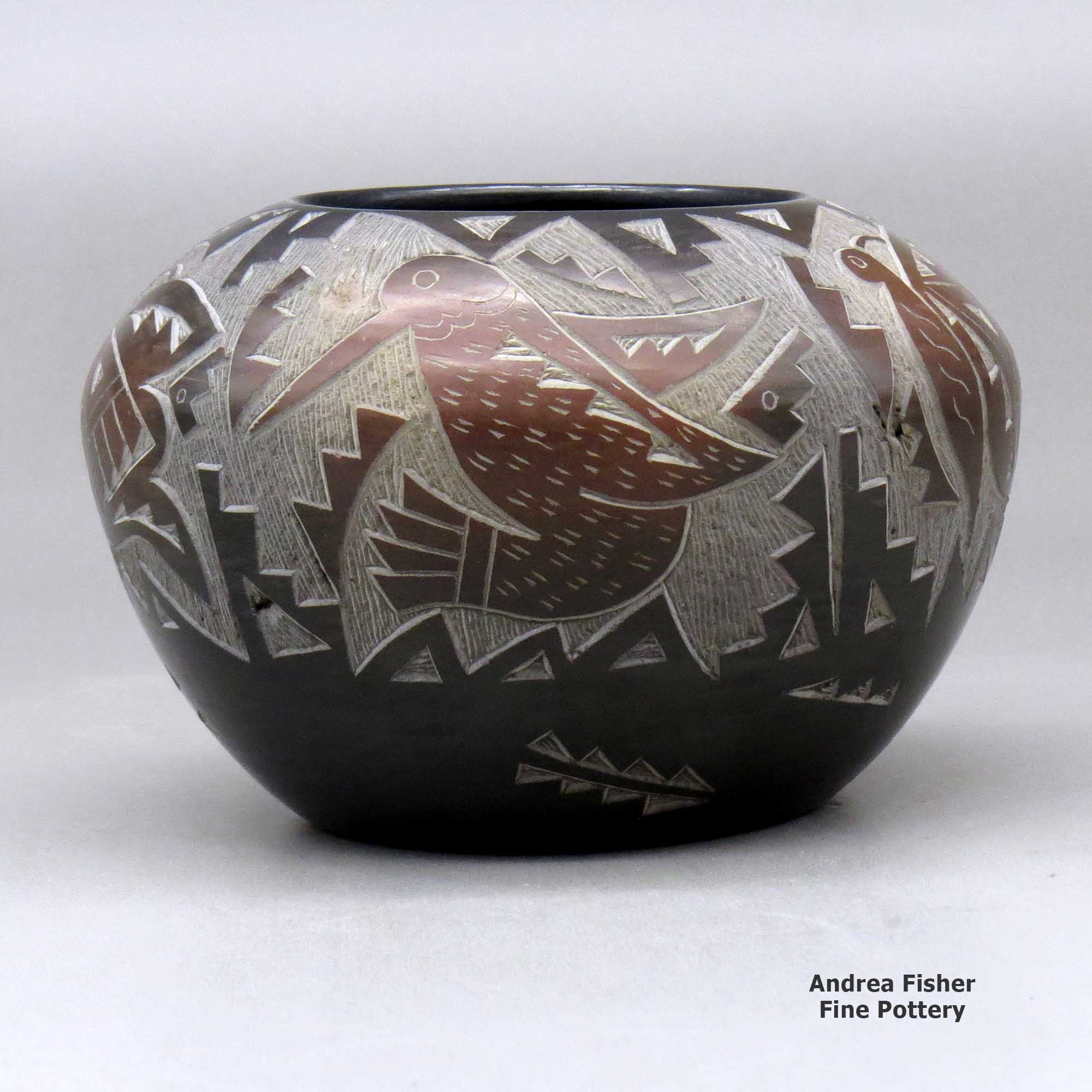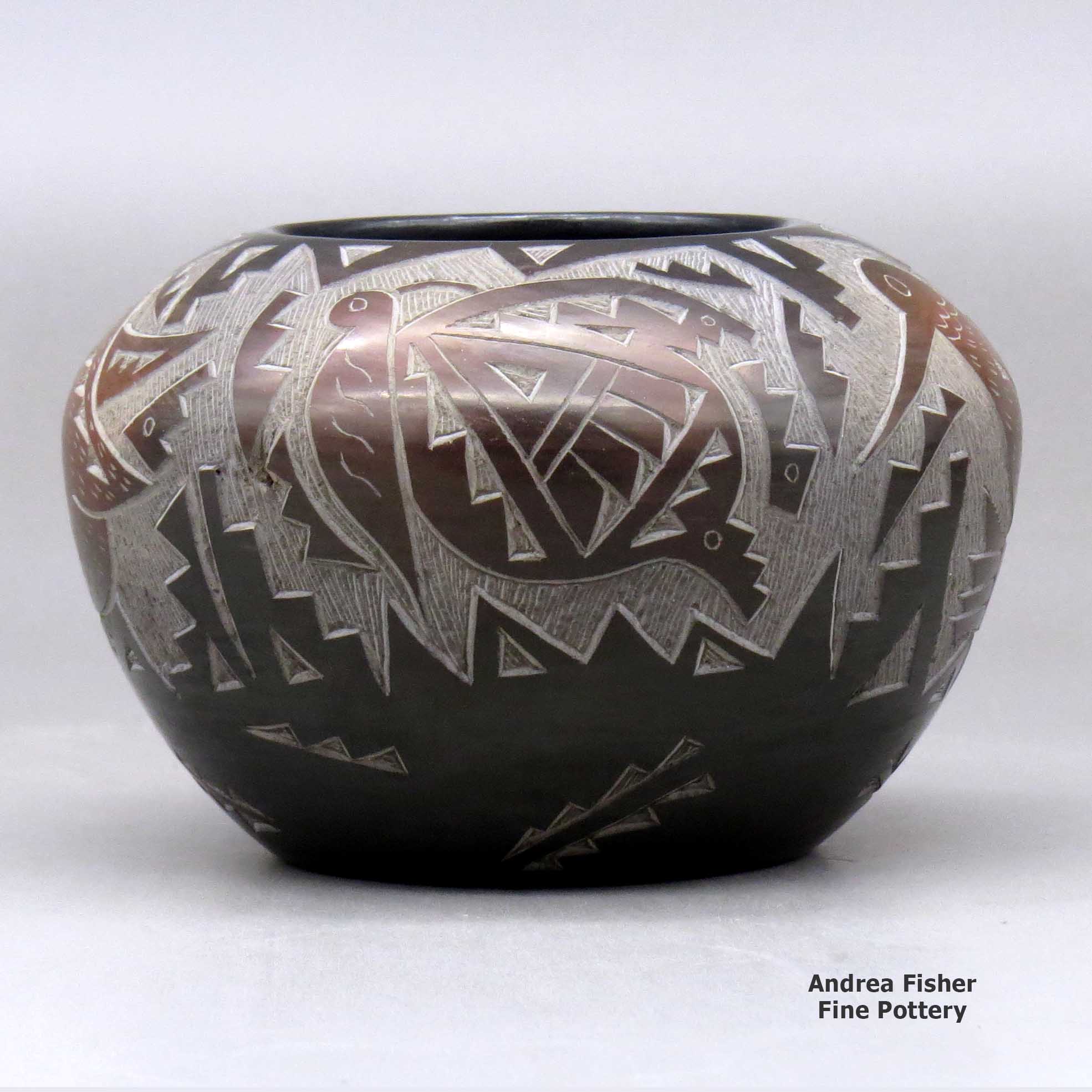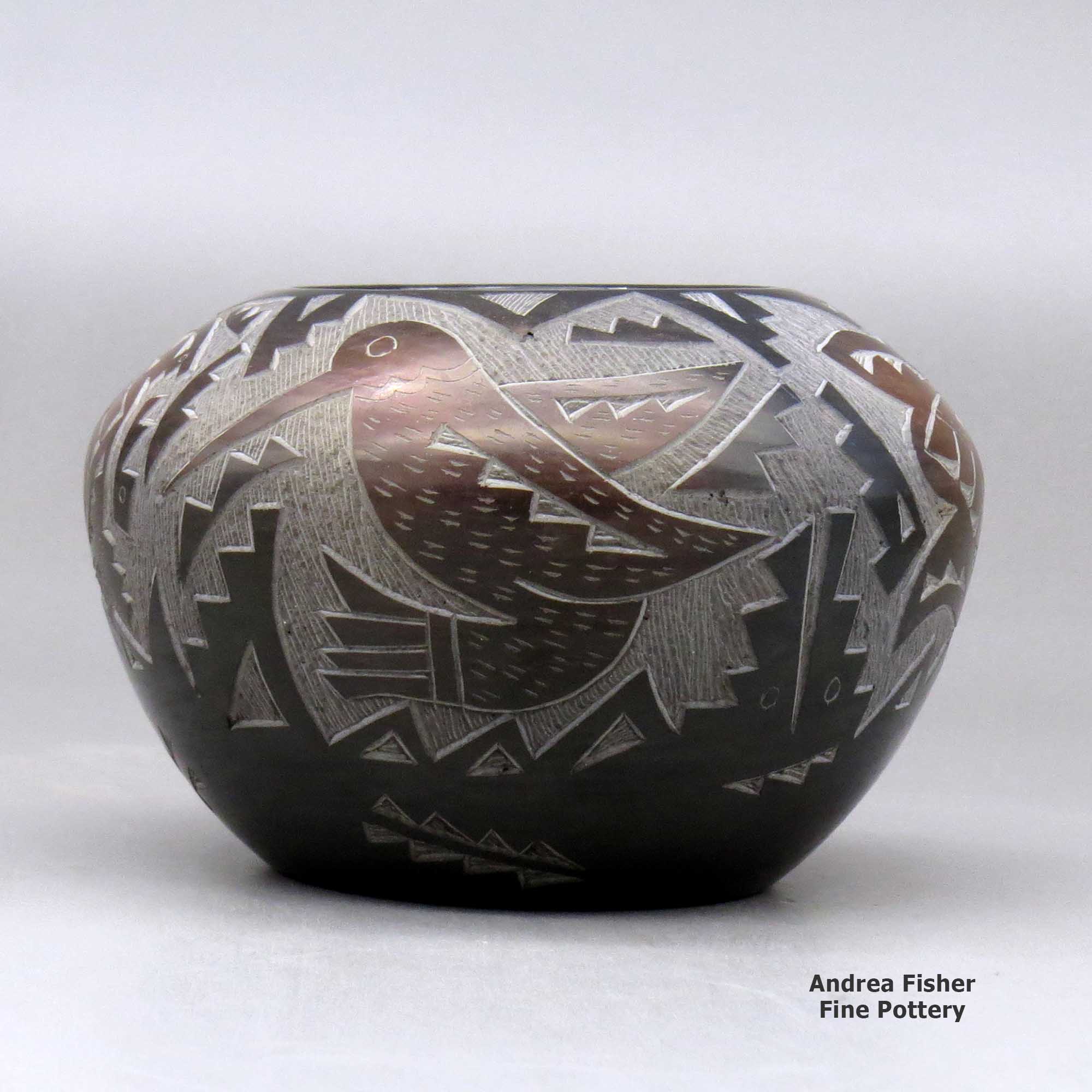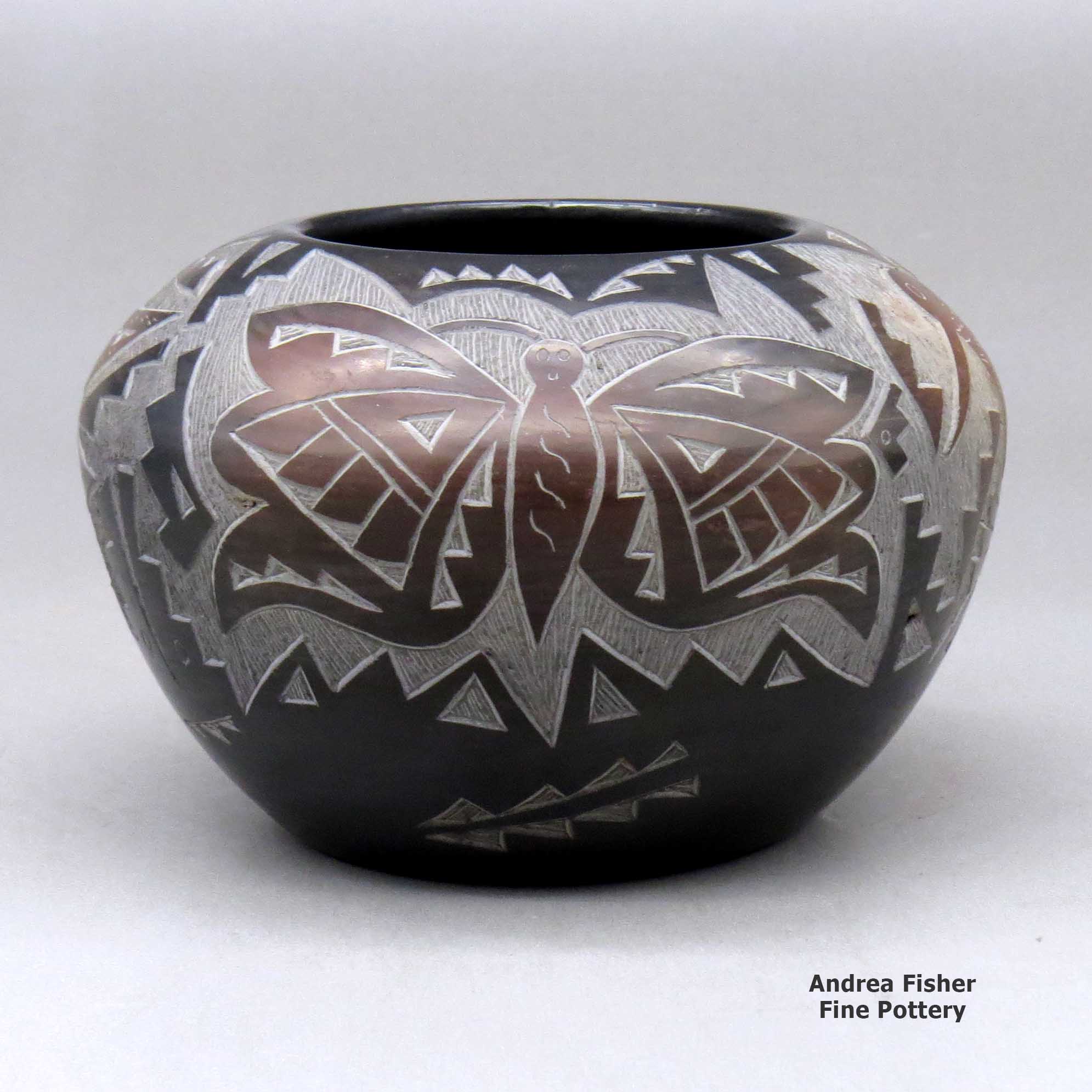 Candelaria tells us her favorite shapes to work with include miniature bowls and vases. The sgraffito (etched) style that she specializes in is accomplished after the “smothering” process that turns the pottery black. A figure such as a finely etched “avanyu” (water serpent) will surround the entire pot. Often kiva steps and cloud designs will complete the work. Other favored designs are butterflies and/or hummingbirds that are intricately carved on opposite sides of a piece. She also uses a special technique that highlights part of a pot by reheating a section of the pot and changing its color.