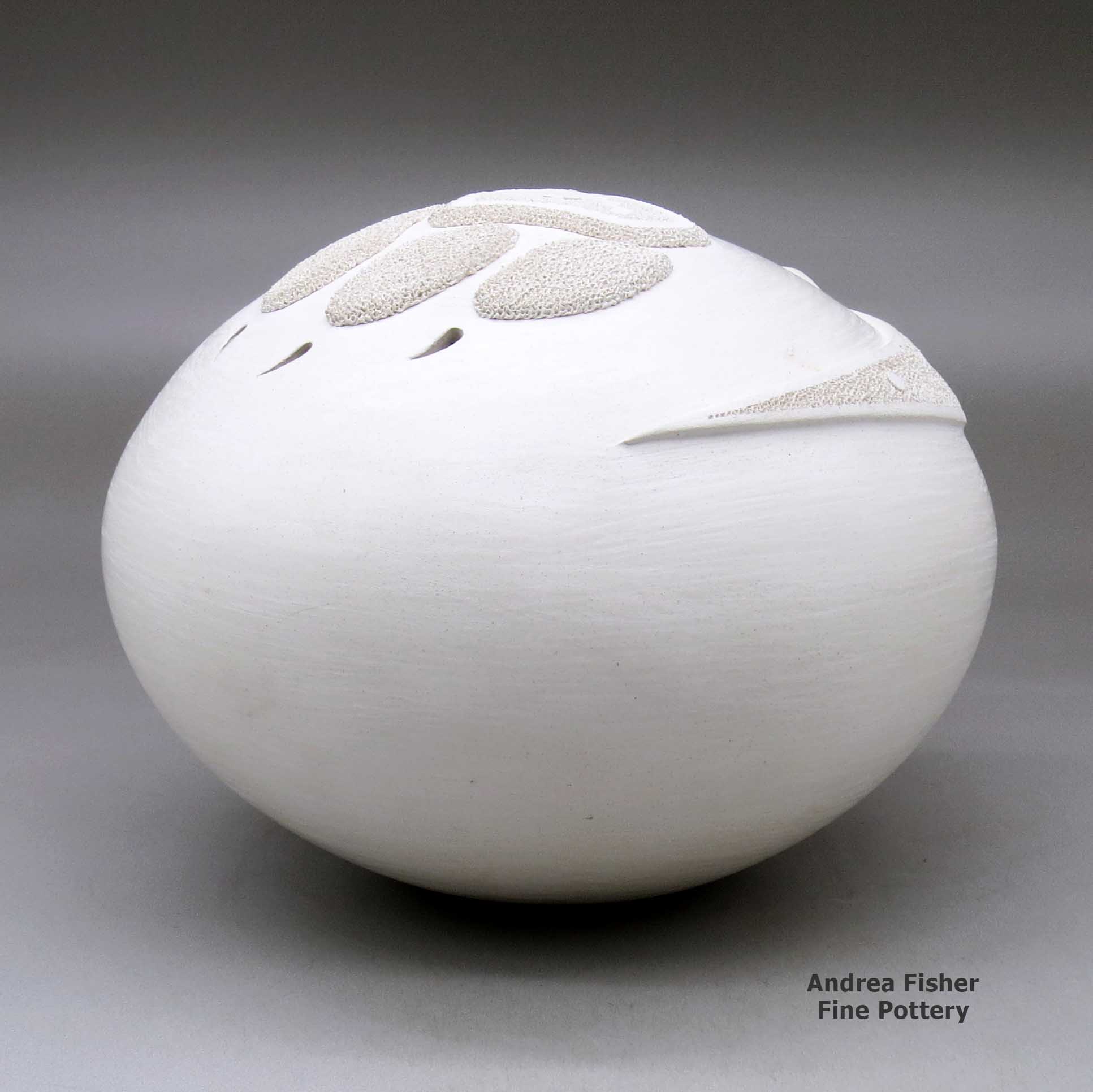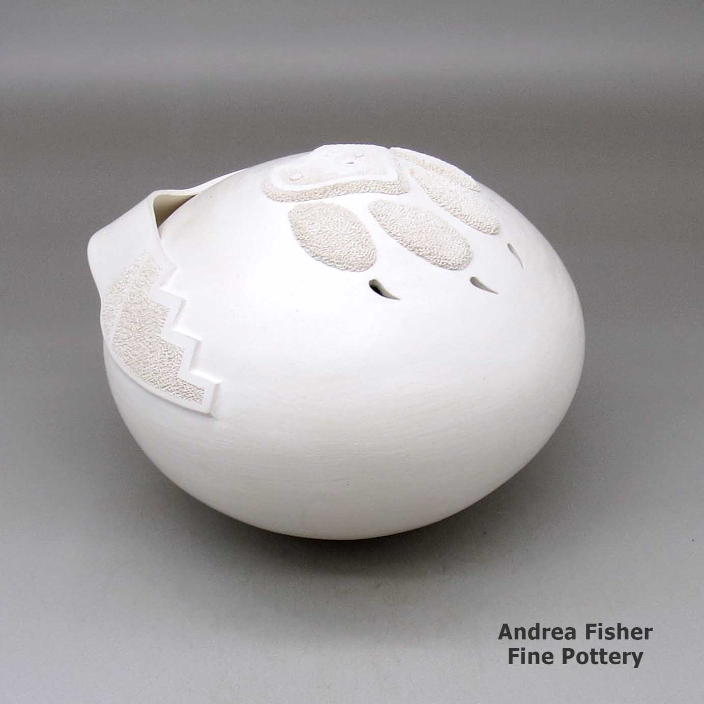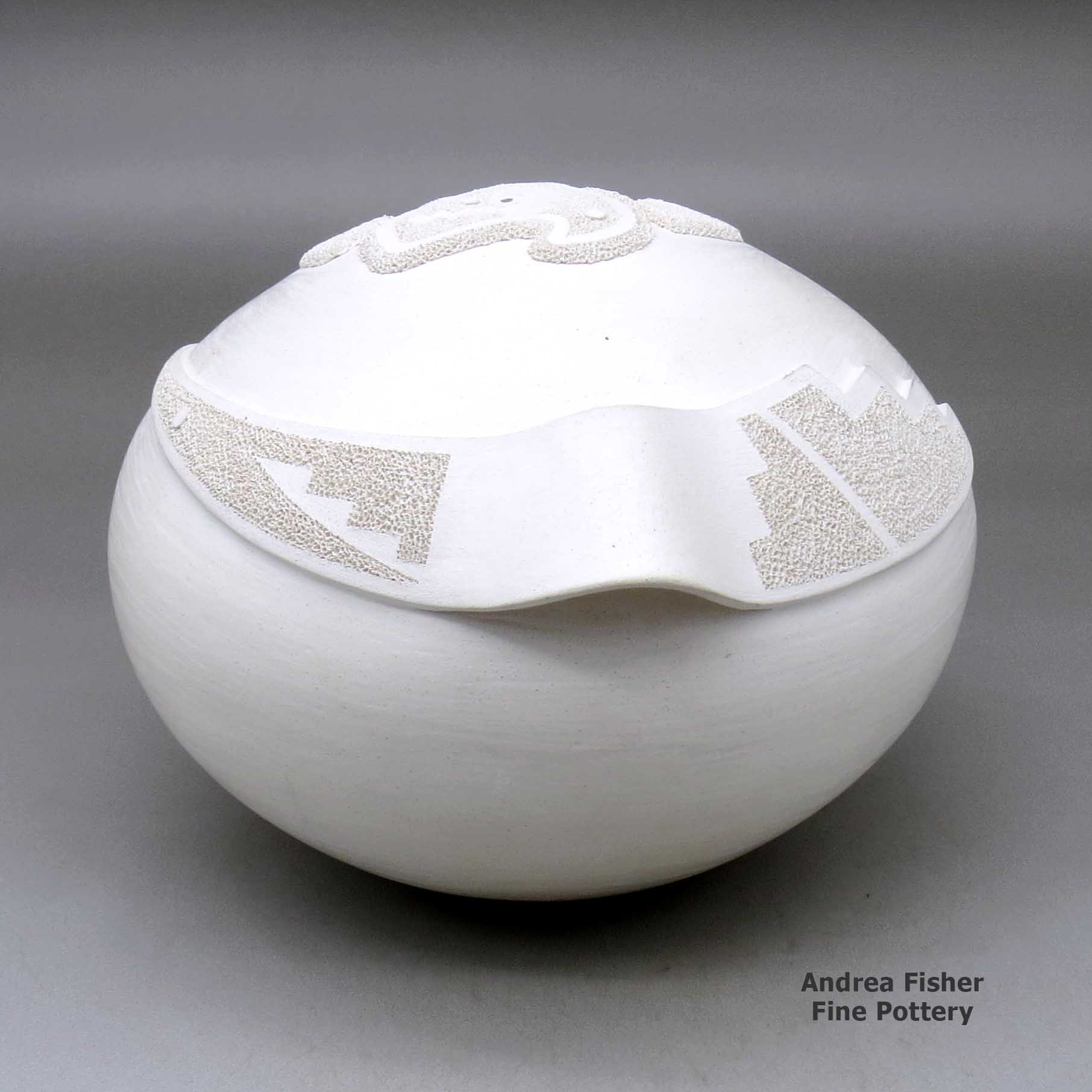 Wilfred often collaborated with his wife, Sandra, in making white jars with organic openings and carved cliff dwelling scenes. They also made white jars with appliqued ears of corn on them. On his own, Wilfred made oval vases with appliqué katsina faces.